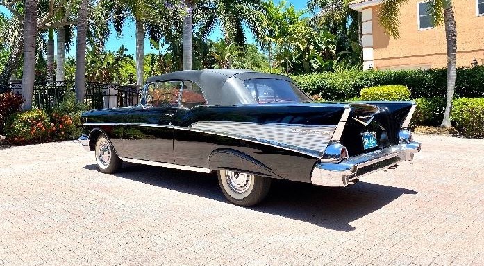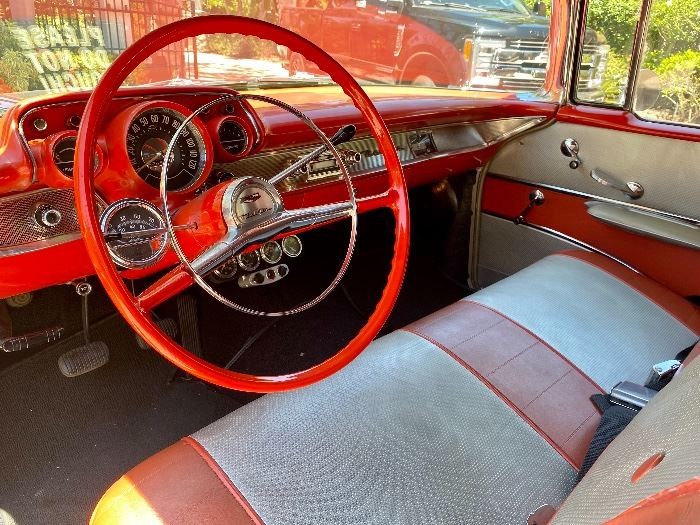 We’re told this is an all-original car, but it would be amazing to find that everything on the car is as it left the factory in 1957. The black convertible top looks brand new, the body is straight, and the paint shines up perfectly, and the interior looks as though it’s hardly been sat it. There is a small collection of aftermarket gauges added under the dashboard, so the owner was serious about keeping track of how various functions of the car were performing. The Bel Air wears fender skirts which you don’t see that often on these cars.