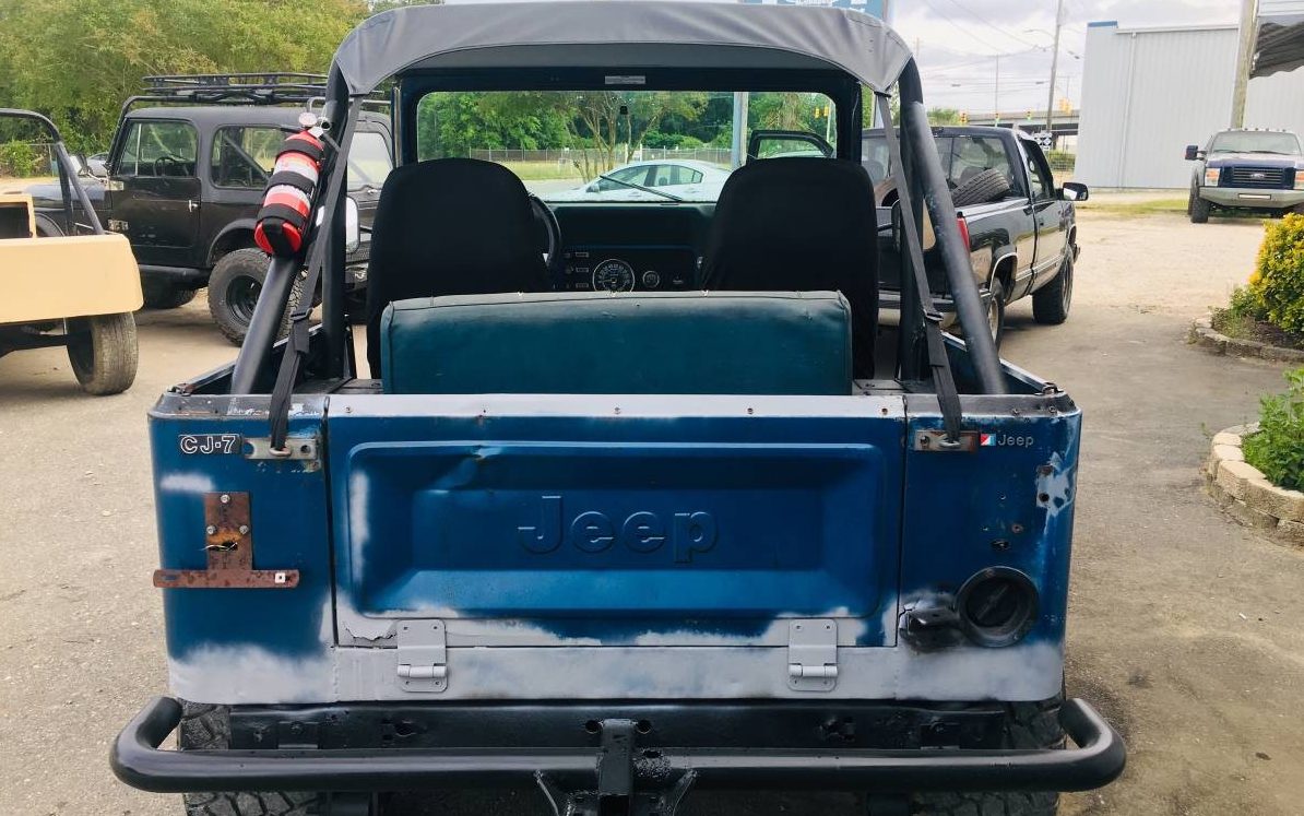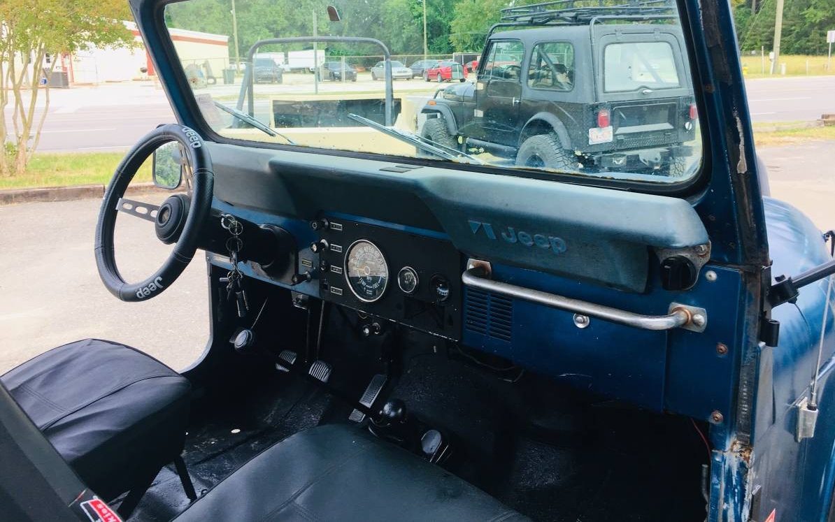 This particular CJ-7 is a “Levis” model meaning that it had a promotional tie-in with Levis, the denim based apparel company. The Levis theme was most pronounced via the seat upholstery which resembled either blue or tan denim even though it was of vinyl construction. There were other Levis’ interior touches too, as well as with the top fabric and a badge prominently displayed on either front fender above the “Jeep” name stamping. This CJ, unfortunately, has its original seats covered with aftermarket seat covers but it might be asking a bit much for original upholstery to last 43 years in an open-top vehicle. If you review all of the images, you can spy a shot of the back seat, adorned in its original Levis seat material 43 years after the fact. Beyond that, the interior is rough-and-ready, Jeep CJ all the way. Low on creature comforts but high on off-road and prepared for taxing outdoor adventures are how CJ’s were designed and this example is no exception. The floor appears to have had a rattle-can spruce-up but it looks sound and ready to be hosed down after a mud bog excursion. The dash instrumentation is sparse and it seems that an aftermarket gauge has been substituted for an original at the far right pod position. The original radio is missing with no replacement in place and I’d really like to know what that doorbell-button looking thing to the left of the steering column does.