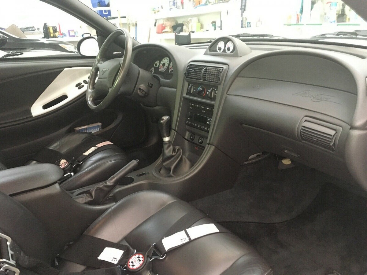 The interior is largely original but does feature five-point harnesses that replaced the original belts and a roll bar that makes the rear seat useless for people. If you’ve ever sat in the back of an SN95 or New Edge Mustang, you’ll know that’s no great loss! And with only 41,293 miles showing it’s understandable that the interior looks as nice as it does, even after 18 years!