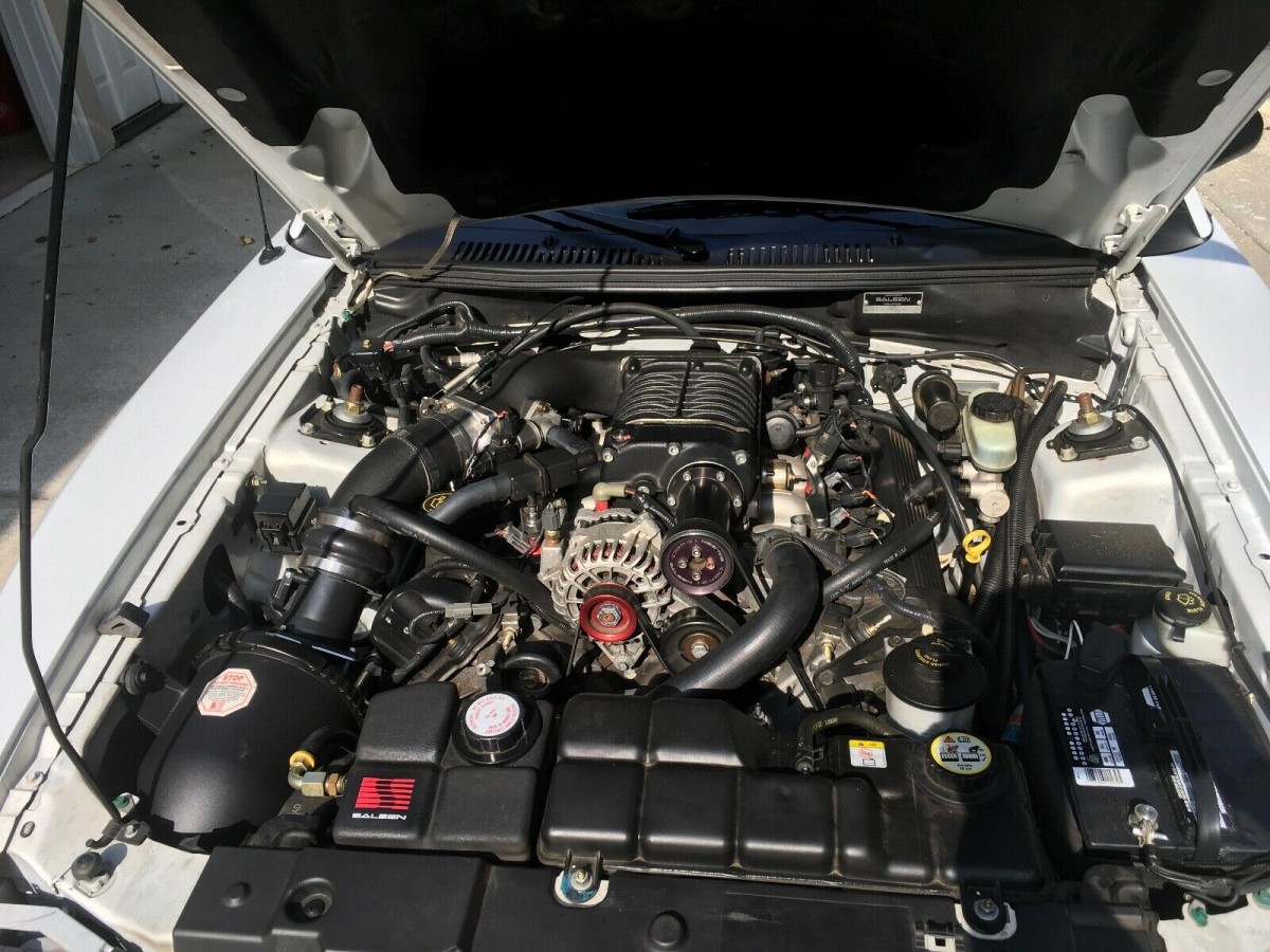 The monochrome white treatment has a lot of eye appeal and I’d even argue that the body modifications are tastefully done. You’re correct if you’ve deduced that I like this car. I happen to be racing a 1994 Mustang this weekend and this car would be a substantial upgrade, both in appearance and performance! This car was actually upgraded to 281SC specifications shortly after purchase with the addition of a Saleen supercharger along with headers, a roll bar, subframe connectors, and upgraded Brembo brakes.