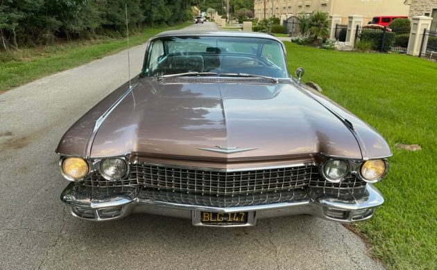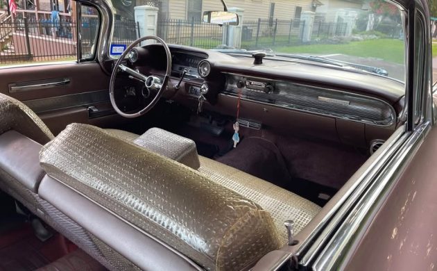 Under the long, long Persian Sand Iridescent painted hood rests a wrench as well as the same power plant offered in ’59: a 390-cubic-inch V8 that generated 325 horsepower when new. Mileage is listed at 37,000, but nothing is mentioned if that’s the original mileage or if it’s 137,000 miles on the clock. It’s paired with a smooth shifting Hydra-matic automatic transmission and the seller says, “the car runs, shifts and cruises down the freeway at 70 all day long. No leaks and it was just serviced.” This beautiful once-California Caddy was sent to us by super-spotter T.J. and is located in Conroe, Texas. It is listed for sale here on Facebook Marketplace for $75,000 (which seems pricey since Hagerty’s values a #1 Concourse condition ’60 Coupe DeVille at $72,500). I think “Negotiable Price” should be added to this impressive Caddy’s long list of options if it’s going to find a new home. What a head turner, though.