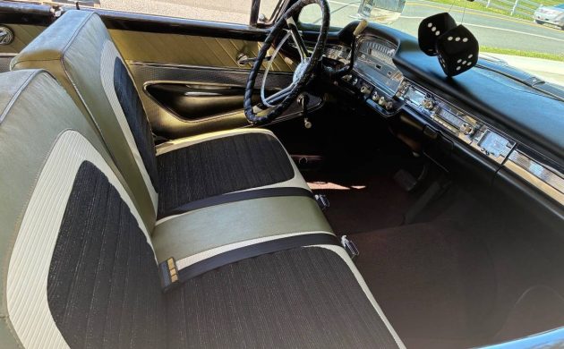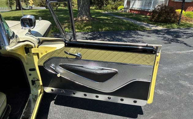 The late 50’s were a high-water mark for colorful, dazzling interiors, and this ’59 Skyliner is no exception. Even though it’s a “bread-and-buter” Ford, the marketing team advertised their Thunderbird-inspired cabins as “Luxury Lounge Interiors.” I’ll have to admit that this Skyliner looks more like a Mercury or a Lincoln inside with its tri-toned gold, black, and white seat fabrics, upscale patterned door panels, and black instrument panel with just enough chrome and bling to smartly compliment the rest of this inviting interior. It looks fantastic with minimal wear visible (but I’d ditch the black fuzzy dice).