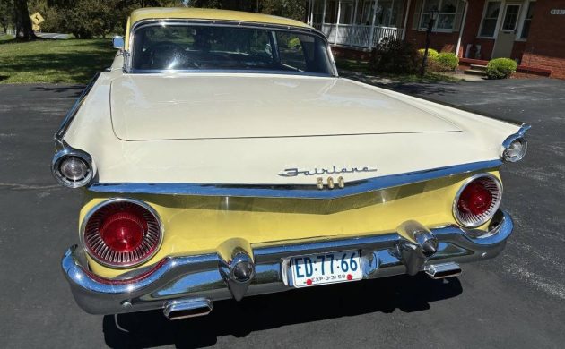 You are mostly correct about the Fairlane script. It should be noted that the rear script was the same on all ’59 Skyliners (Ford’s project Syrtis) and all Fairlanes. The main reason was the trunk lock (the middle 0) However, on the sides of the fins are where the early “Fairlane 500” script was changed. This reflects the corporate mid-year changeover when Ford deleted the Fairlane 500 hardtop (same roof as the ’59 Edsels) line and all became Galaxies.