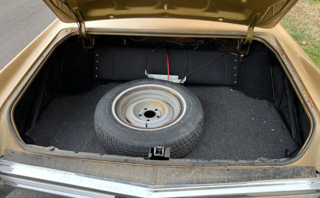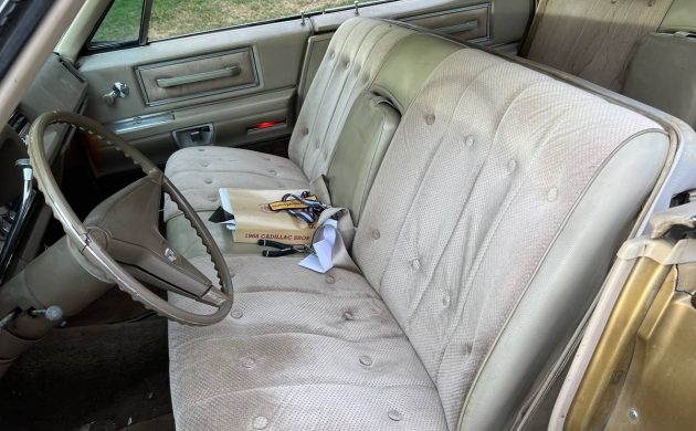 Cadillac, for years, consistently ranked in tenth or eleventh place in the domestic auto production race, and 1968 was no different. Coming in at eleventh place, Cadillac knocked out 230K units in ’68, and 164K were “DeVille” models with almost 10K manifesting themselves as the “Hardtop Sedan DeVille,” such as our subject. The finish, which looks like Topaz Gold Firemist, still shows well; it’s lost a bit of shine but is still thoroughly presentable. There are only two exterior images included in the listing, so a detailed assessment is not possible, but so far, so good. There’s no evidence of rust or crash damage, and this Caddy’s endless lines are nice and straight. Here’s the weird one, however, the roof of this four-door hardtop has been coated with cargo bedliner – you know, the stuff you spray into the bed of a pickup truck. The seller adds, “Bedliner roof, looks like vinyl but doesn’t deteriorate!” I’m wondering if this treatment is a replacement for a vinyl top or just an attempt at a faux version. Whatever the case, it shows well! One nice feature of these sixties Cadillac models is the mob trunk; you can stuff at least three bodies in that cavernous compartment.