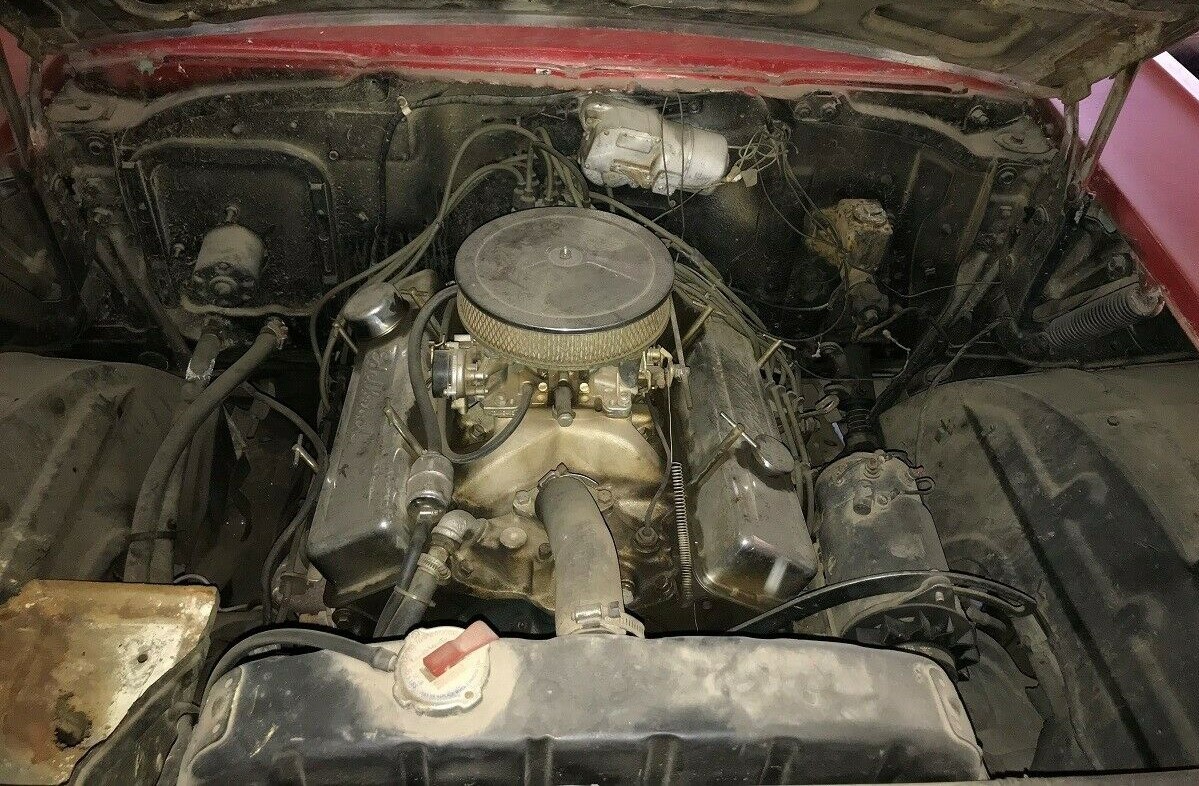 We don’t know what motor was in the car when it was built, and the fender badges say “327” but that engine wouldn’t appear for another five years. Instead, there’s a 350 under the hood now of unknown vintage, though it looks like it may have been tweaked. The transmission is a floor-shifted manual, but we don’t know if it has three or four forward gears.