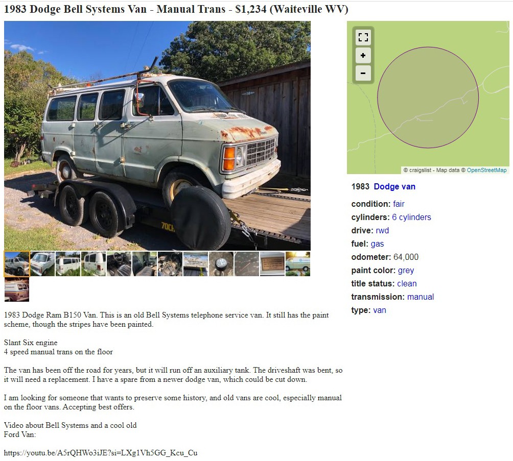 Ma Bell. It’s a term that most people under 40 don’t have a clue about. Most younger folks have probably never heard of the Bell System or anything related to the pre-AT&T era because they weren’t even alive in 1984 when the juggernaut Bell System broke up and evolved into AT&T and the Baby Bells. This 1983 Dodge B150 Ram Van is a former Bell System van, and it’s posted here on craigslist in Waiteville, West Virginia, and they’re asking… well, they just “accepting best offers.” Here is the original listing, and thanks to Mitchell G. for the tip!