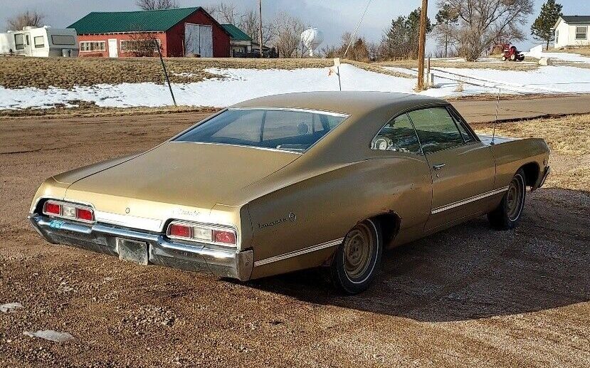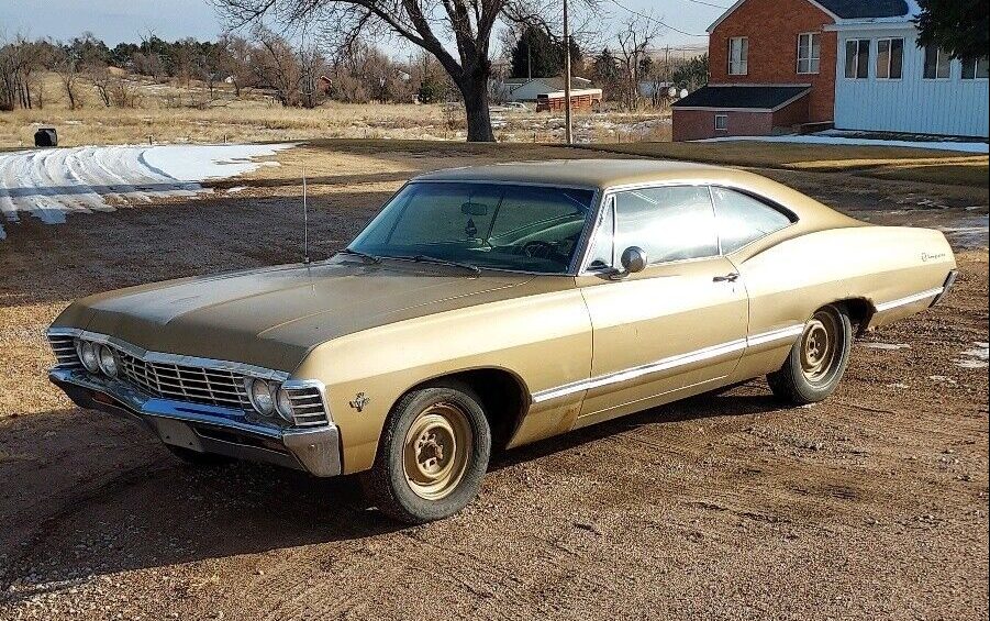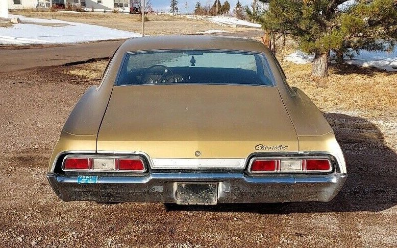 Had a ’67 same color combo, Granada Gold Black interior. Mine was a 283 Powerglide Impala. Did the bodywork myself (lots of bondo) And had it sprayed for $100 bucks. Looked good for about a year. Fond memories.