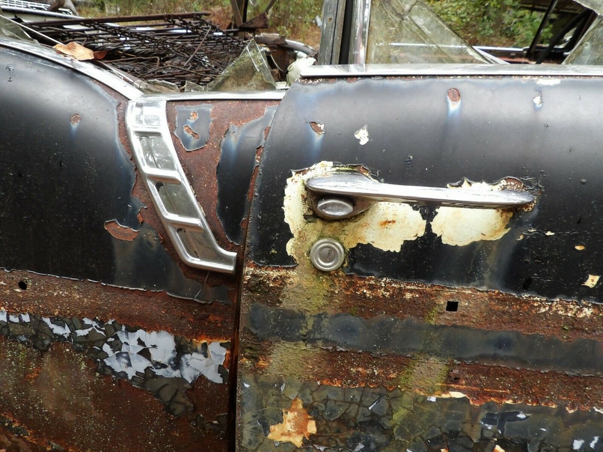There are hundreds of cars like this in old time junkyards , they probably came in after 10 years of road use , then for the first few years it got picked clean of its useable parts, and then just sat in all sorts of weather for 50 or so years . I used to walk around some of these yards and take pictures in the 1980s to early 90s , sadly many yards were crushed out when the price of steel went crazy and/or the owners passed away .