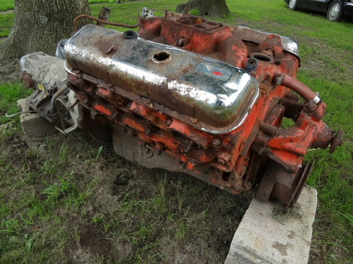 The “JK” engine code is a 325 HP 396 with a TH-400. As you said, not particularly rare or valuable, especially with a spun rod bearing and shown sitting on the ground with the intake and valve covers open to the elements.