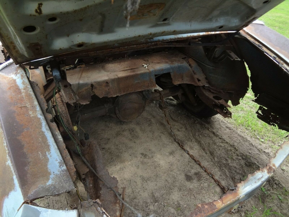 If the body and frame are this bad, it’s hard to believe that there is any integrity to the axle housing, trans pan or engine oil pan, yielding more rusty scrap. Do everyone a favor, dig a big hole, drop it in and let it peacefully recycle itself back into the earth.