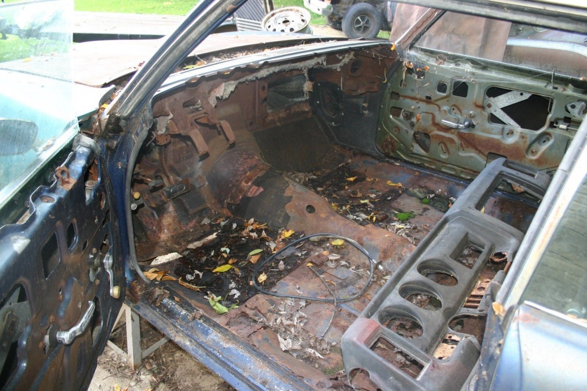 So let’s talk about the state of the interior….there is none. It’s pretty bare in there, but there are two positives that can be gleaned from the information provided by the owner. The first is that all of the glass is present and appears to be in good condition. The second is that with the advanced rot and the lack of interior trim, this poor GTO will be quite light to tow.