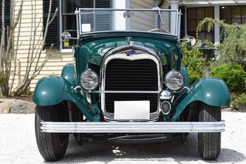 She sure is perty….I’d put factory louvered hood sides on it though to mask that non-Ford power plant long enough to drop a Henry engine into it, as well as the correct headlamps and support. Might even go so far as painting those rocker covers flat black and putting “weed block” screen inside of the hood sides. Love the color, rake, Bigs and Littles with wide whites.