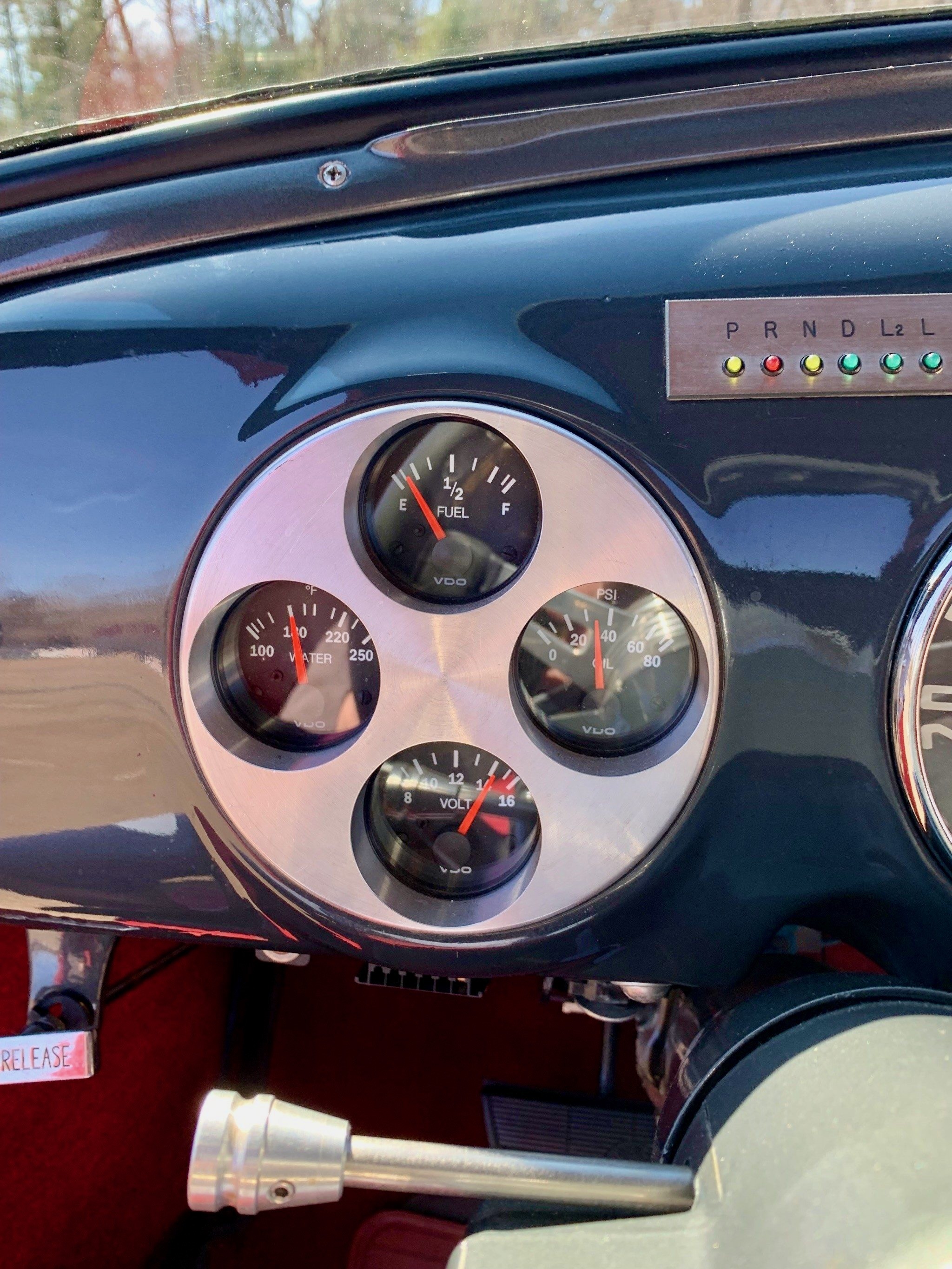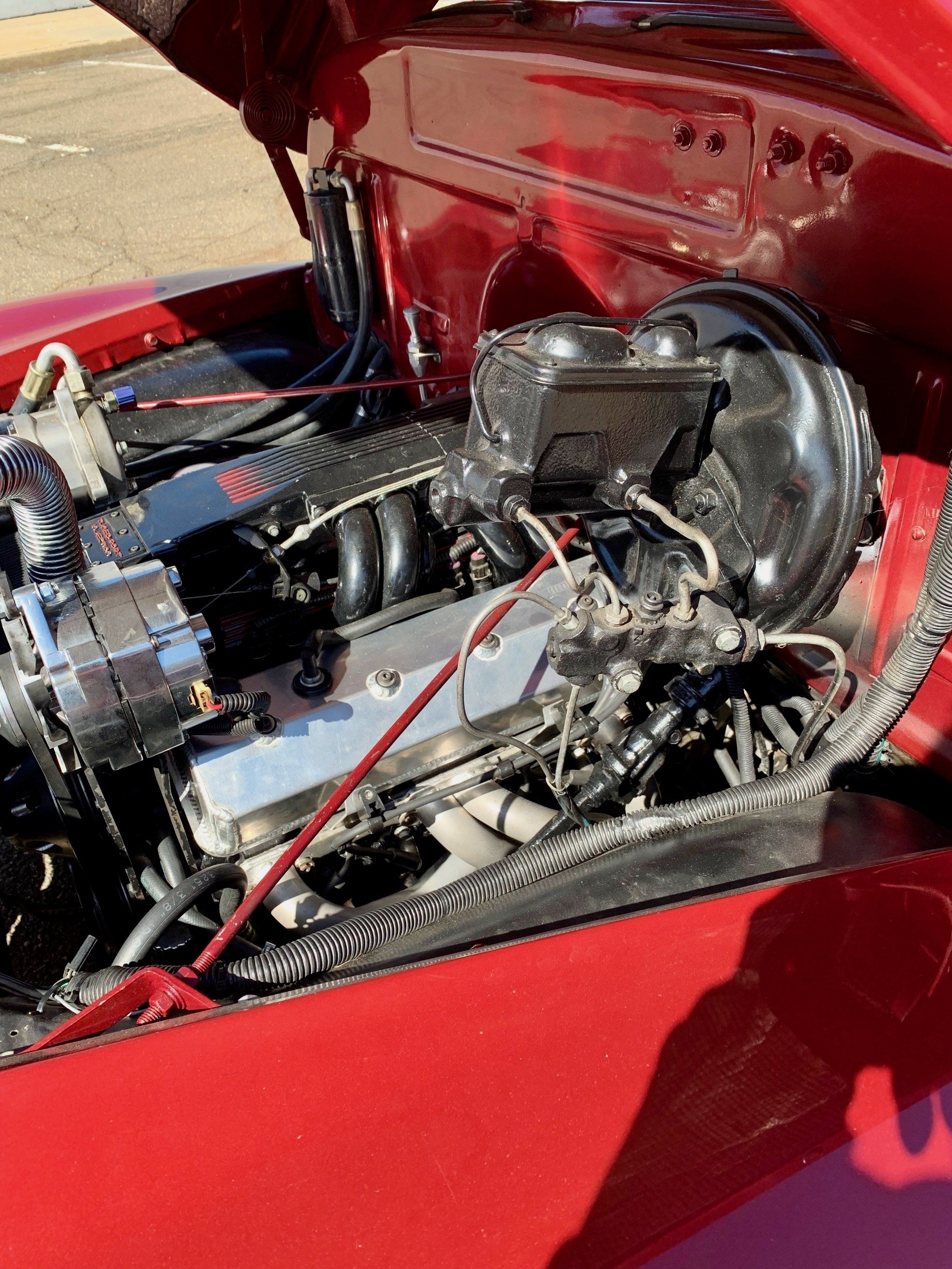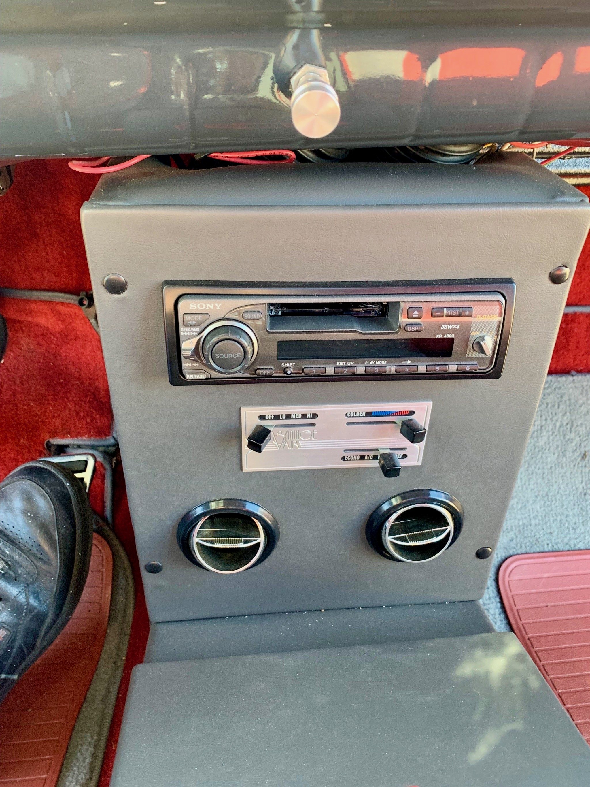 While the original interior is fine, you can’t complain about having a collapsible steering column with tilt or bucket seats. The original steel dash was retained during the build but has been equipped with some aluminum components and additional gauges. It looks nicely done, although we would try to find something to cover the exposed wiring on the steering column. The center console houses a stereo and the controls for the air conditioning system. Having A/C is a huge plus if you plan on driving it much. The only area the seller notes as needing attention is the headliner.