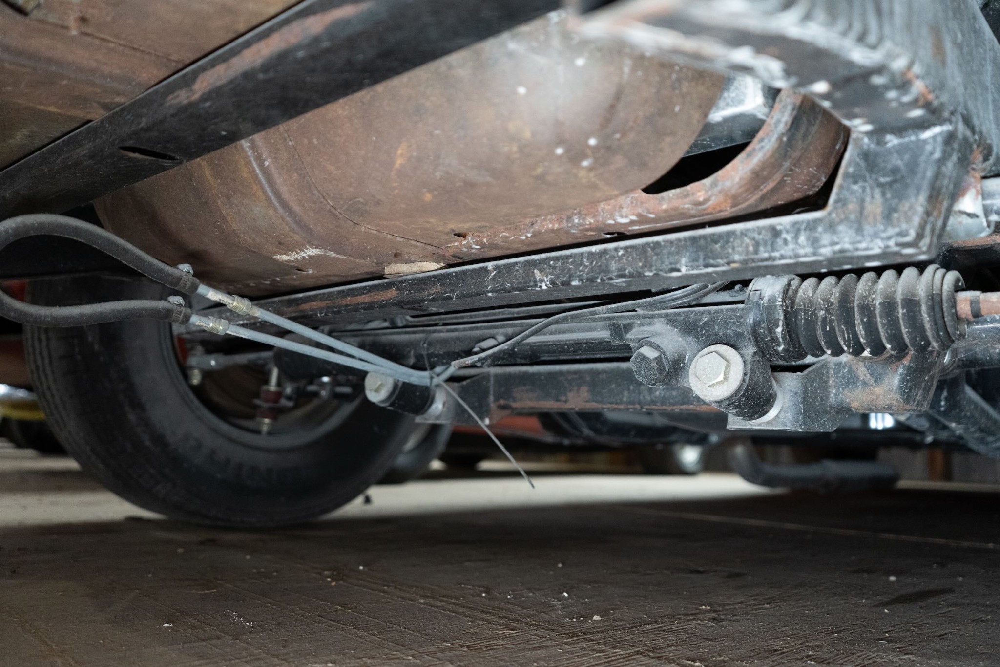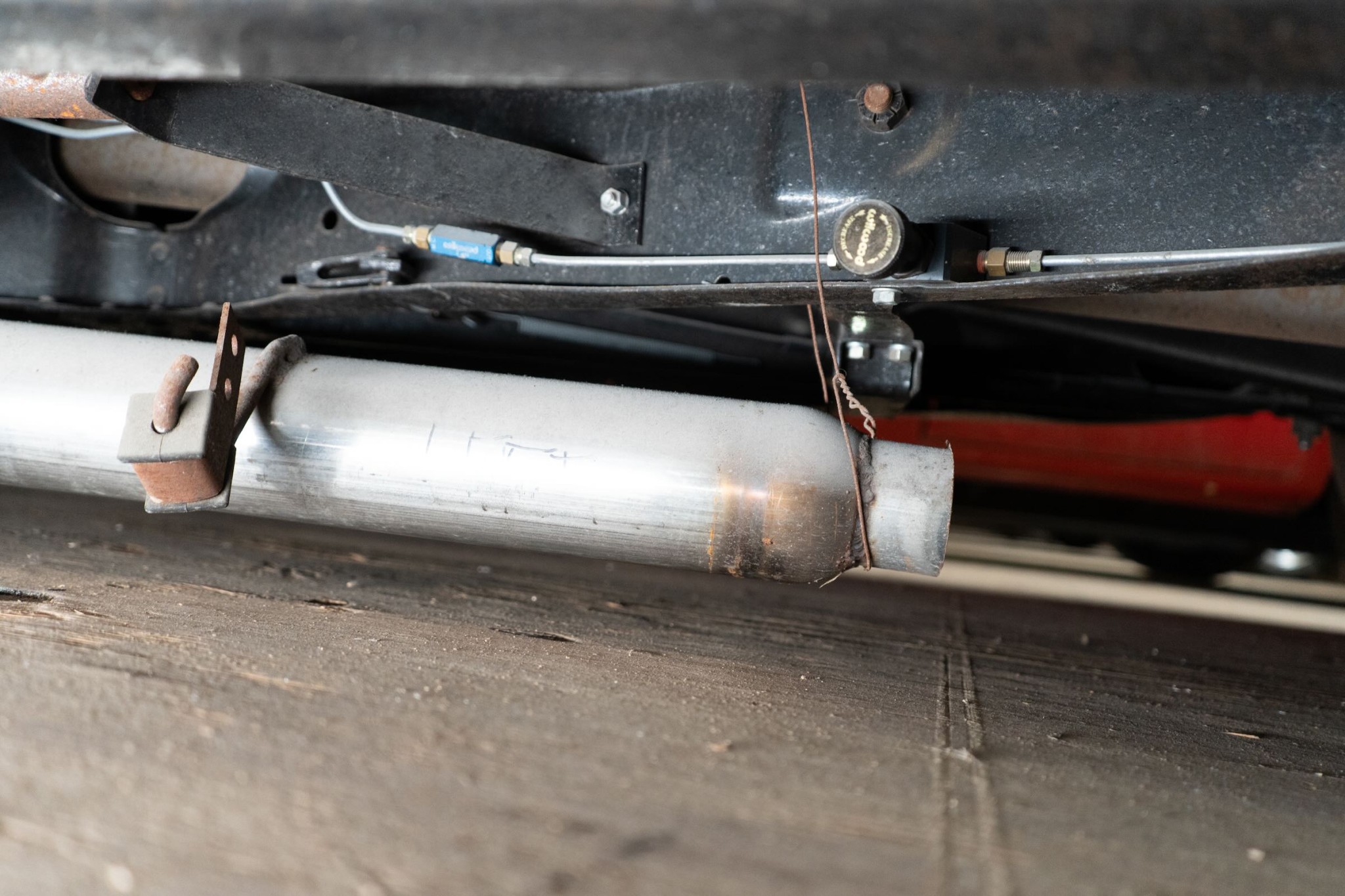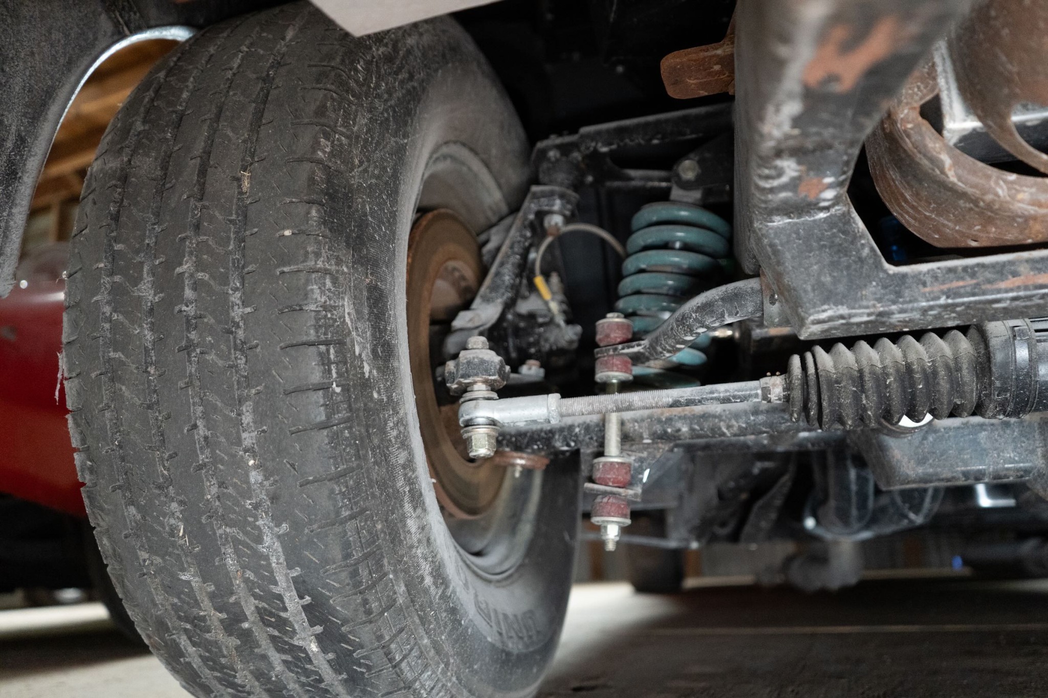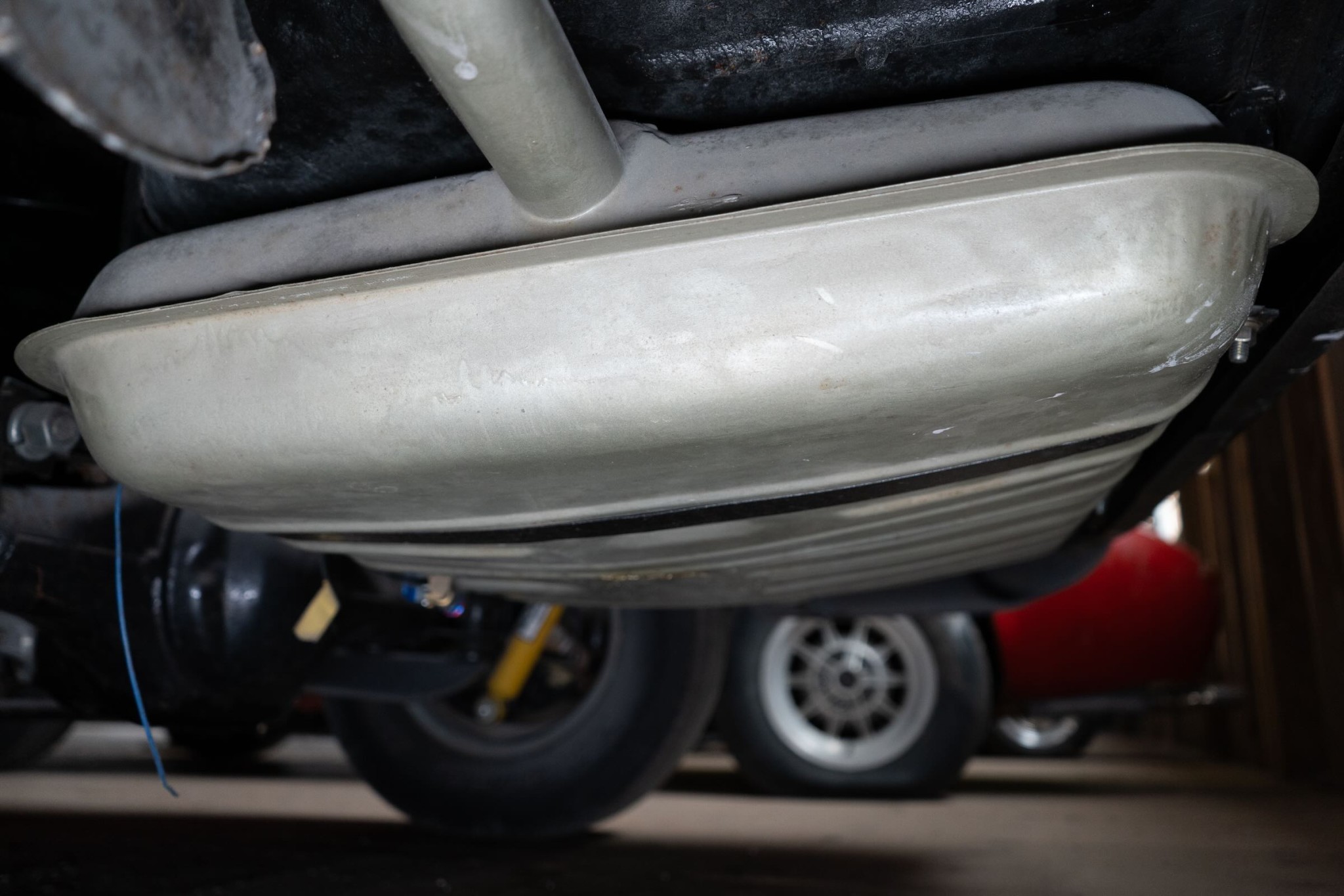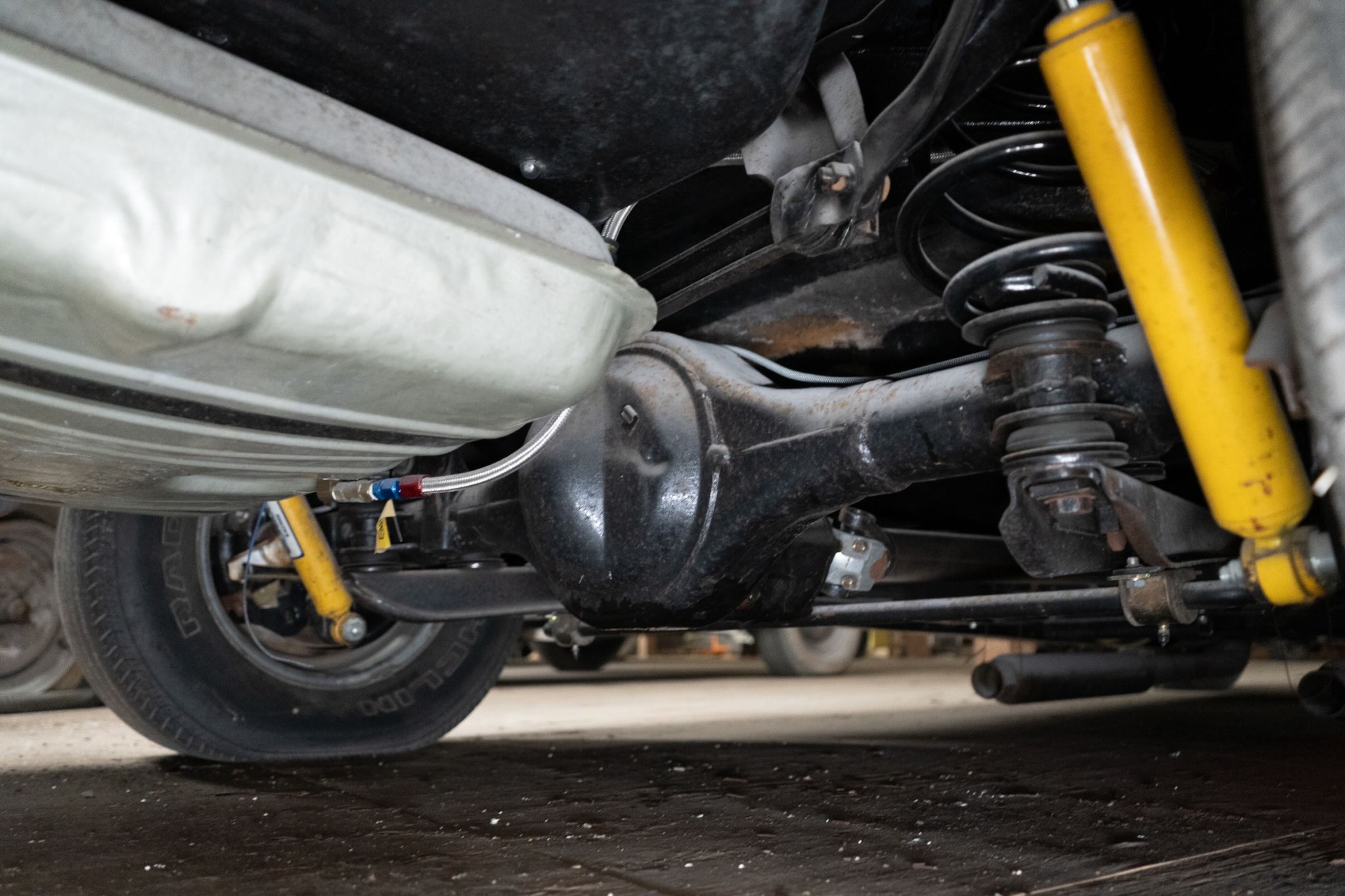 We do know that the chassis and suspension have been upgraded with rack-and-pinion steering, coil-overs, and front disc brakes. A power brake booster and appropriate master cylinder are located under the floor, roughly where you would have found the originals.
