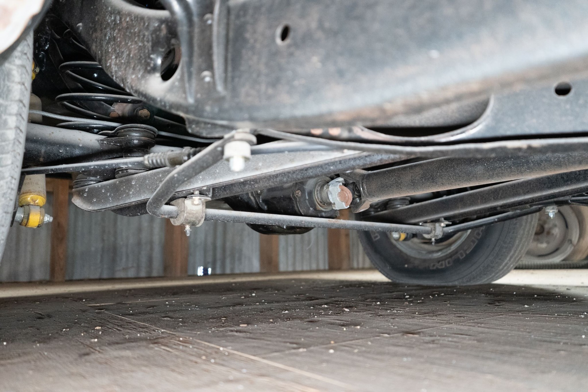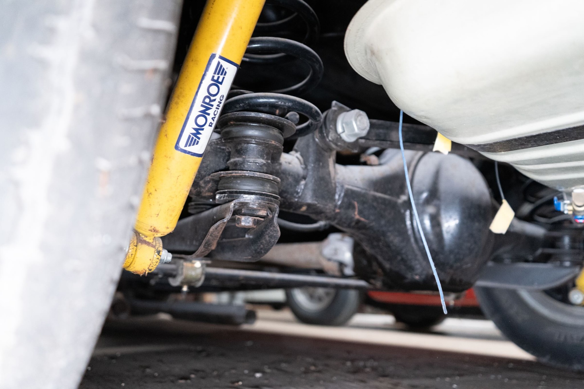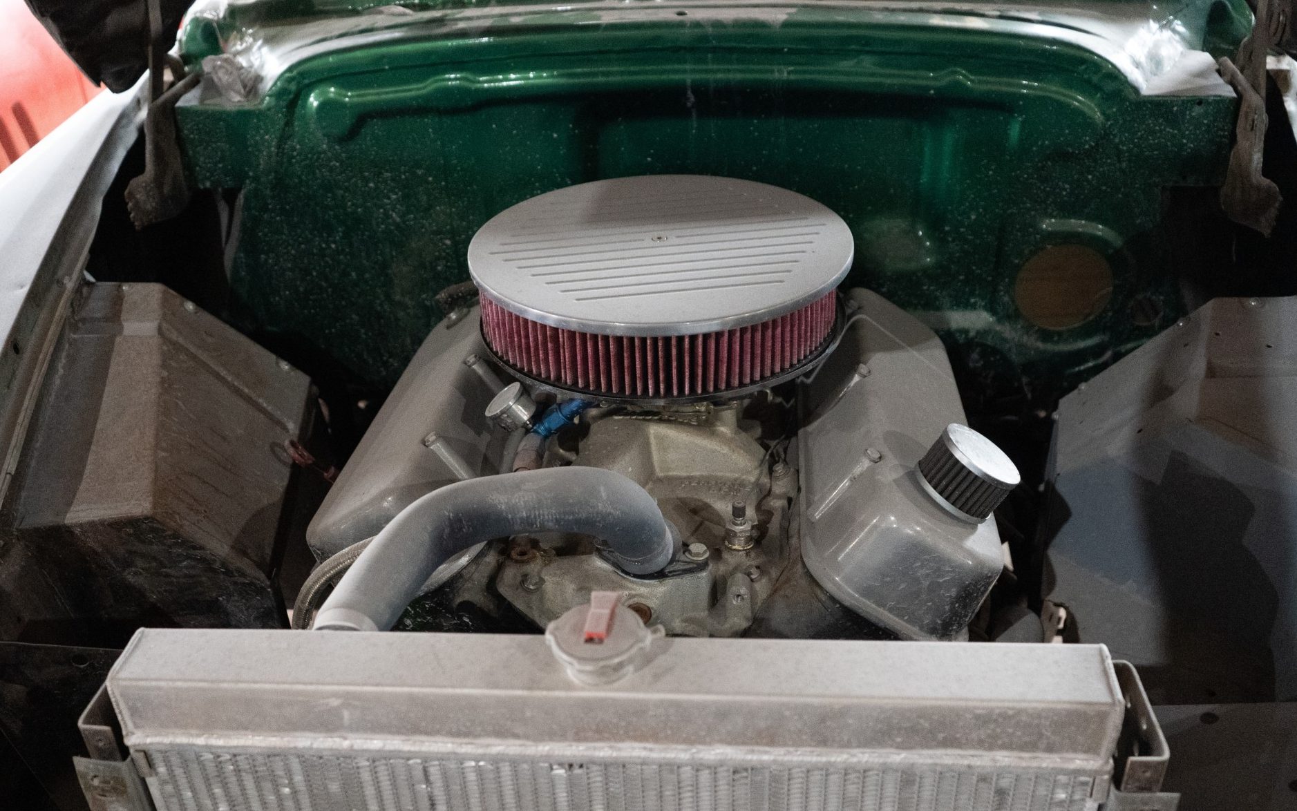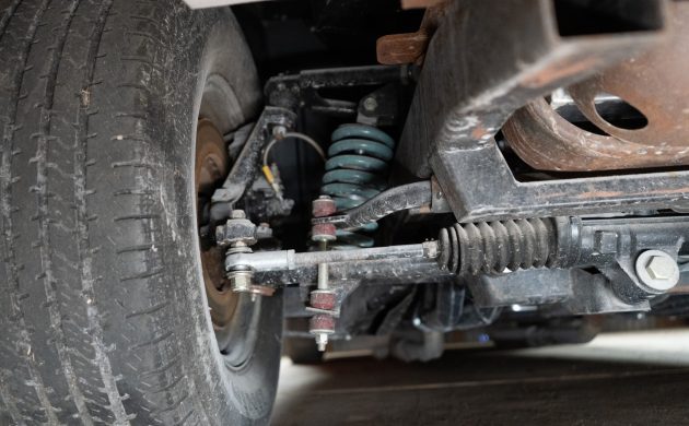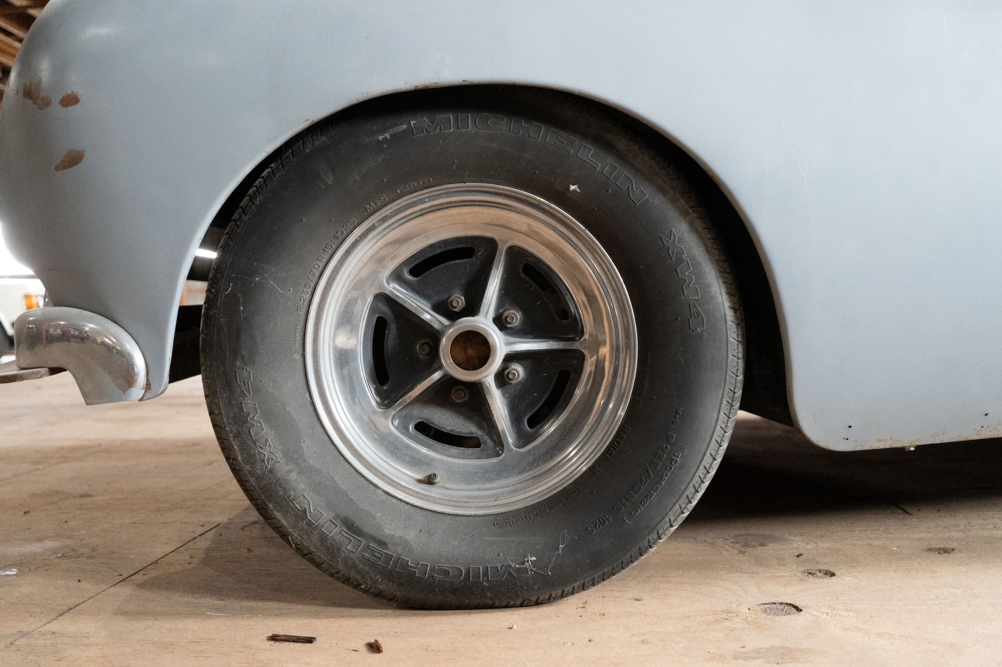 We do know that the chassis and suspension have been upgraded with rack-and-pinion steering, coil-overs, and front disc brakes. A power brake booster and appropriate master cylinder are located under the floor, roughly where you would have found the originals.