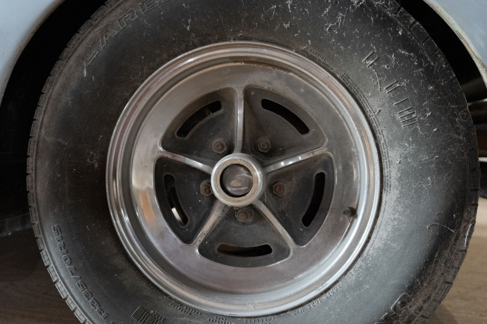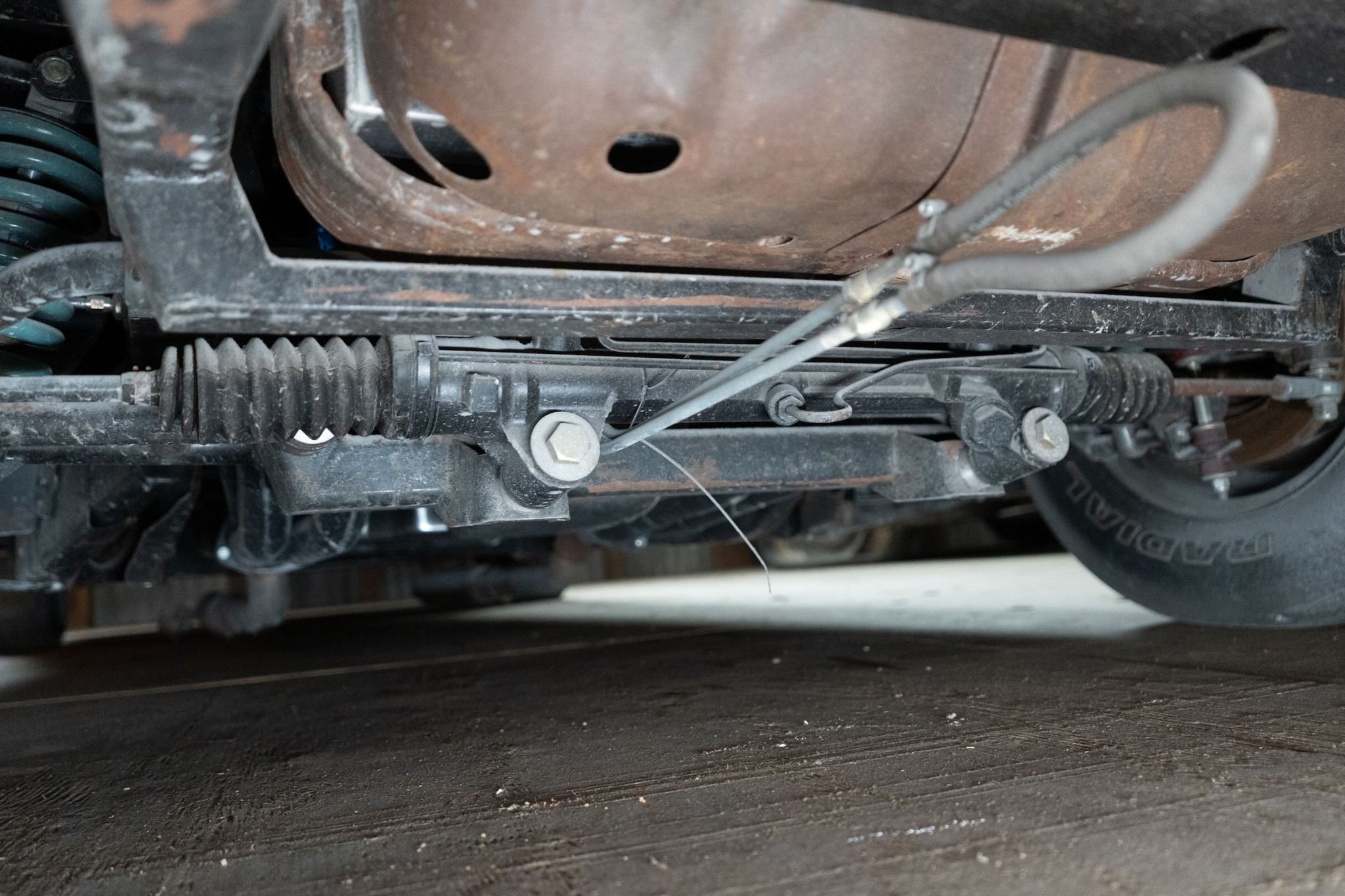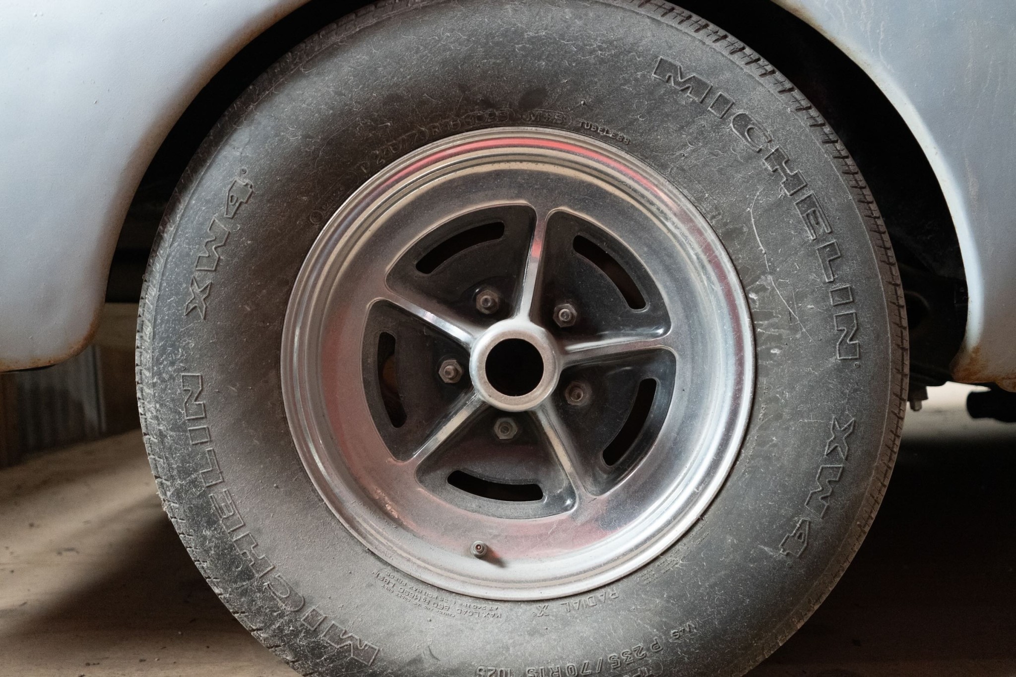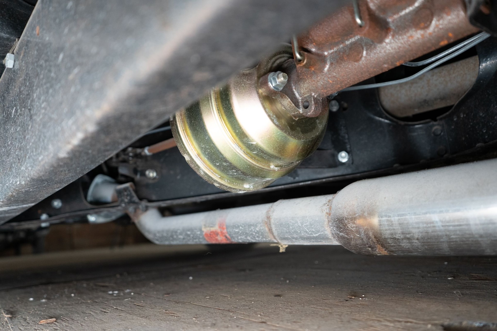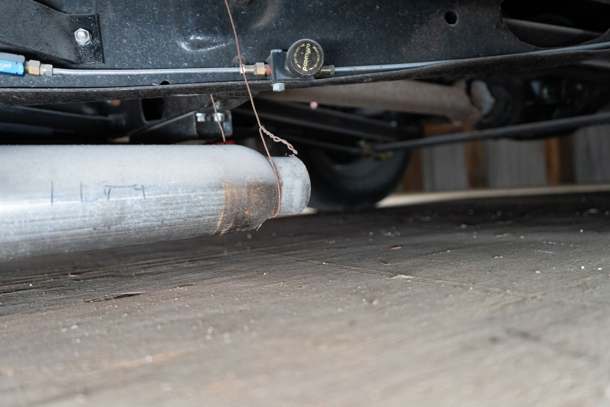 We do know that the chassis and suspension have been upgraded with rack-and-pinion steering, coil-overs, and front disc brakes. A power brake booster and appropriate master cylinder are located under the floor, roughly where you would have found the originals.
