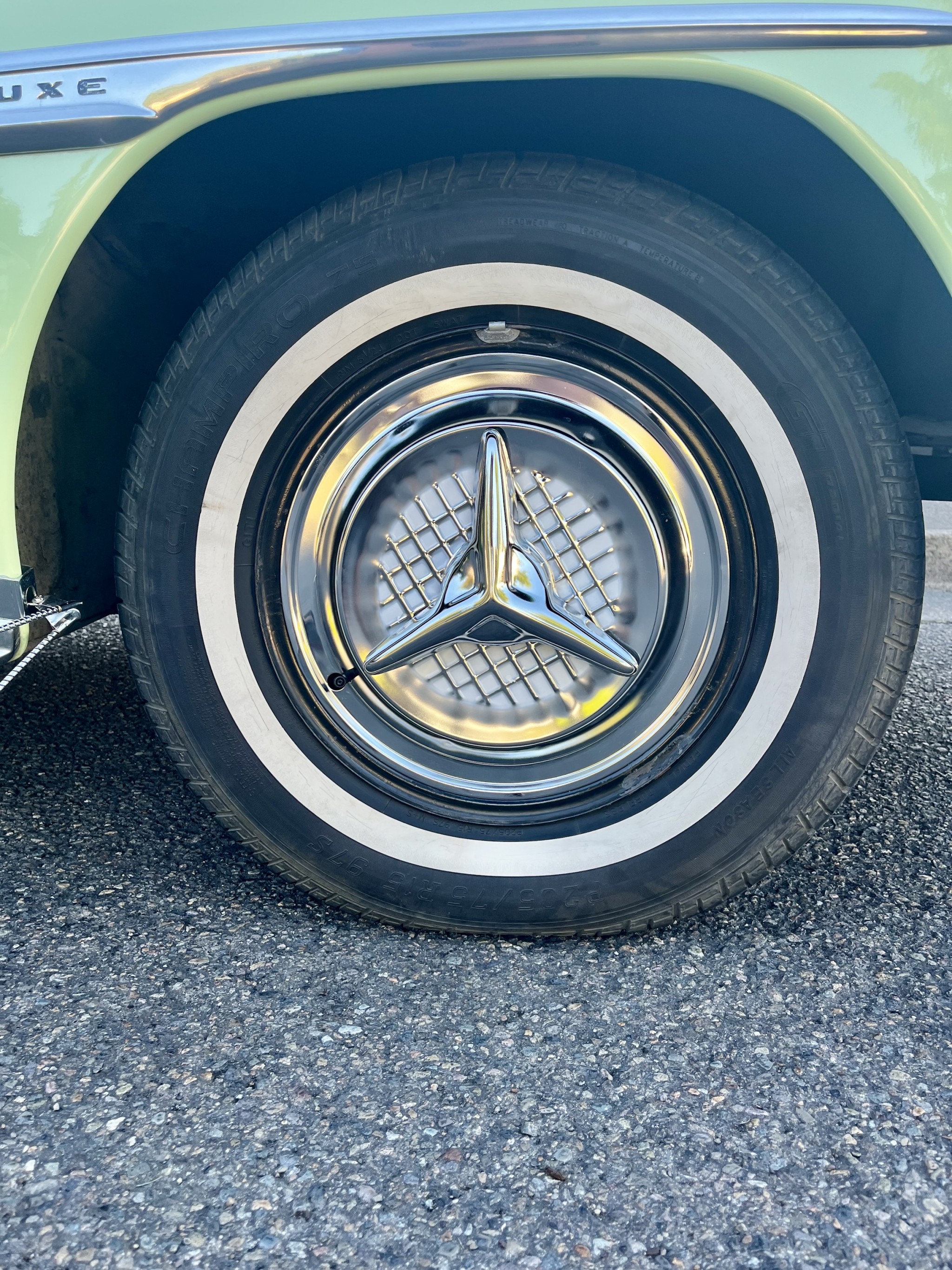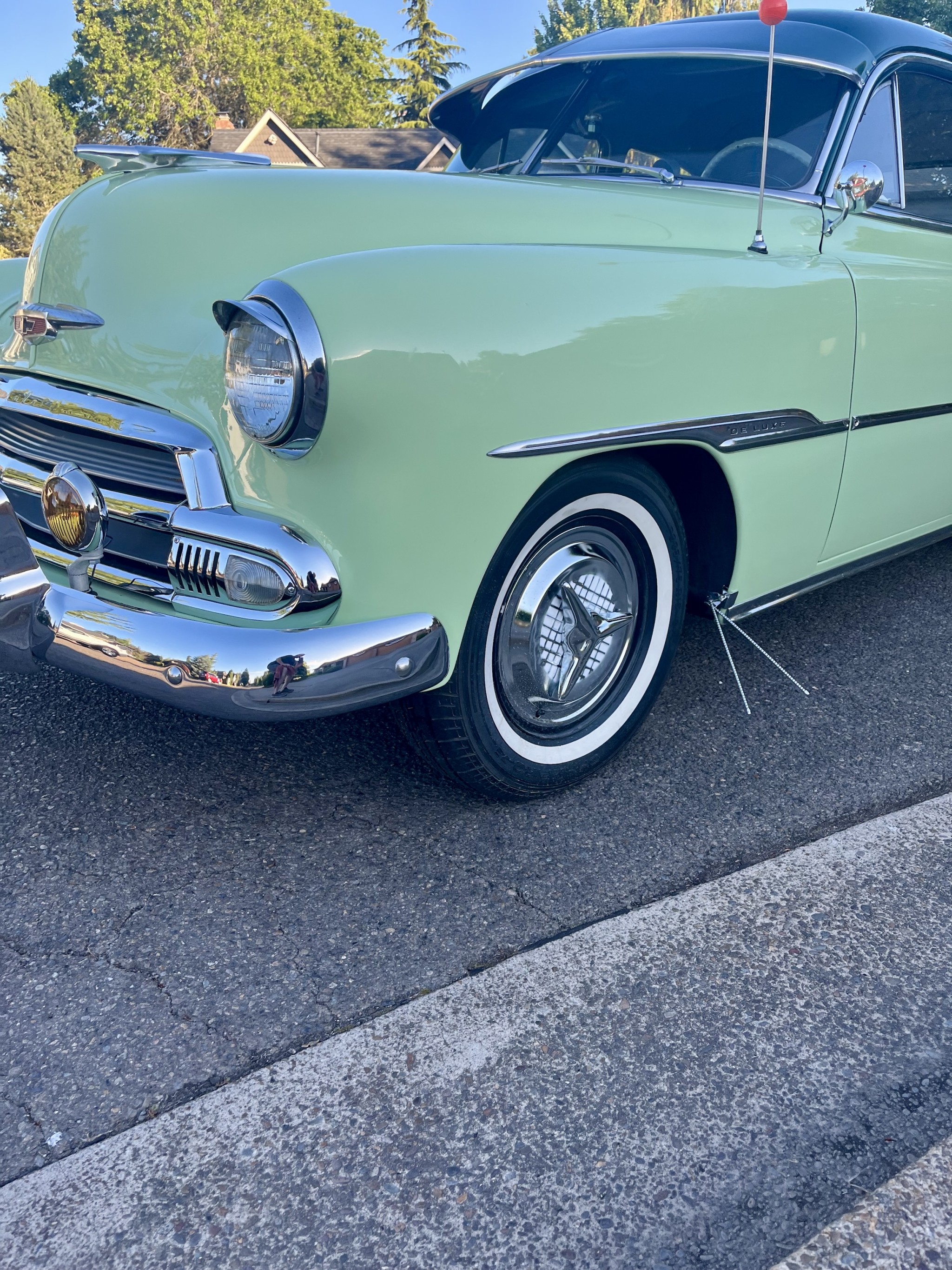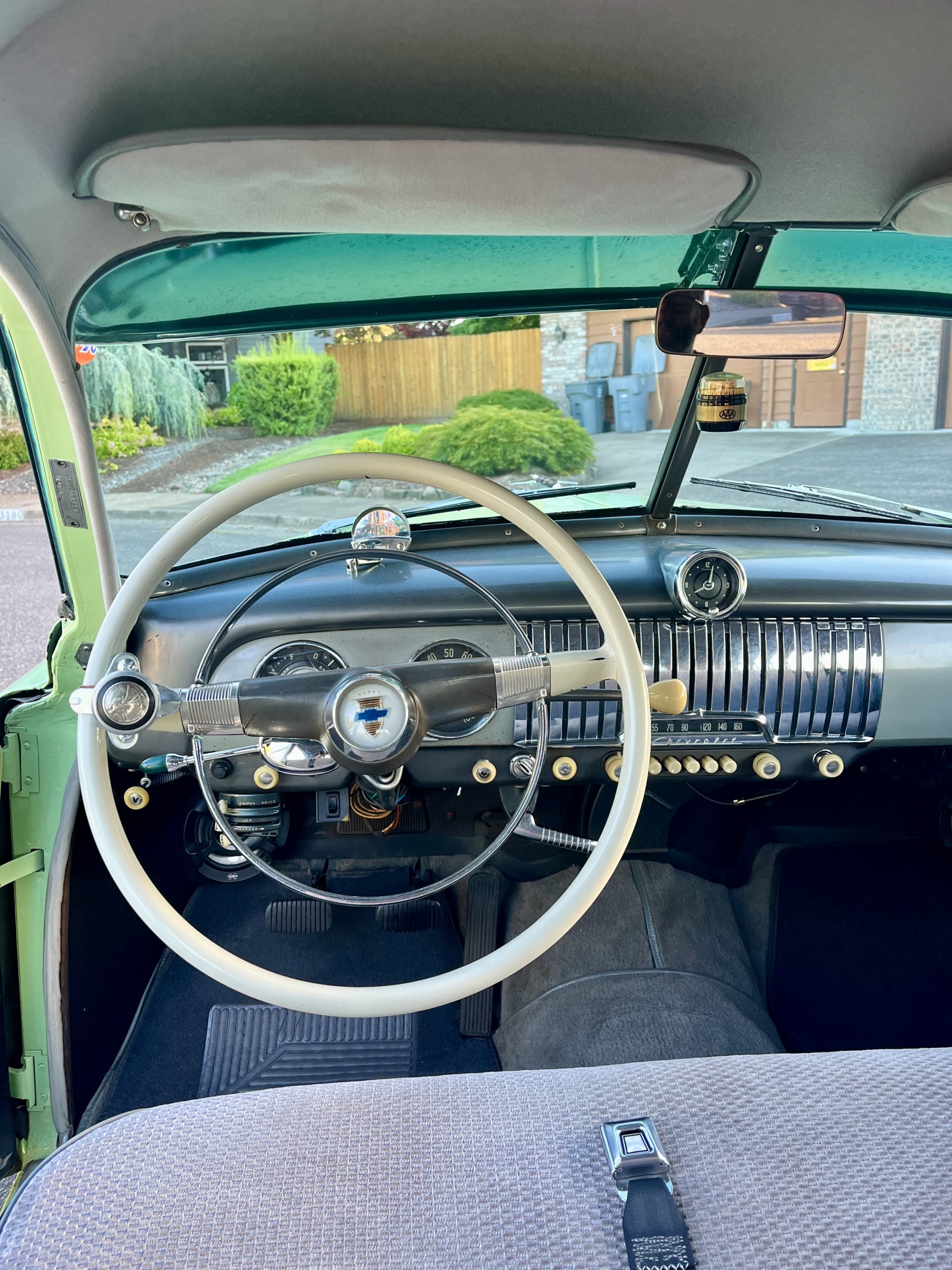 So, Jeff, beautiful example of a well dressed ’51 Chevrolet. As said before, beautiful color combo, the spinners (from Oldsmobile?) add a touch of nostalgia and the whites set it off. Primo interior. Love the makeout knob on the steering wheel