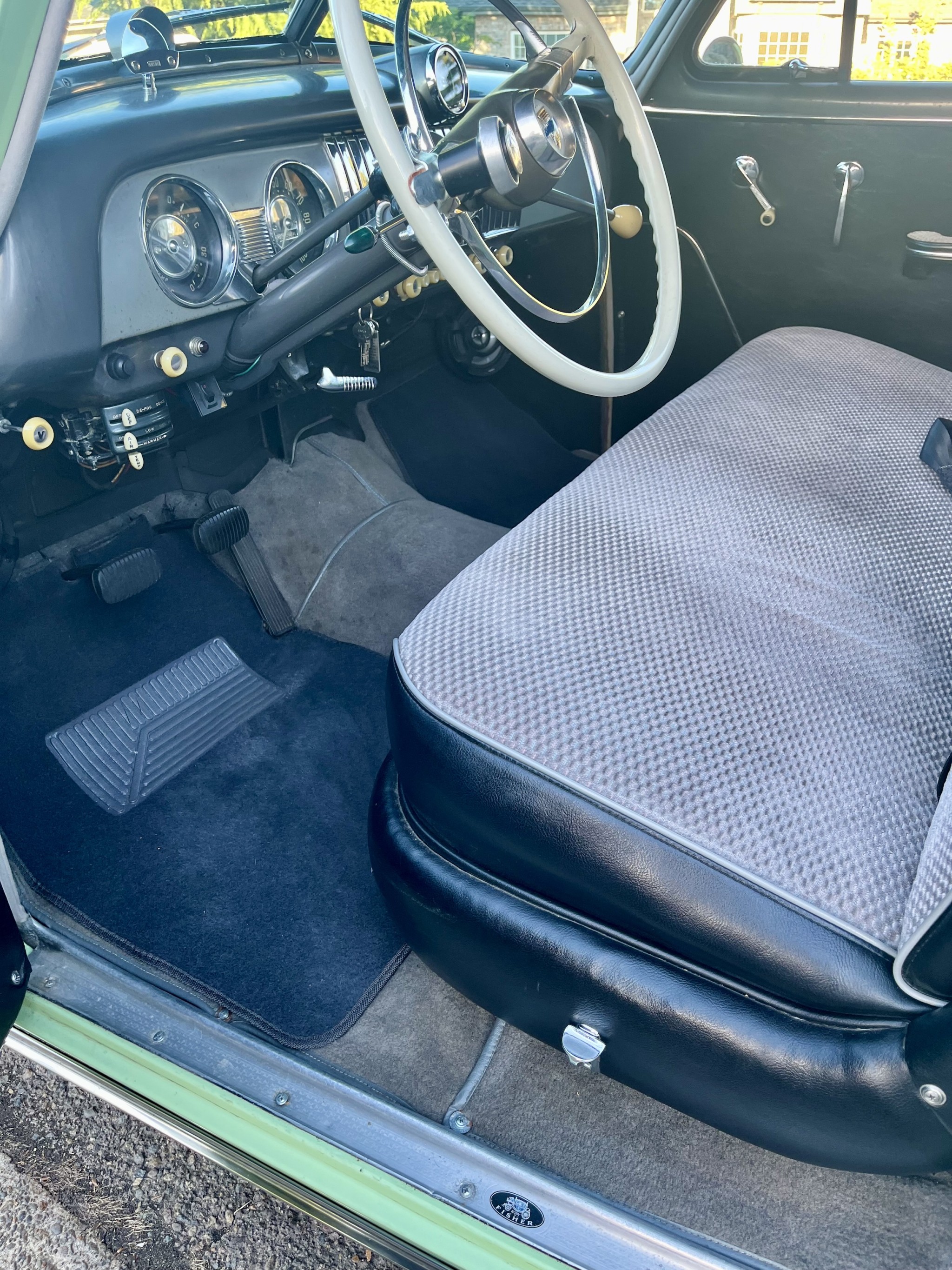 Back in the 60s, I owned a ’52, 53, and a ’48 in that order, all three on the tree. My ’48 had the same color scheme as this car and a sun visor as well. It was the last year you could start it with a crank. Great roomy car, like a limo. Had two heater cores, one on firewall and one under front seat that blew hot air to front and back. Darn; didn’t have sense to keep it back in ’72. My brothers had a ’53 automatic and it was a gas hog. Nobody much cared when petrol was 25 cents a gallon, and a beater car could be had for $300 and less.