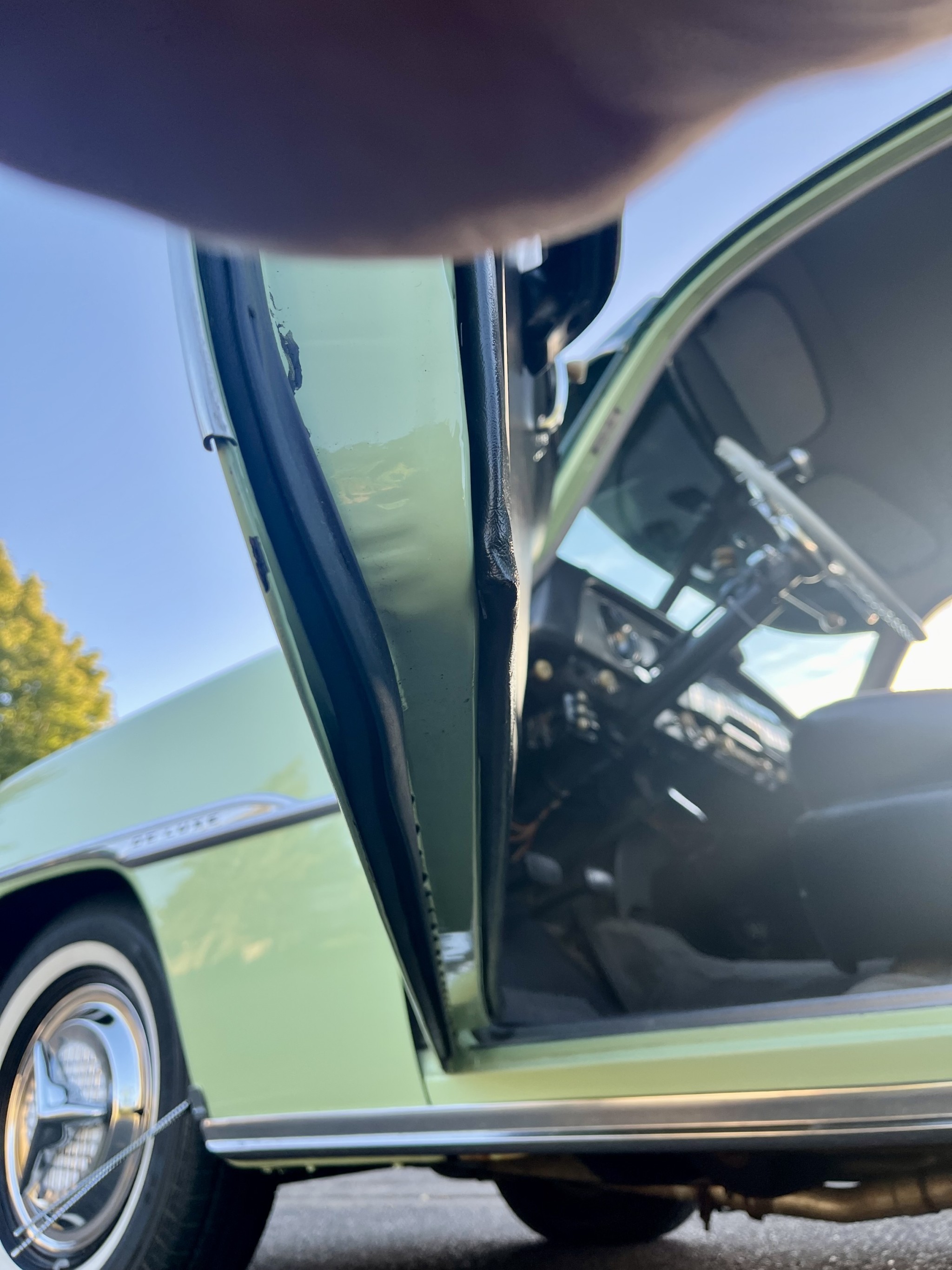 I drive it every other day. The most recent cruise was about a 50 mile round-trip to a local cars and coffee in a neighboring town. Early last spring I went on an 80 mile round-trip to my office and back. It does have radial tires and the date code is 11th week of 2007, they have 3600 miles on them, those same miles are on the rebuilt engine. It tracks straight down the road, doesn’t wander left or right and the steering wheel is centered. It does have an intermittent drip from the transmission output shaft seal. As well I just looked under the car moments ago and saw that the engine pan drain plug is wet so the plug needs a new flat seal. I just changed the oil 200 miles ago so I’m not going to address the oil pan plug leak and I’m getting up in the years and won’t change the transmission output seal. The underside looks great and there is no rust. Feel free to ask away if you need more thank you.