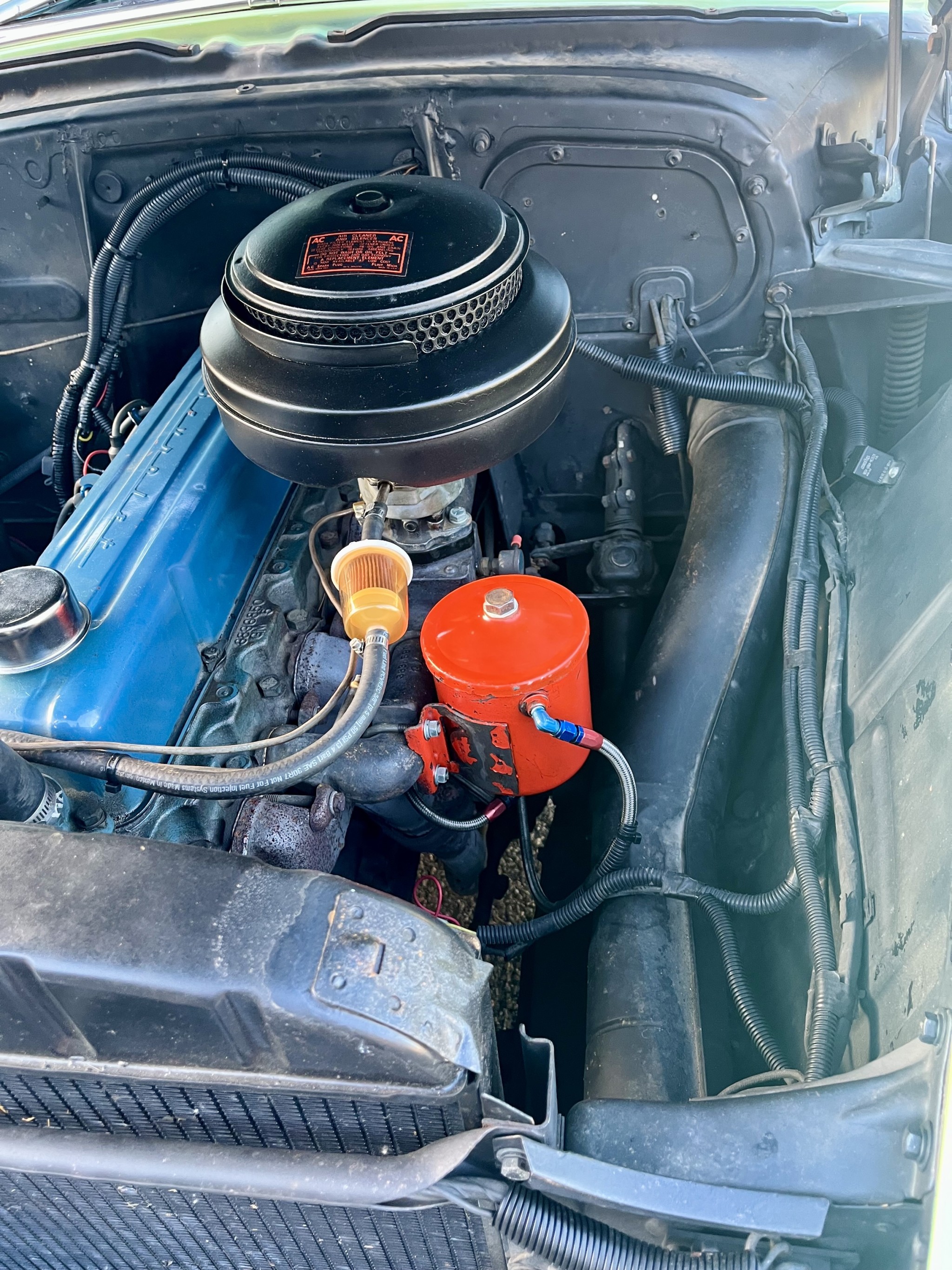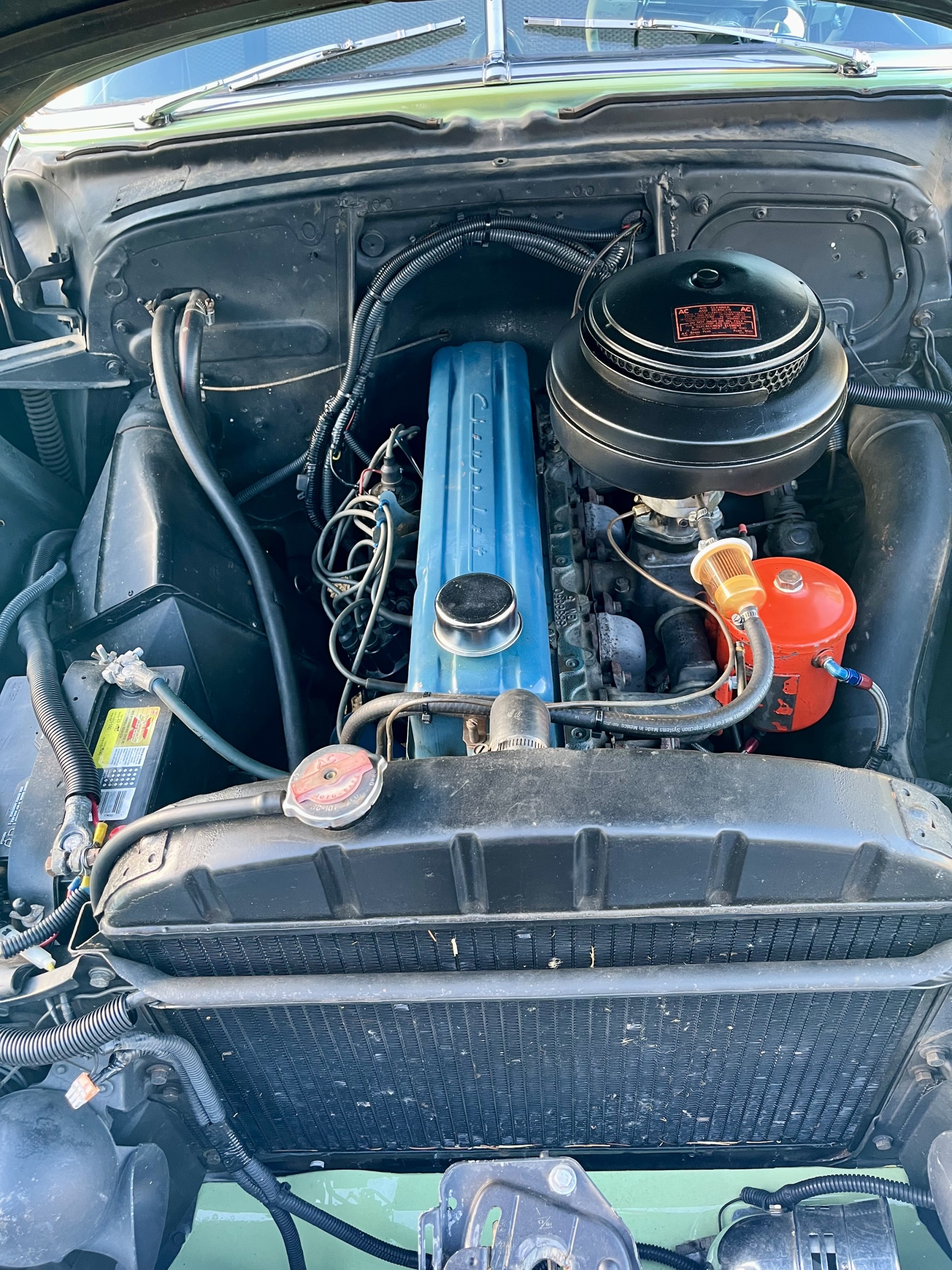 Hmmm, the 235 engine in this beaut is not the stock engine. “the 235 cubic inch engine was not stock with a manual transmission in a 1951 Chevy sedan; instead, the 235 engine was specifically paired with the automatic Powerglide transmission, while the manual transmission models came with the smaller 216 cubic inch engine. The 235 engine introduced with the Powerglide was a higher-performance version with hydraulic lifters.” (Google AI)