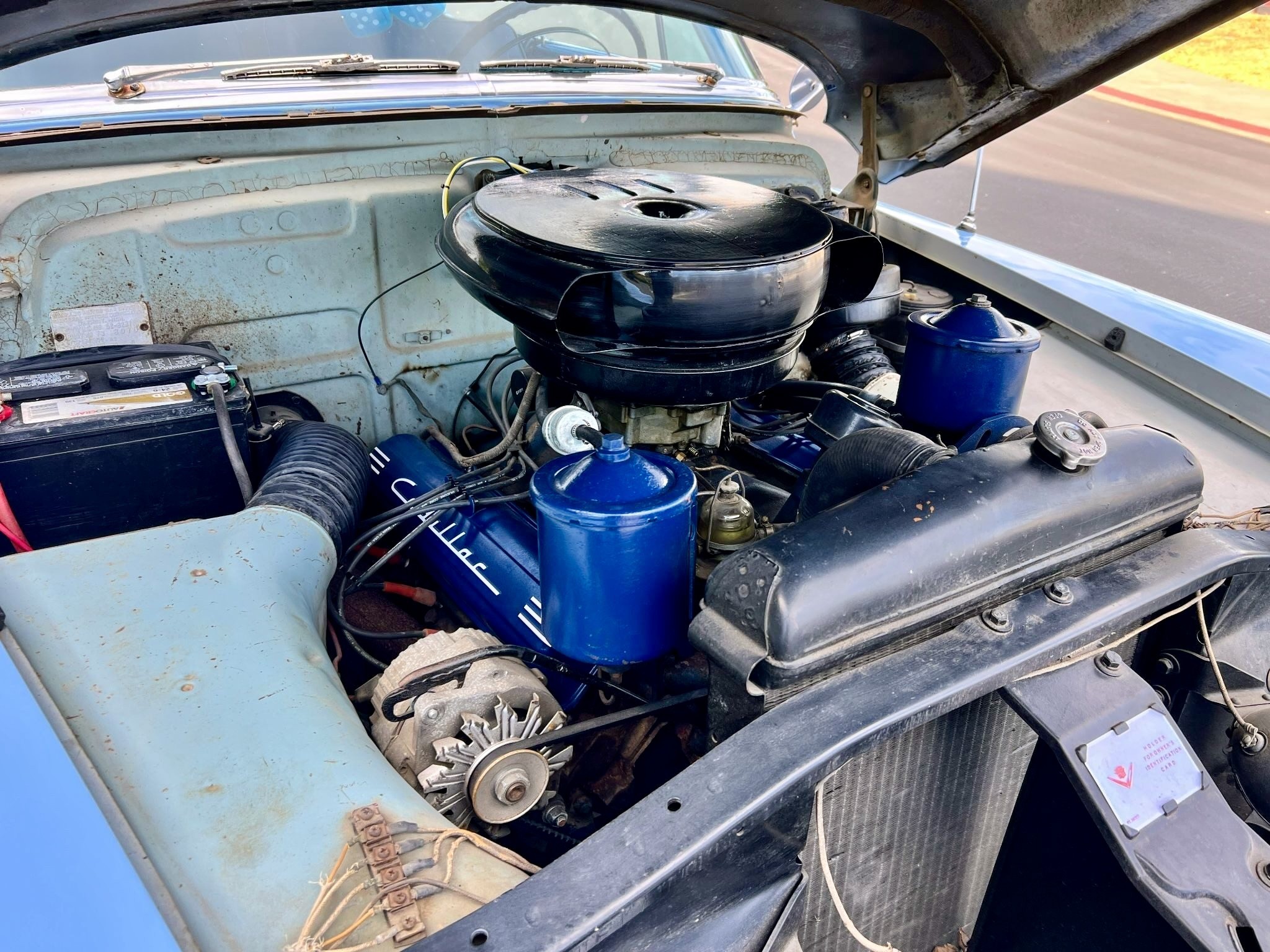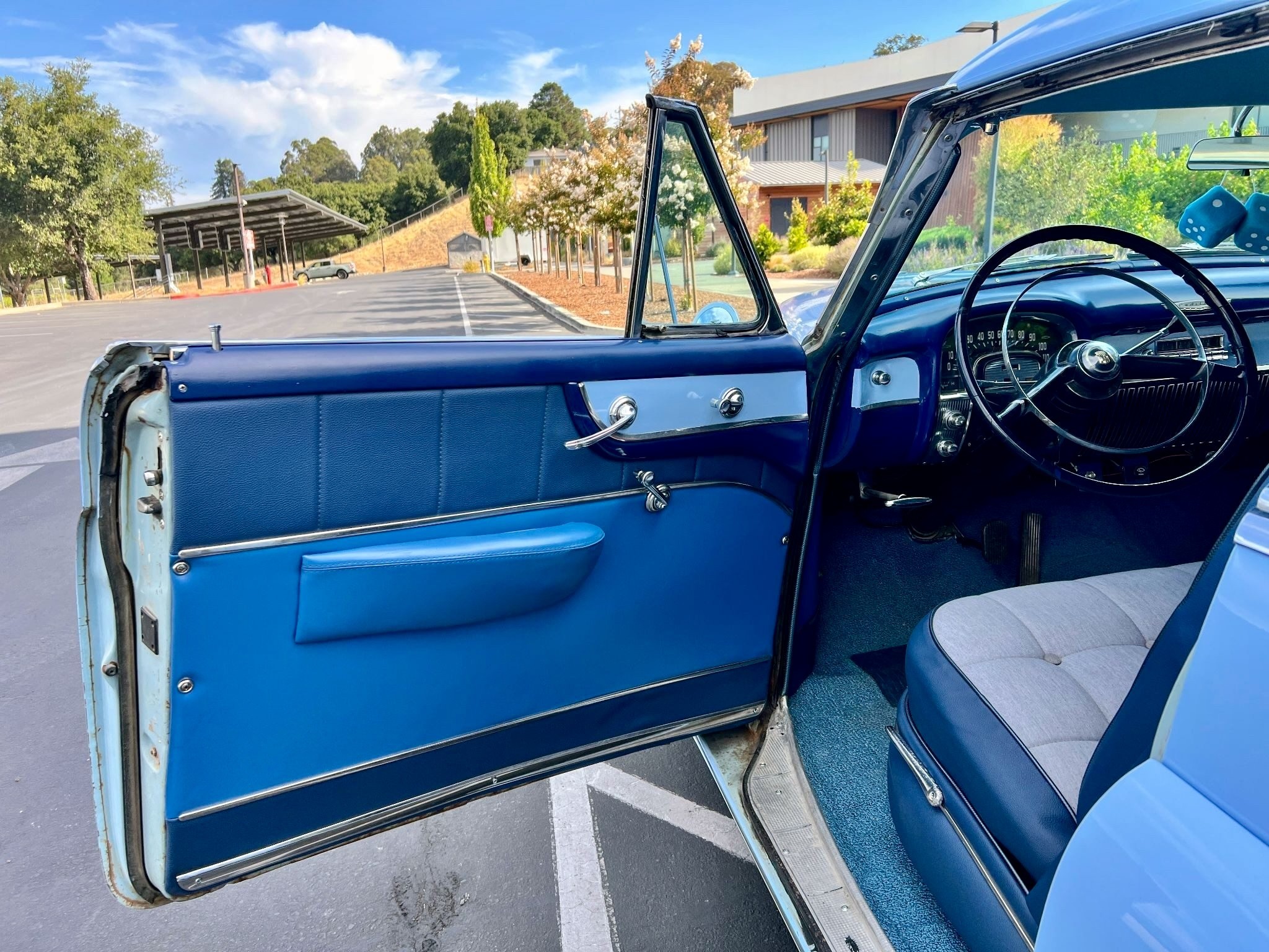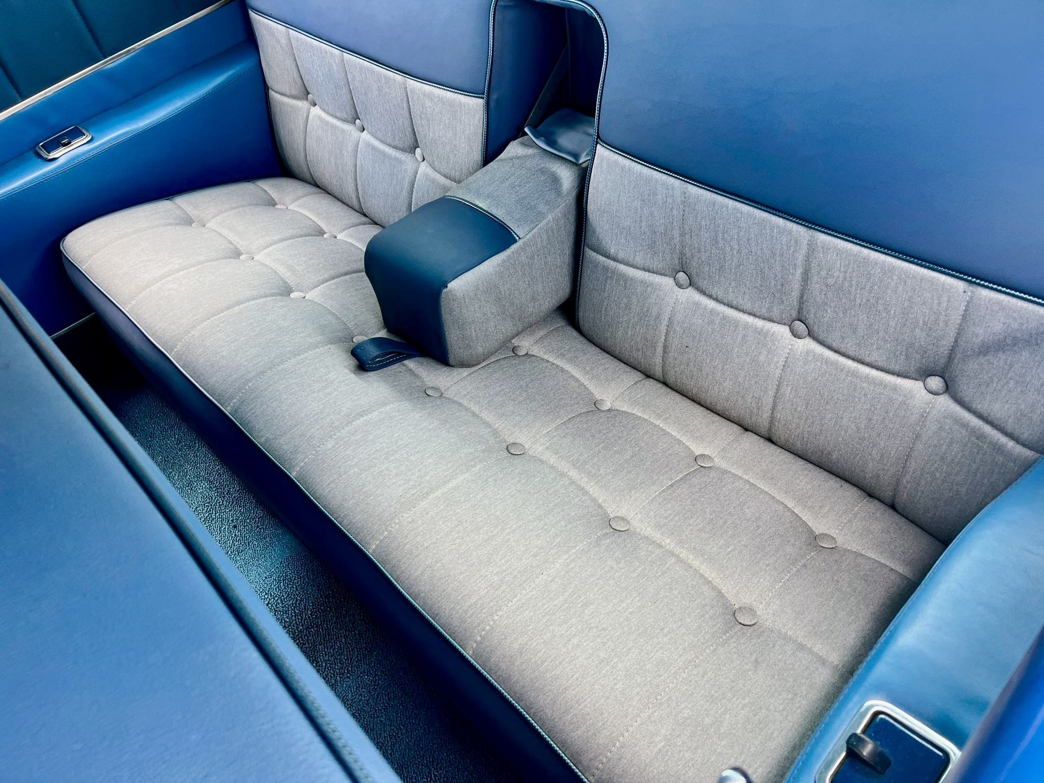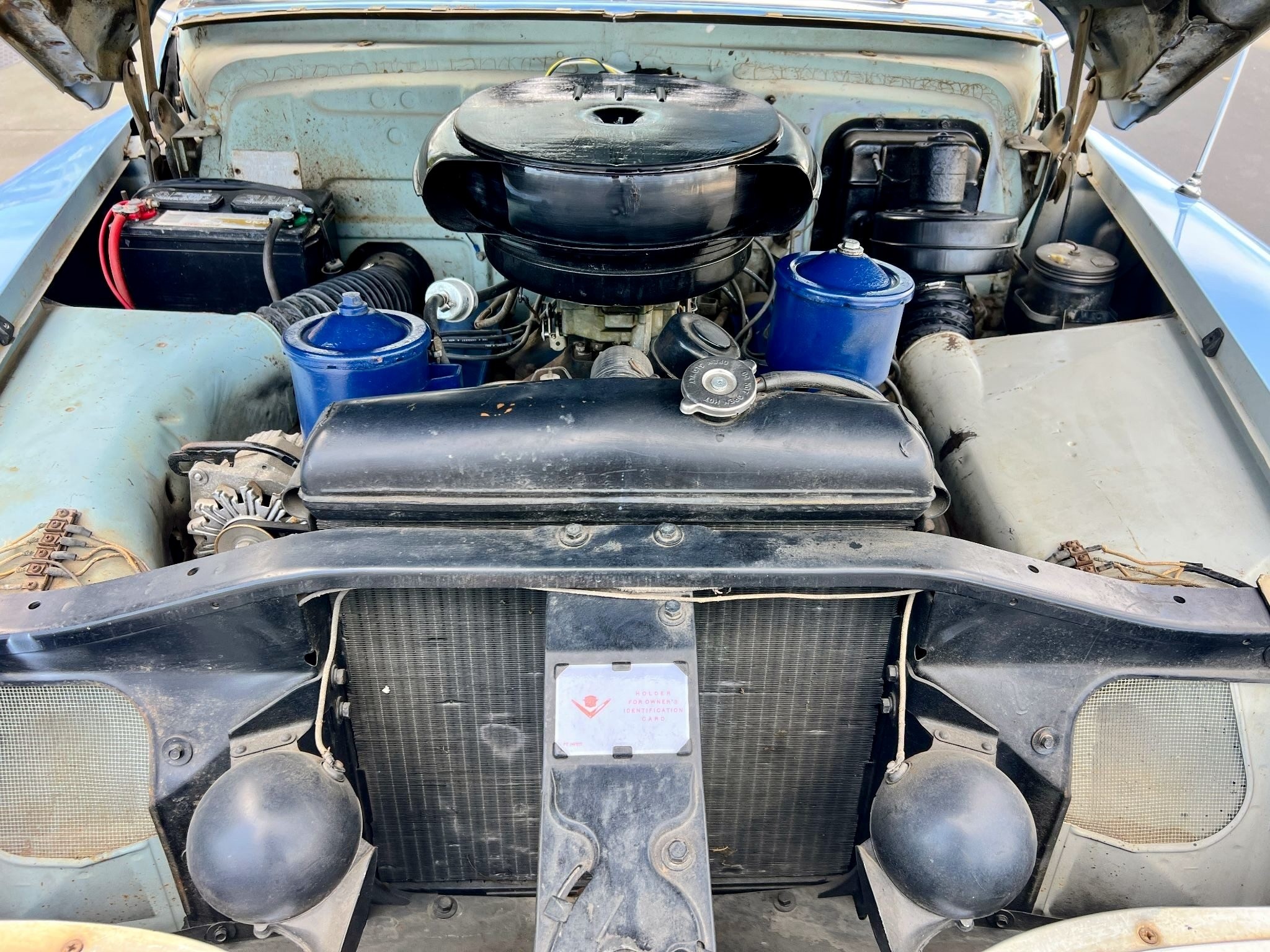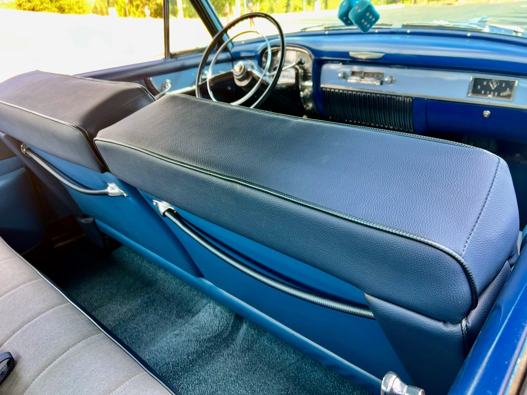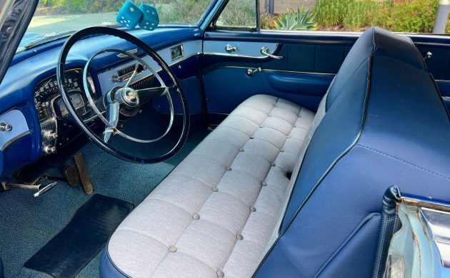 Although the paint job is only about a decade old, the door, trunk, and underhood jambs all wear their original coat of Olympic Blue. The body tag tells us that the car has paint code “20,” which means that it was originally painted Olympic Blue with a Nassau Blue roof. The current paint job is painted in a single tone, but it’s a nice-looking color that’s a fine complement to the code “42” interior: Light Blue Bedford Cord and Dark Blue Plain Broadcloth. The seller also notes that the body has some small dings, and there is a crack in the front passenger-side window glass.