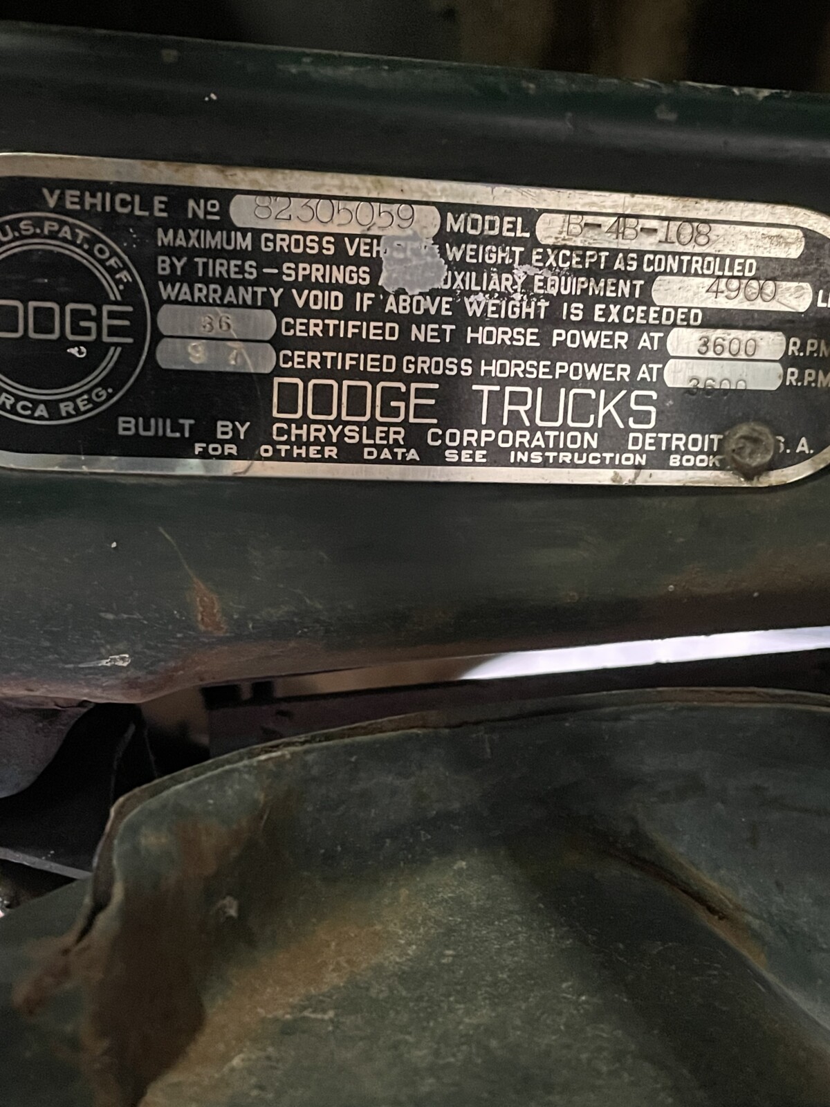 Does that ID plate say 97 gross hp and 36 net hp? Efficiency definitely was not the goal of Dodge circa 1953. I would love to have a truck from this era and build it with stock looks but a late model drivetrain from the trucks respective manufacturer. My brother has my Dad’s old 1954 Chevrolet 3100 series truck. It’s all stock appearing but has been upgraded to a 350 and a 4 speed. The first time he took me for a ride it dawned on me that the trucks from that era are surprisingly light weight!