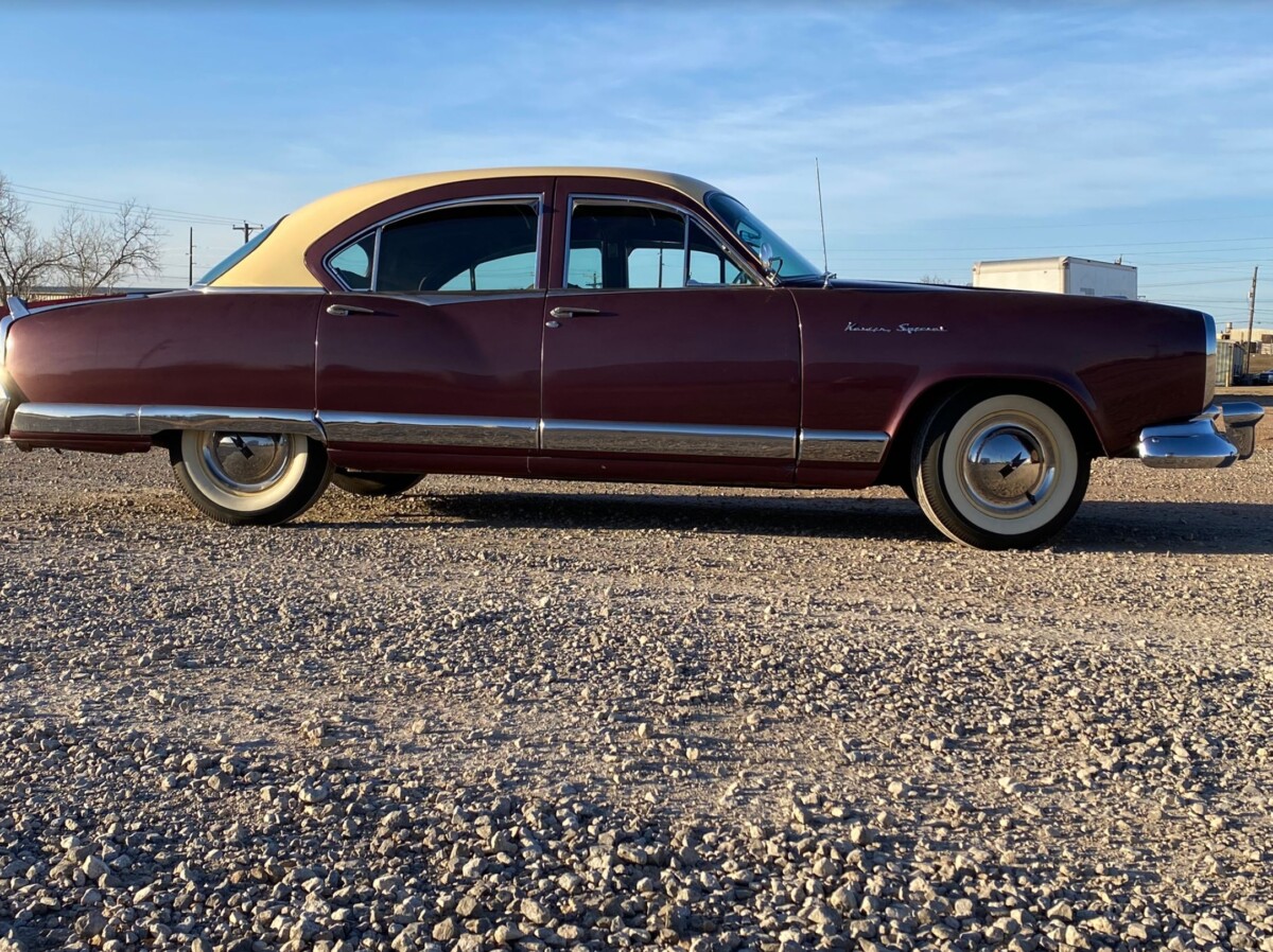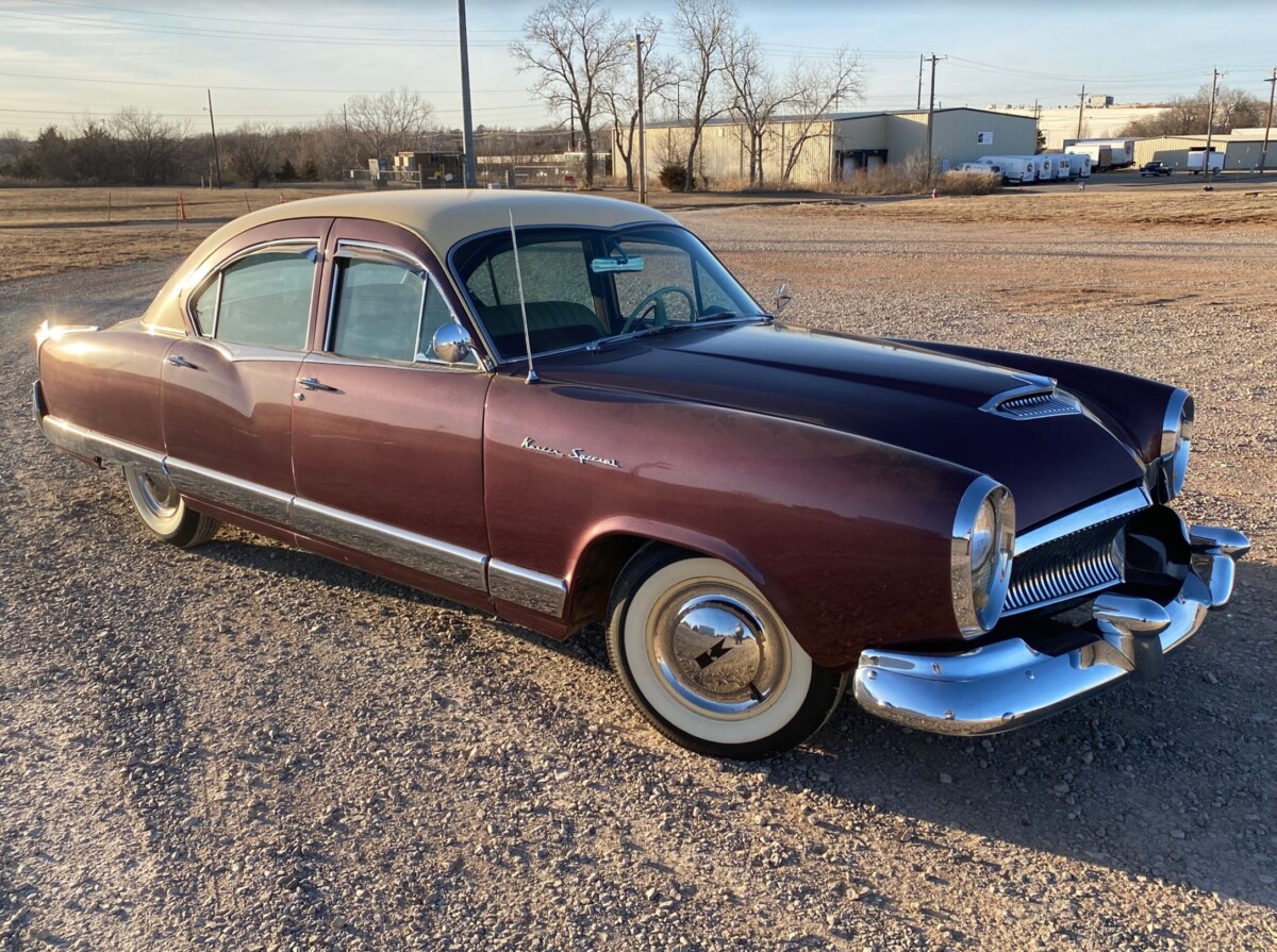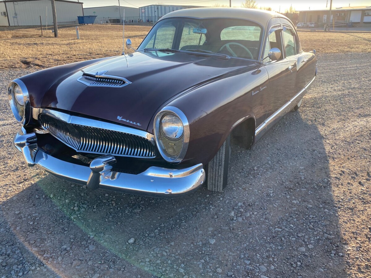 Looks to me like one of the leftover ’53 bodies — Kaiser had a bunch of them — that received new front sheet metal, the restyled tail lights, and was then sold as a “1954” model. The roof with its smaller rear window and the older-style instrument cluster are the “tells.”