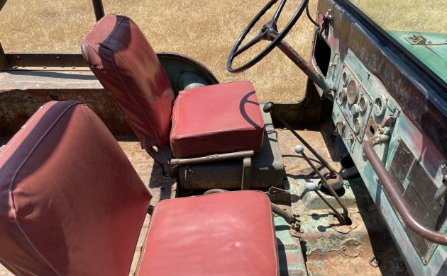 The M38A1 was originally equipped with a 24-volt electrical system, but this one has had a 12-volt conversion with a newer 12-volt battery. The gauges all work, including the odometer and oil pressure gauge. You can see that there is mild surface rust on the floors and interior panels, but nothing close to anything you’d label as “rot.” It’s just a nice, clean California Jeep.