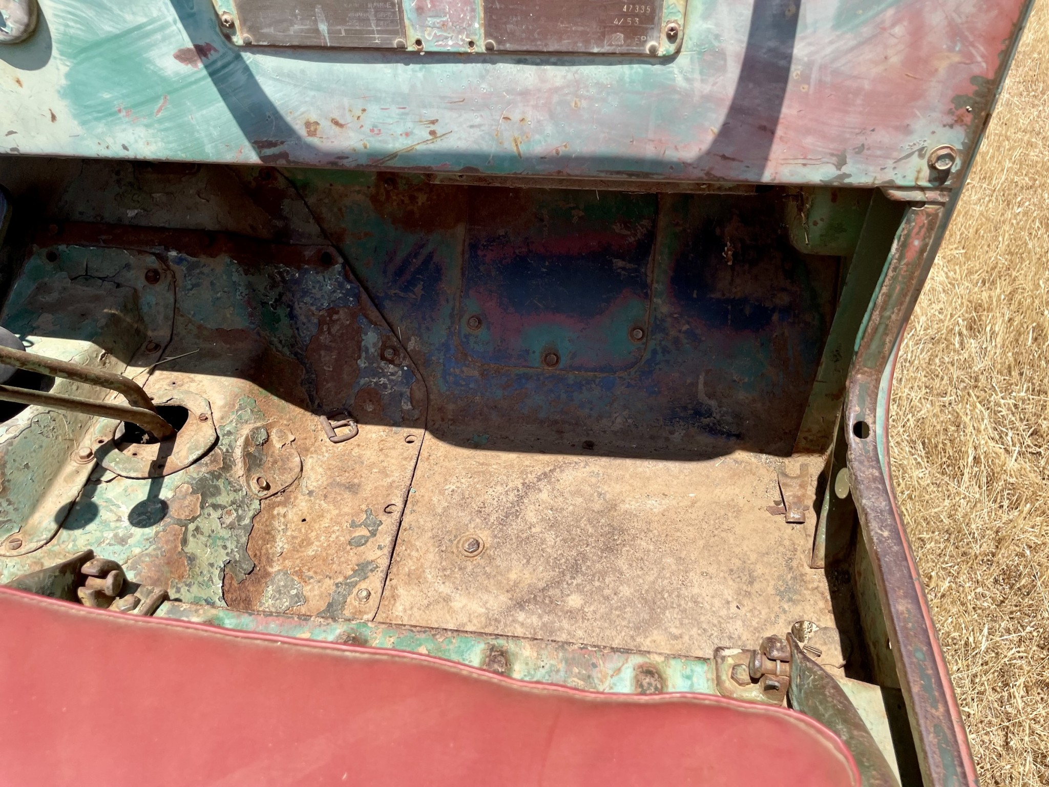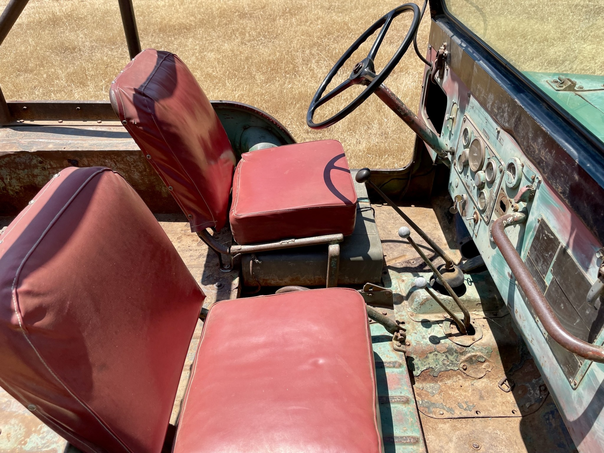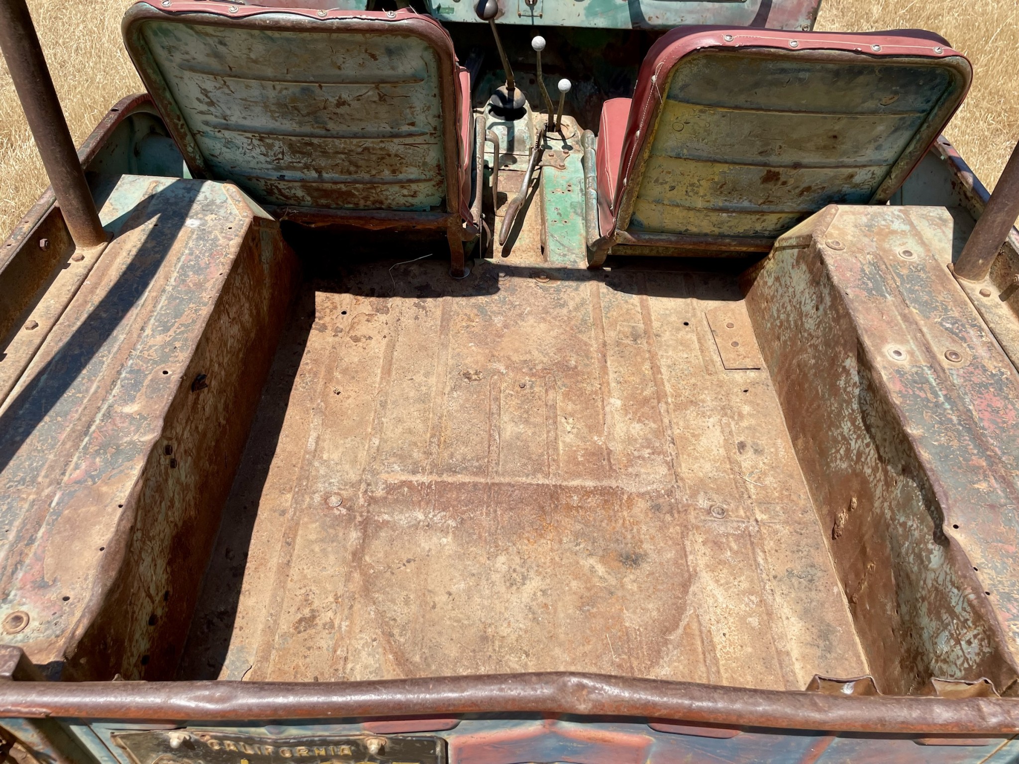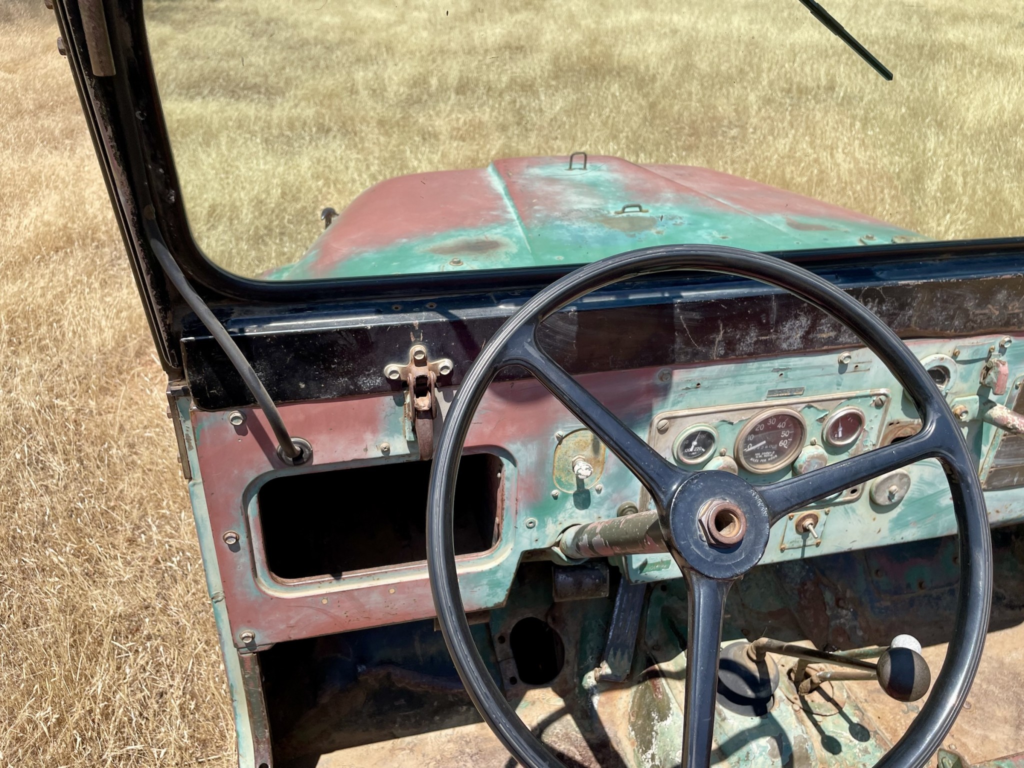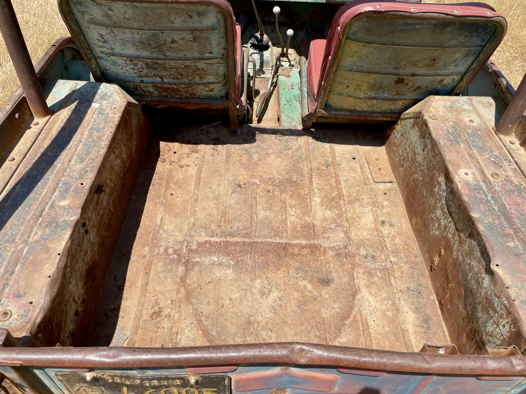 The M38A1 was originally equipped with a 24-volt electrical system, but this one has had a 12-volt conversion with a newer 12-volt battery. The gauges all work, including the odometer and oil pressure gauge. You can see that there is mild surface rust on the floors and interior panels, but nothing close to anything you’d label as “rot.” It’s just a nice, clean California Jeep.