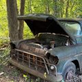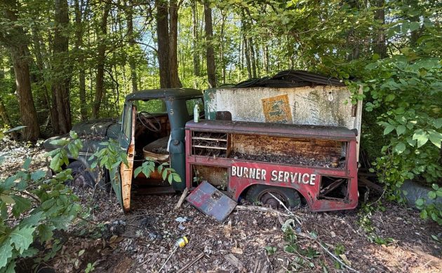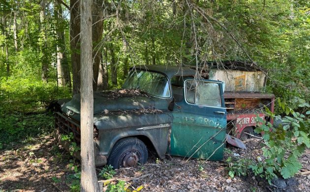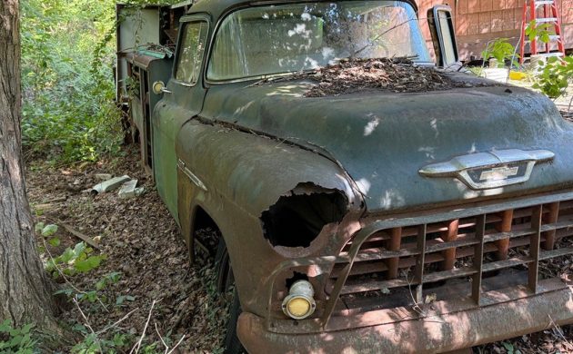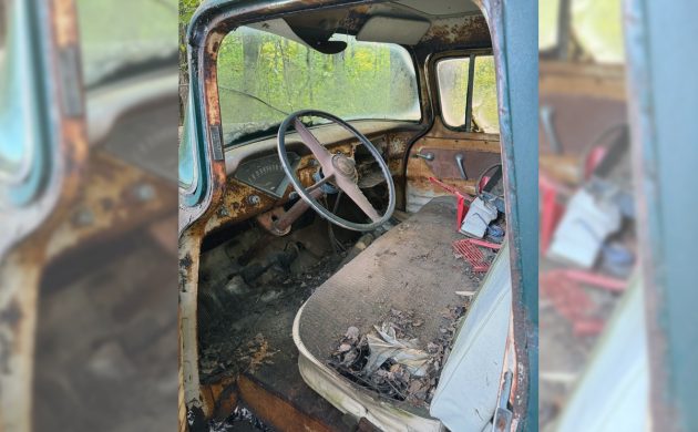 Sitting in the woods for an unknown number of years, or decades, the seller refers to this truck as an Apache, but those didn’t come out until 1958, so this is a regular Task Force. Buyers could opt for power steering for the first time on a Chevrolet pickup during this series, and it would sure come in handy on a rugged 3/4-ton work truck. The seller says the buyer will need to take this one as a unit, including the “refrigeration cap” in the bed. I’m not sure if that’s an insert or what that refers to; there aren’t any photos showing the rear of the truck, unfortunately.