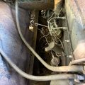 This will be a 4 speed transmission. 3 speed would be a column shifter,. No power steering on this p.o.s. it would be driven off the back of the generator. Nothing special about the service body other than it’s missing it’s doors. (Hinges probably rusted off.) The only thing I find interesting on this mound of rust is the grille guard that matches the pattern of the grille. The only thing that may be of value on this rolling (maybe) rust pile is the drive train.