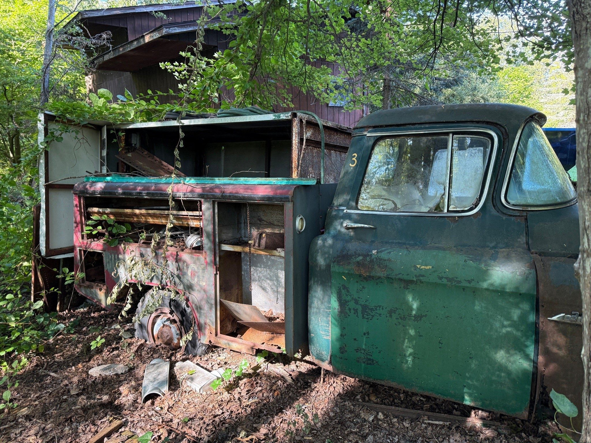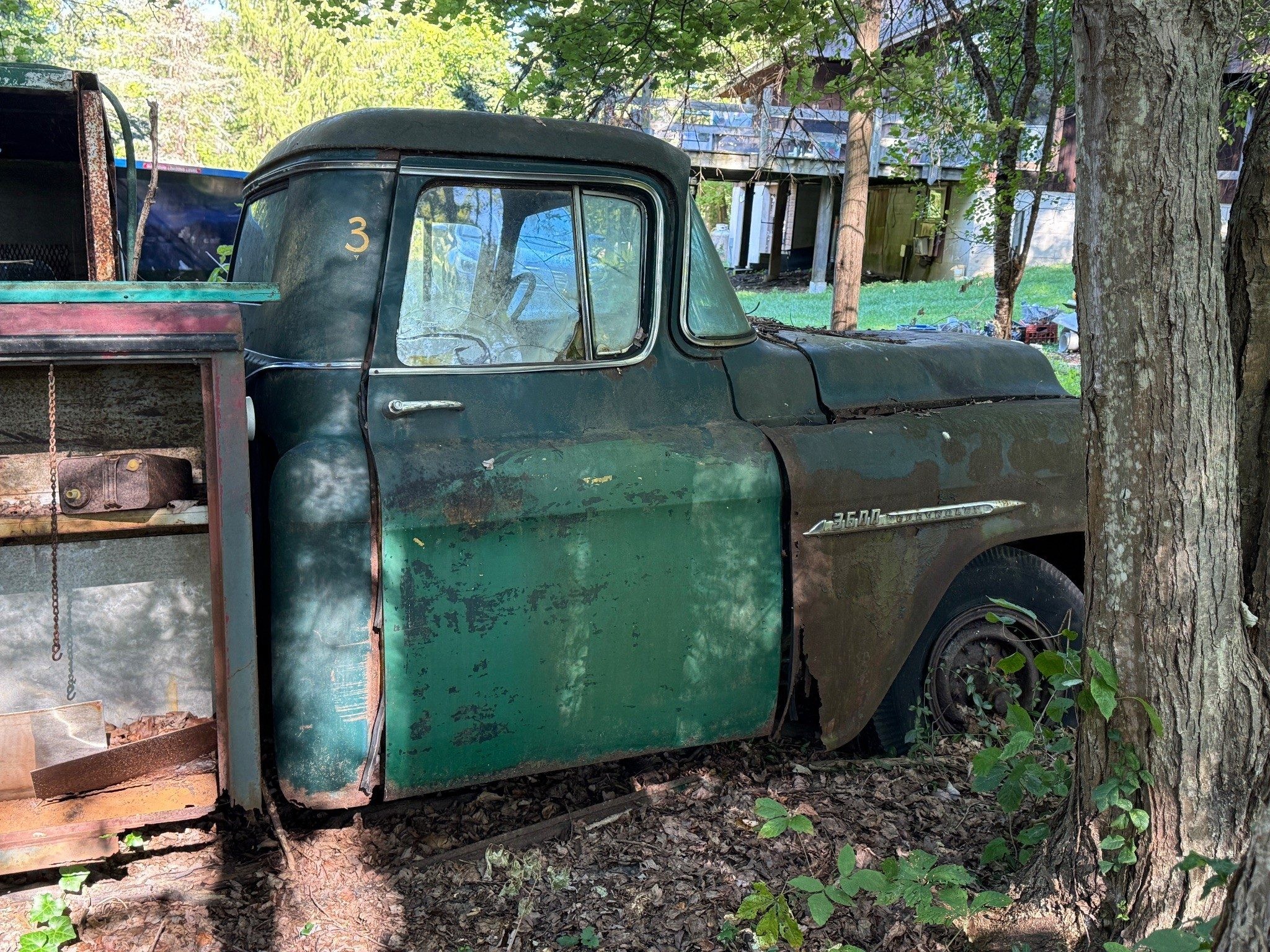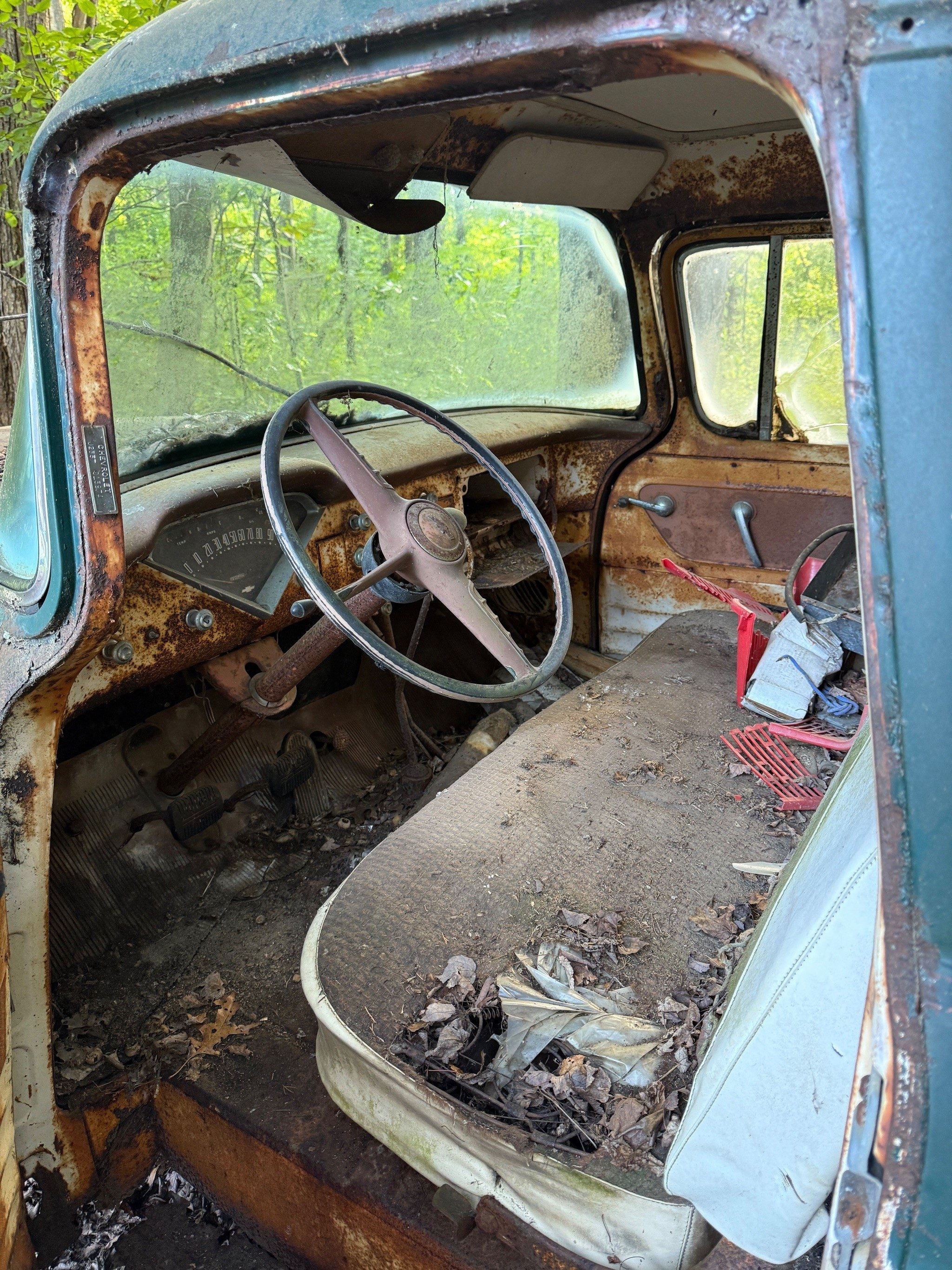 Sitting in the woods for an unknown number of years, or decades, the seller refers to this truck as an Apache, but those didn’t come out until 1958, so this is a regular Task Force. Buyers could opt for power steering for the first time on a Chevrolet pickup during this series, and it would sure come in handy on a rugged 3/4-ton work truck. The seller says the buyer will need to take this one as a unit, including the “refrigeration cap” in the bed. I’m not sure if that’s an insert or what that refers to; there aren’t any photos showing the rear of the truck, unfortunately.