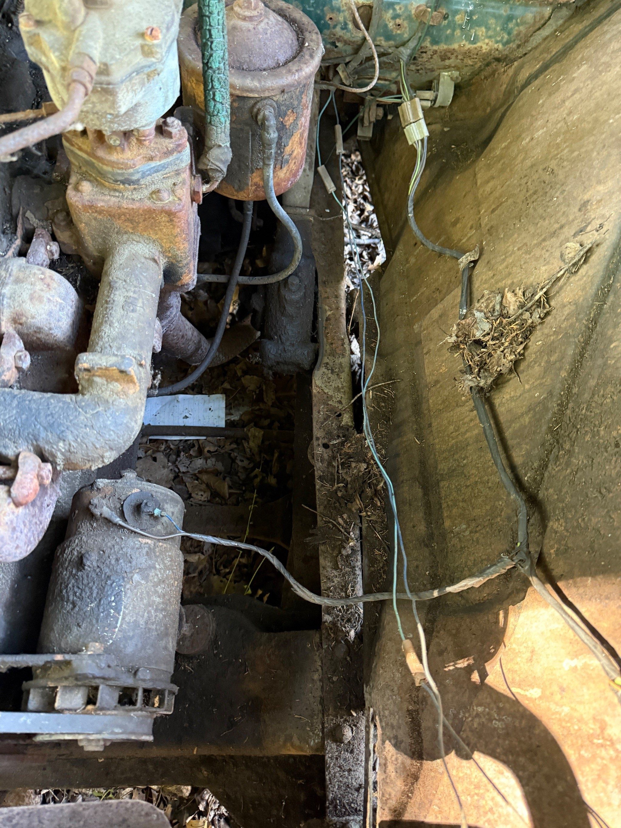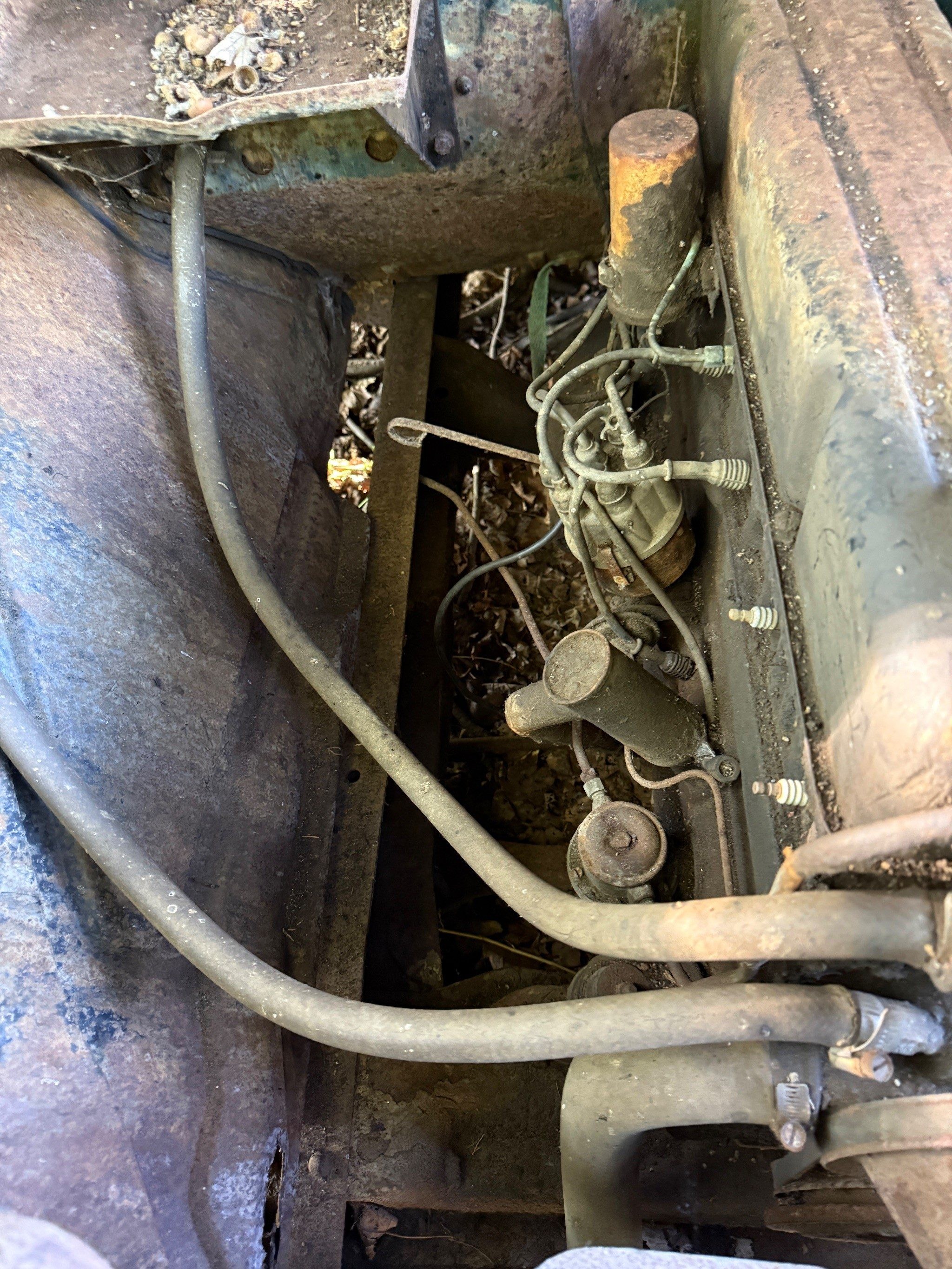 This will be a 4 speed transmission. 3 speed would be a column shifter,. No power steering on this p.o.s. it would be driven off the back of the generator. Nothing special about the service body other than it’s missing it’s doors. (Hinges probably rusted off.) The only thing I find interesting on this mound of rust is the grille guard that matches the pattern of the grille. The only thing that may be of value on this rolling (maybe) rust pile is the drive train.