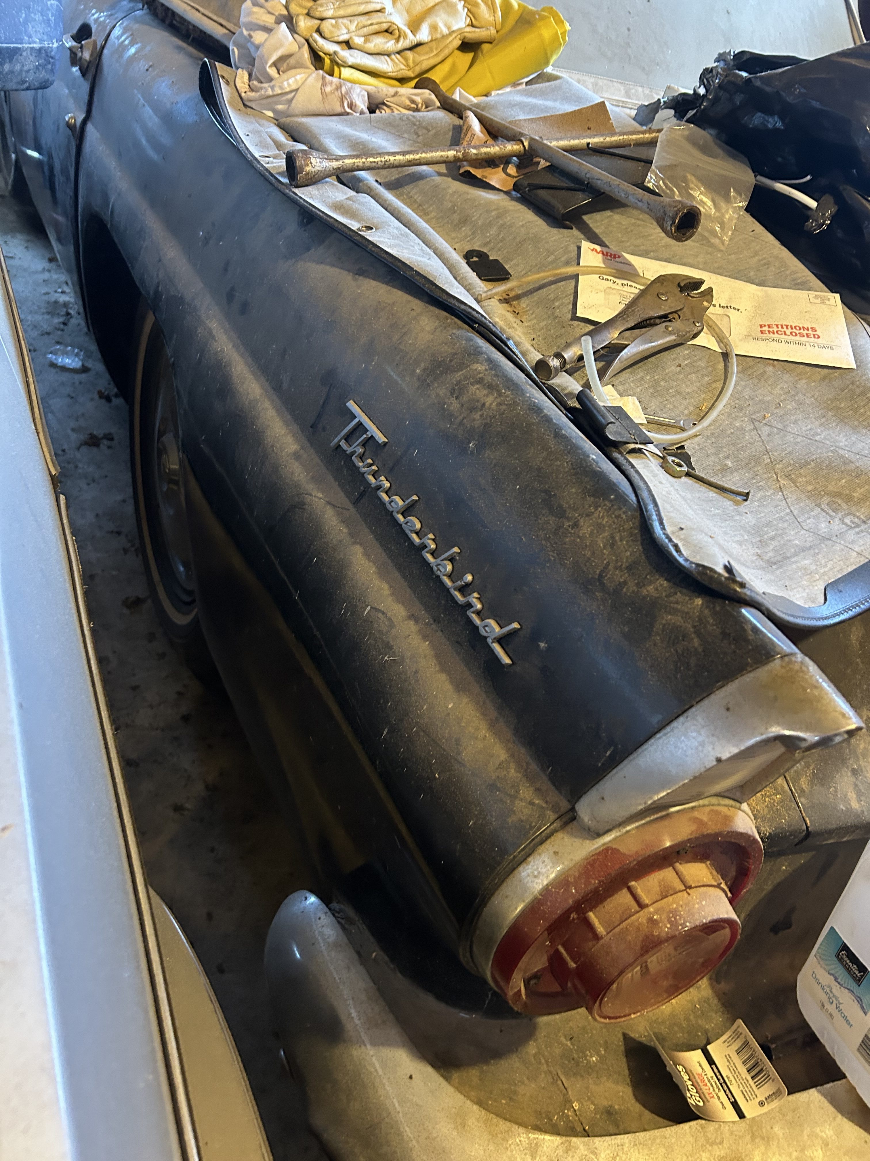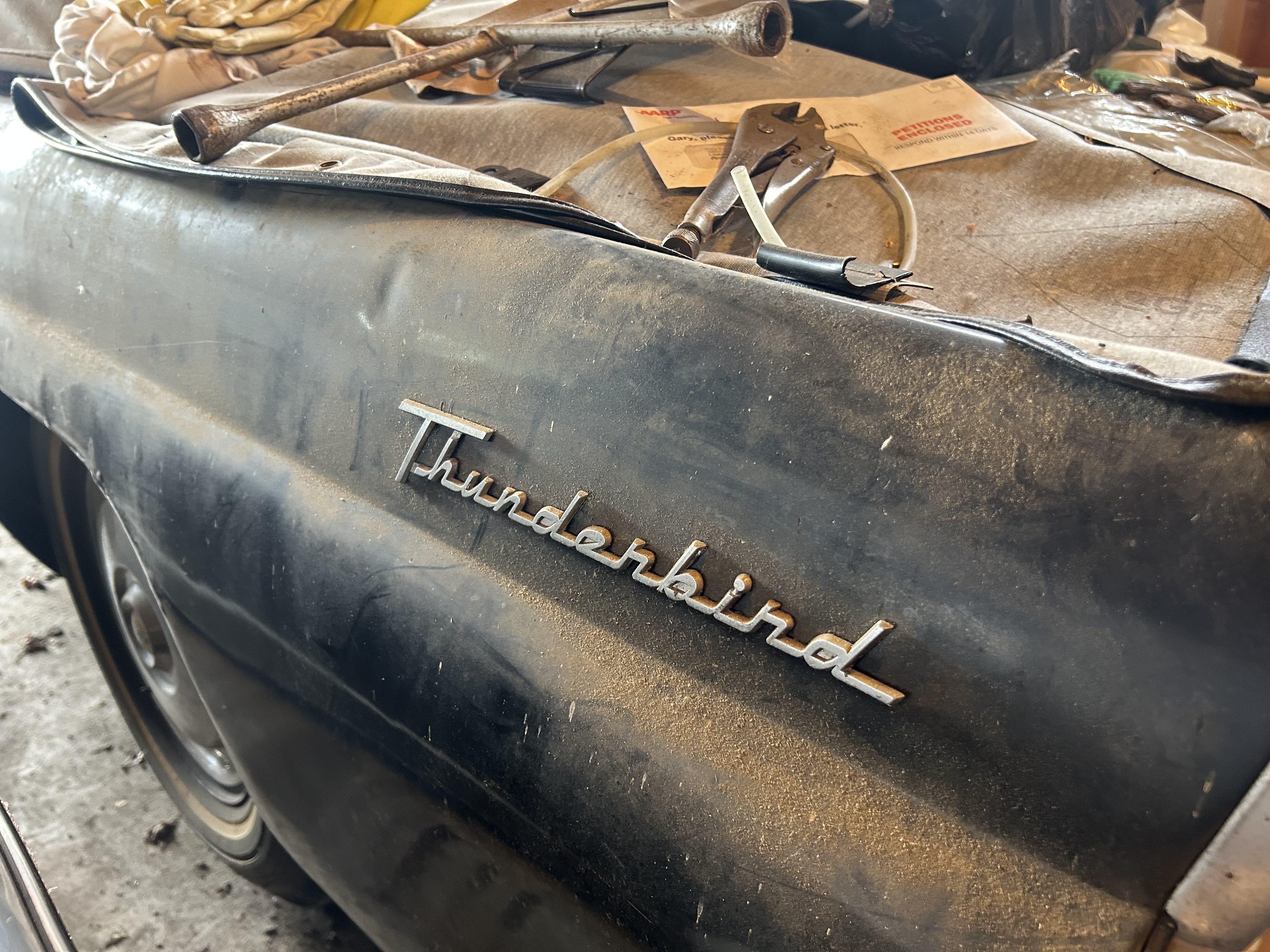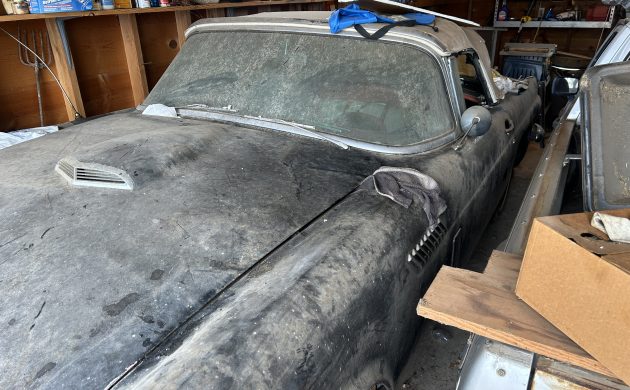 Ford released the Thunderbird in 1955, creating the Personal Luxury Car market segment. The First Generation T-Bird remained on sale for three years, cementing the badge’s place in the new-car market with respectable sales figures. The first owner ordered this 1956 example in Raven Black, which was one of eight shades available at the start of the model year. The company added another two colors in April 1956, bringing the tally to ten. The owner confirms that this T-Bird has occupied its current dry location since 1973 and deserves a second shot at life. The vehicle is essentially complete and appears to be a prime candidate for a project build. The panels are straight, and although the photos are limited, there are no signs of major rust. Interestingly, the images seem to reveal surprisingly few chips and scratches beneath the accumulated dust. Therefore, washing and polishing this classic may lift its appearance to an acceptable level as part of a survivor-grade revival. The White soft-top has a rip, but since replacements are cheap and readily available, fitting a new one would seem a no-brainer. Ford increased trunk space in 1956 by relocating the Thunderbird’s spare tire to the exterior. This car retains its correct rear bumper and the mounting hardware for the spare. Some trim pieces require a refresh, but the tinted glass appears to be in good condition.