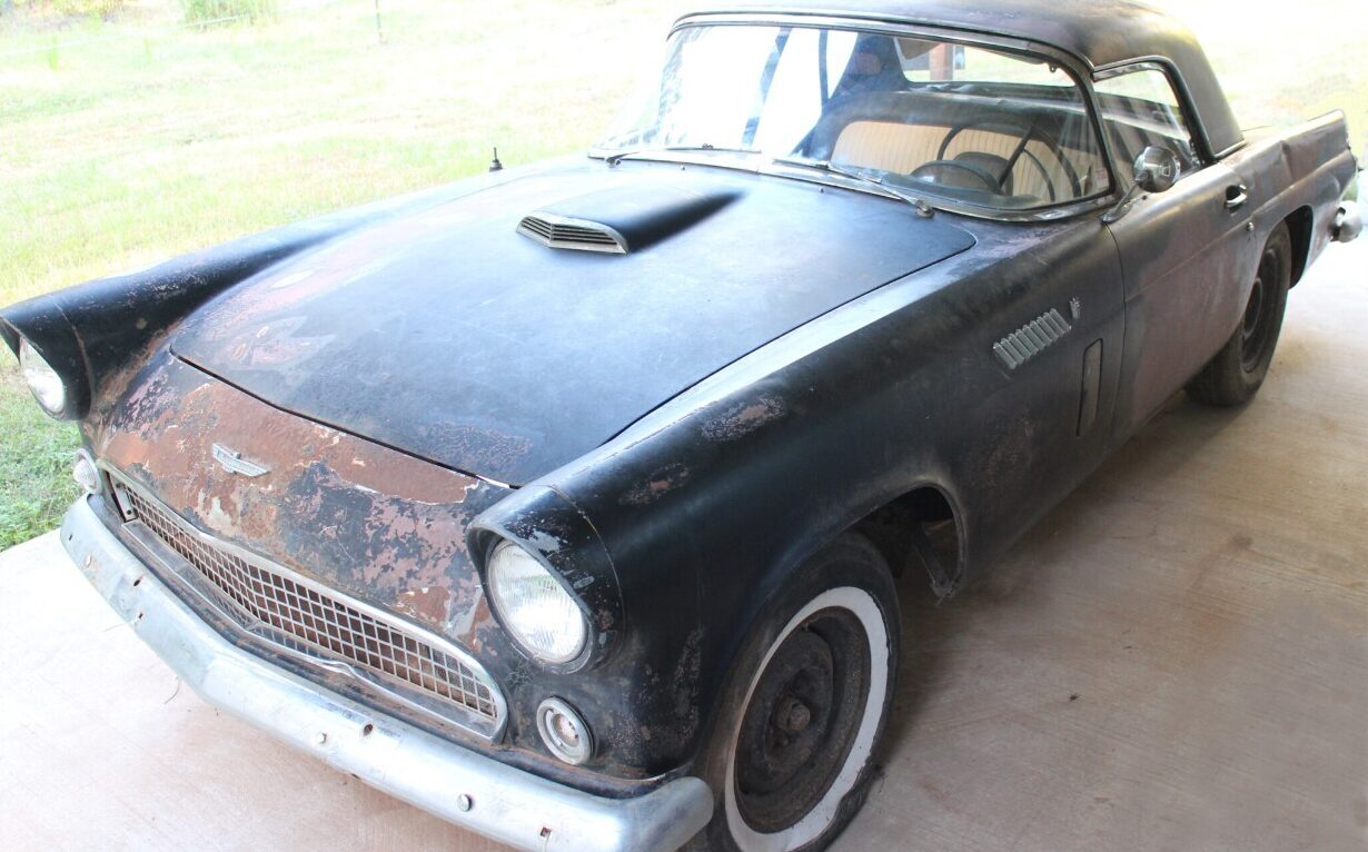 Ford’s first-generation Thunderbird was conceived in the early 1950s when George Walker, chief stylist, and Lewis Crusoe, vice president of the Ford Division, visited the Autorama in Paris. The siren song of the two-seater was obvious. The pair wasted no time developing an American answer to the sports car. Meanwhile, Chevrolet had the same idea, introducing its prototype Corvette in January 1953 at the New York Auto Show. Ford, with the Thunderbird in concept form, rushed to unveil its plans, no doubt hoping to inform the car-buying public that another option was on the way. While the Corvette was only an aspirant to the sports car niche – with its six-cylinder motor and automatic transmission – Ford took a different tack: the Thunderbird landed squarely in the “sporty luxury” niche, with a small block V8 right out of the gate. Its two-seat configuration and fiberglass hard top/optional soft top features copied the Corvette, but it was roomier and better appointed. When the first Thunderbird rolled off the line in late 1954, customers were ready to open their wallets, and Ford’s ‘Bird outsold the Corvette by a mile. Today, collectors appreciate the vintage appeal of the first-gen Thunderbird in stock, restomod, and hot rod form. This 1956 Ford Thunderbird, listed exclusively on Barn Finds Auctions, offers a variety of possibilities for the new owner.