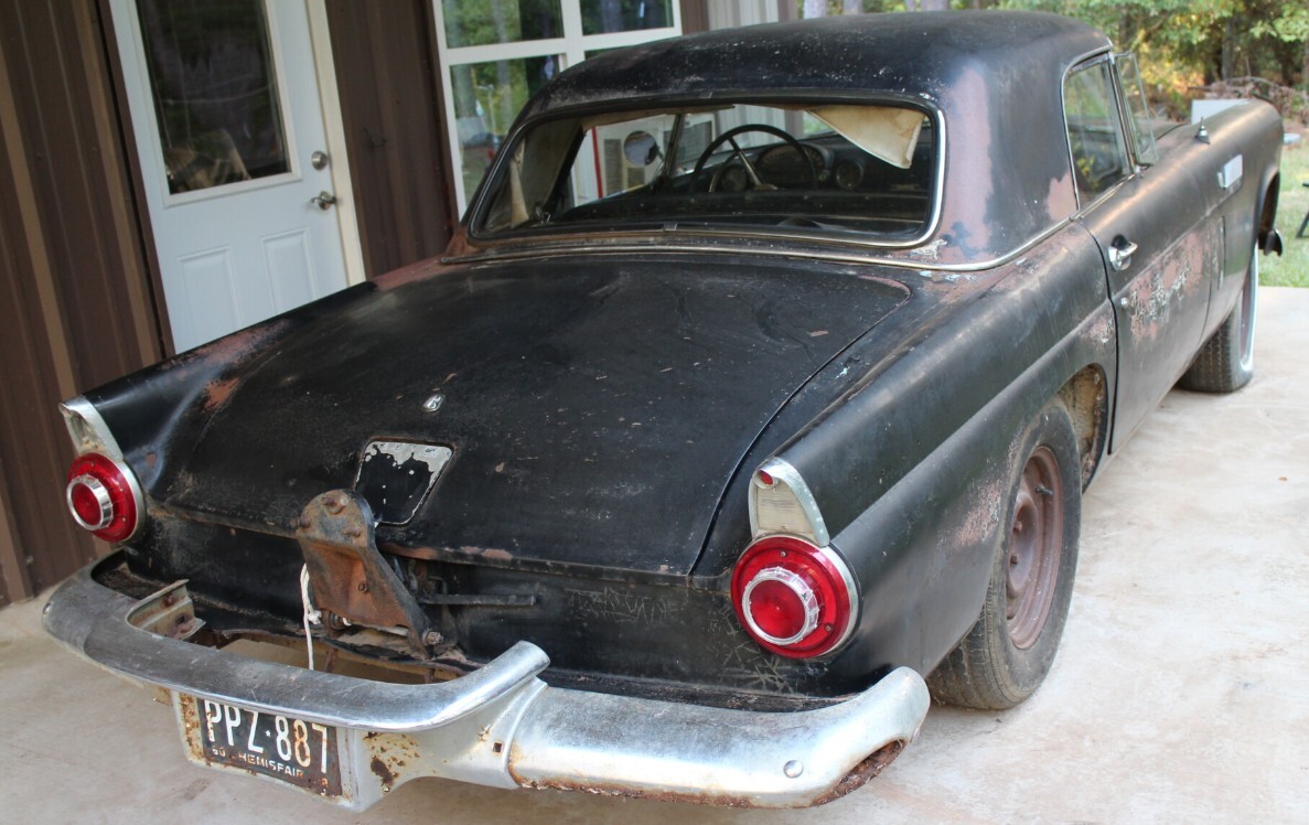This car’s interior retains all the basics including gauges, trim, switches, and the steering wheel. The glass is good except for the driver’s side door window. The car comes with a clean title and it’s located in Lufkin, Texas. While only 15,631 T-Birds were made in 1956, parts are generally not difficult to obtain, thanks to Ford’s habit of sharing components across divisions. Too, the T-Bird didn’t have multiple “trim levels” to confuse today’s restorer. I can see this car in black over black, with the hard top painted silver to match the chrome of the bumpers, slightly lowered, with thoroughly modern underpinnings. Have a different vision? The process starts with a bid, and of course, feel free to contact the seller with any questions.