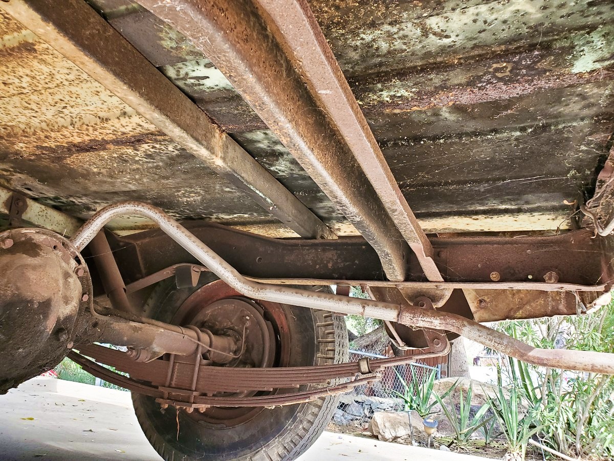 The truck had zero rust, but looked like it was painted with a broom. It had belonged to a house painter, who had apparently mixed and stirred paints in the bed. There was almost 1/2″ of dried paint in the bed; took a couple of weekends with a hammer and chisel to remove it.