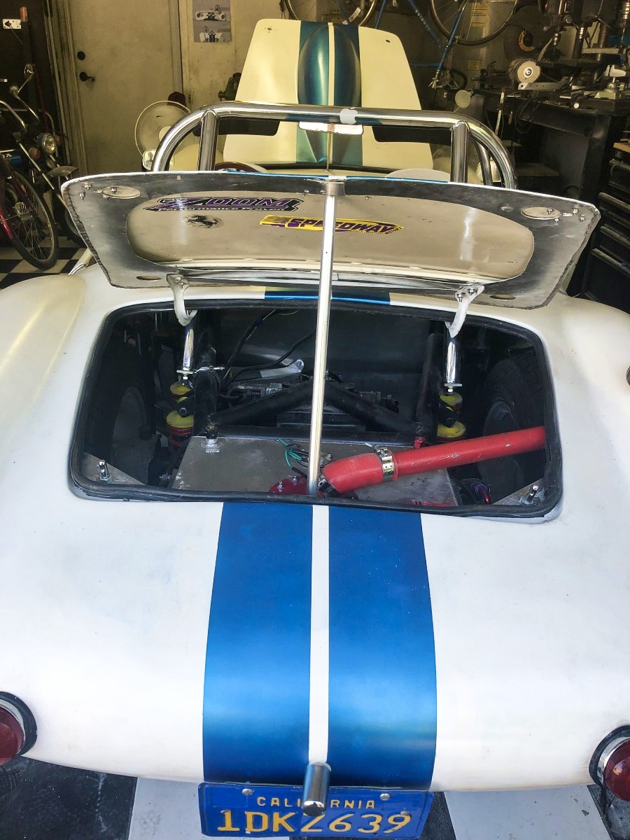 The Devin was originally designed with a Corvette-sourced V8 and transmission under the hood, and it was outrageously quick with that setup; I can’t imagine what it’s like with the Jaguar V12 under the hood. The four-speed is gone as well, with the seller having upgraded to a five-speed gearbox with a Lakewood bell housing. The Devin had all the credentials of a sports car with much purer bloodlines – knock-off wheels, disc brakes, de Dion rear end, three-spoke/wood-rimmed steering wheel, and more.