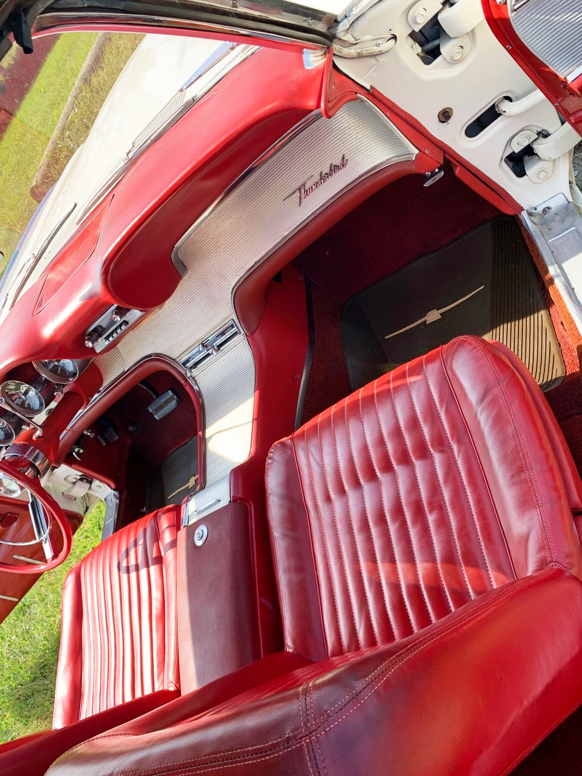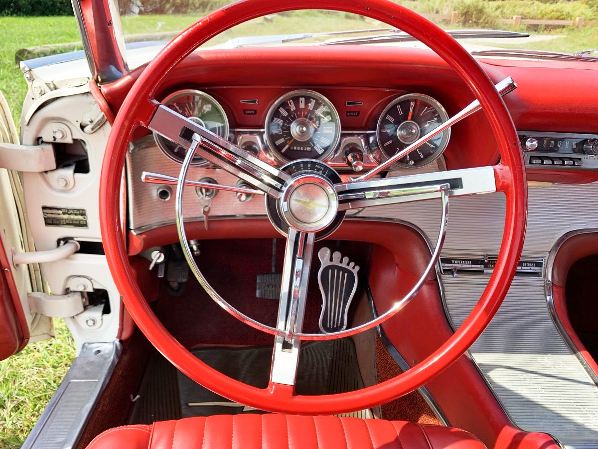 Mike, I agree on the chrome ‘foot’ gas pedal; I’d source an NOS unit instead. Those tailpipe extensions have GOT to go…they take away from what otherwise is probably the best angle of these Birds–those “afterburner” taillights!! I don’t mind that this went from black to white; at least the door jambs & underhood surrounds were painted too. My only addition I would make are period correct 2″ whitewalls–`61 was the last year mfrs. used those, and it would make this Bird pop, visually. I’m jealous of whoever gets to snag this baby!