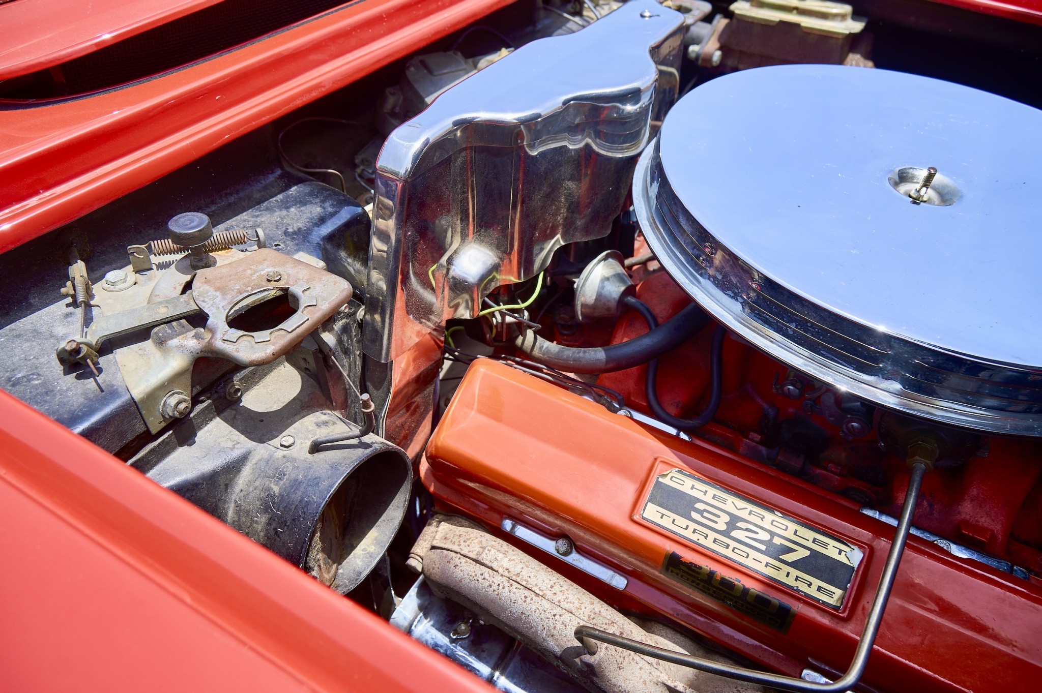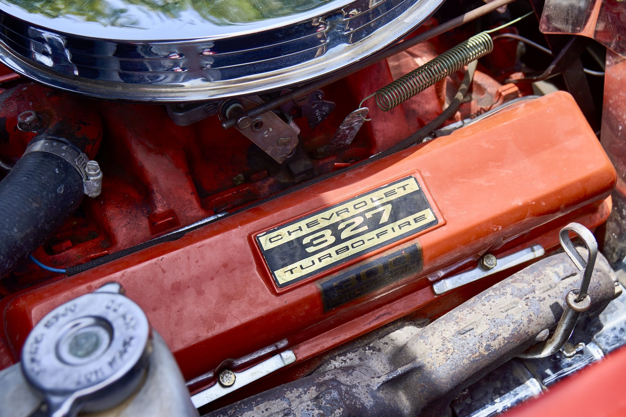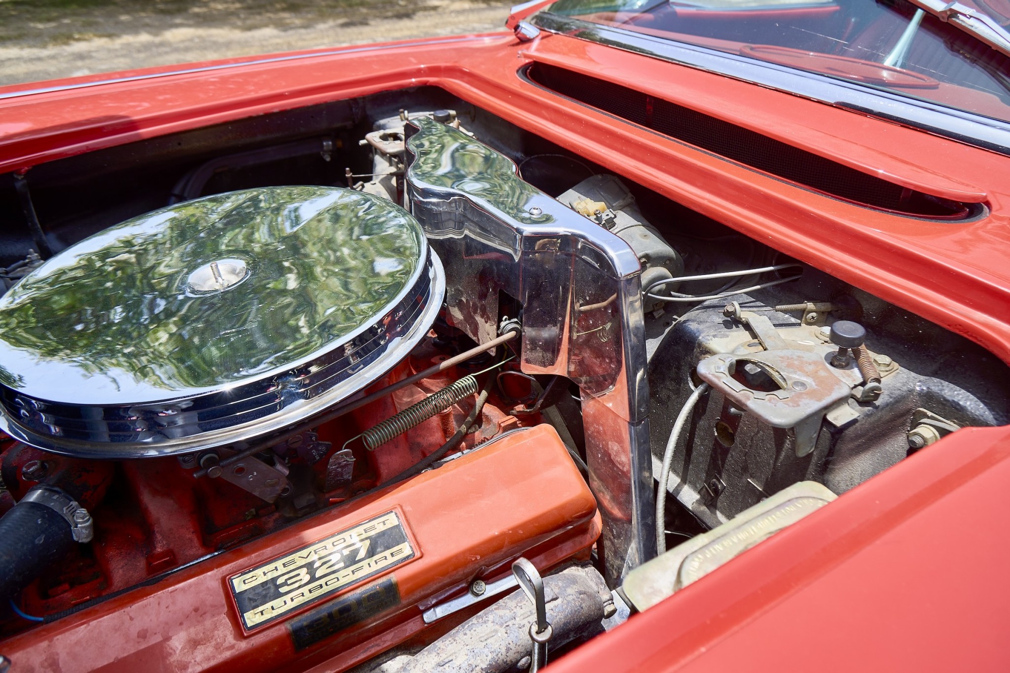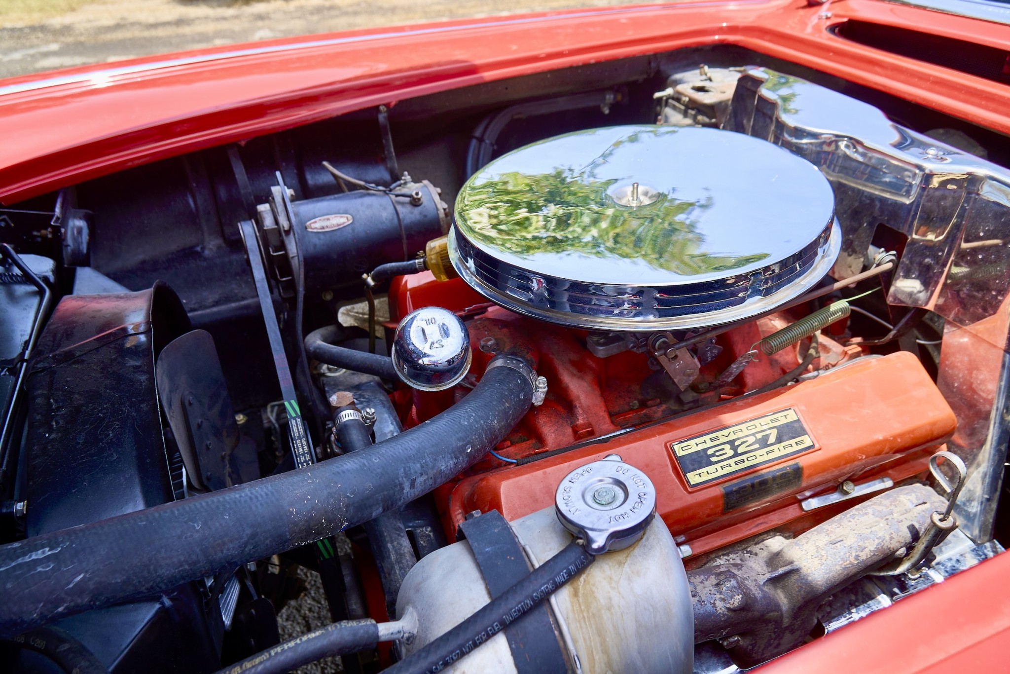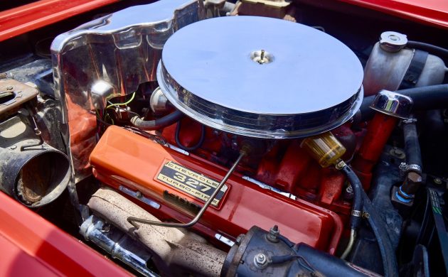 This Corvette left the factory with the base 327 V8, 3-speed manual transmission, and no radio. During the restoration, the transmission was replaced with a 4-speed close ratio manual, the rear end was upgraded to a 4:11 Positraction rear, and a period radio was installed. The original 3-speed and rear end are still with the car, so it’s next owner has the option to put it back to original, if they prefer. A previous owner installed disc brakes at all four wheels, but didn’t add a booster. The car is now a fun driver that has primarily been used in parades and car shows.