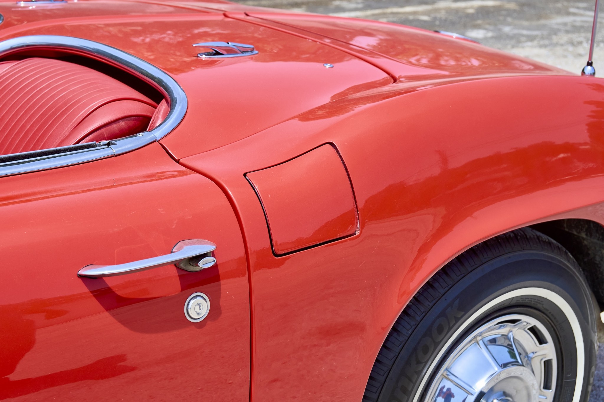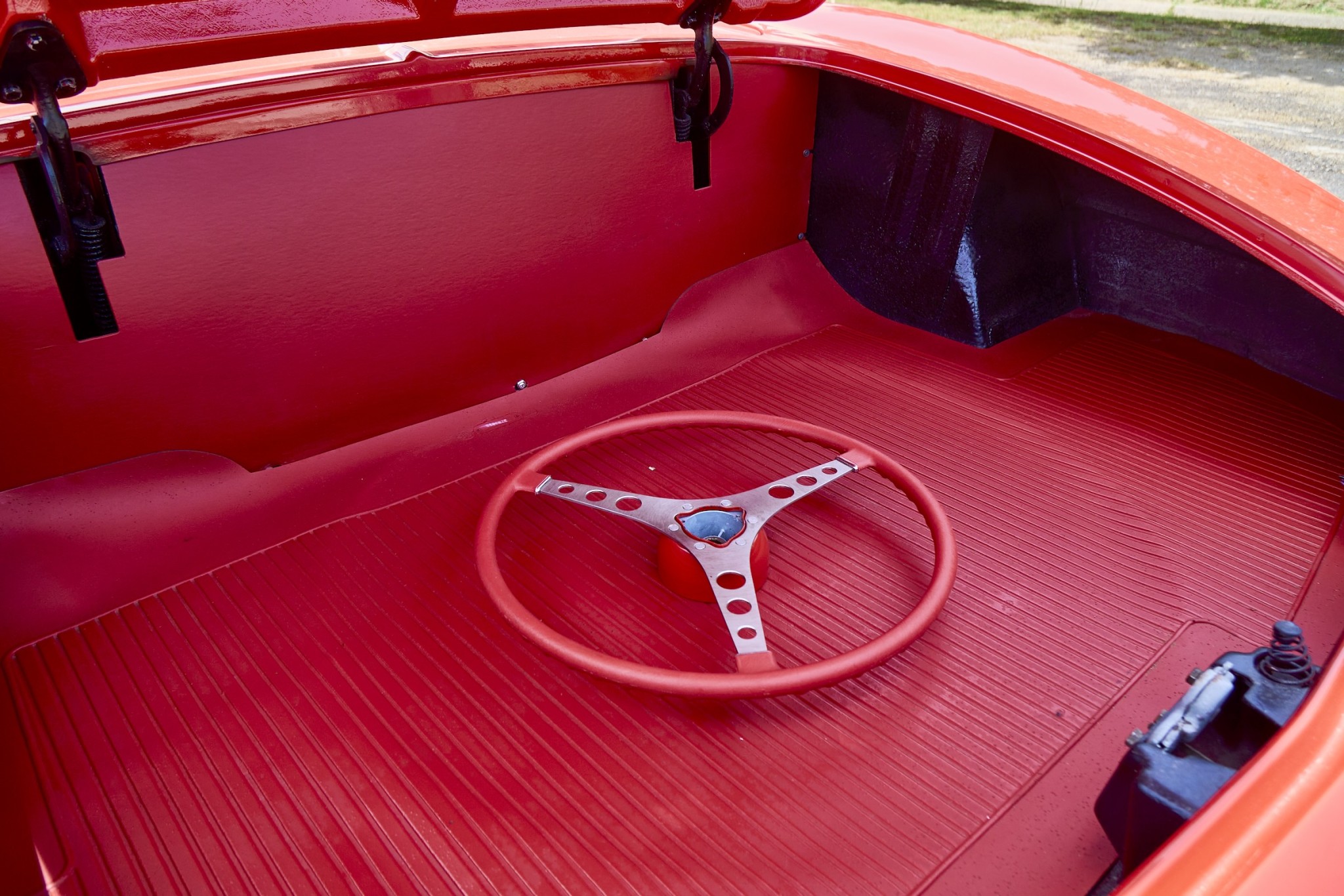 I love this quad headlamp arrangement with the updated duck tail rear. The small diameter steering wheel is no doubt functional but doesn’t look right. Probably a blast to drive with the short gears.