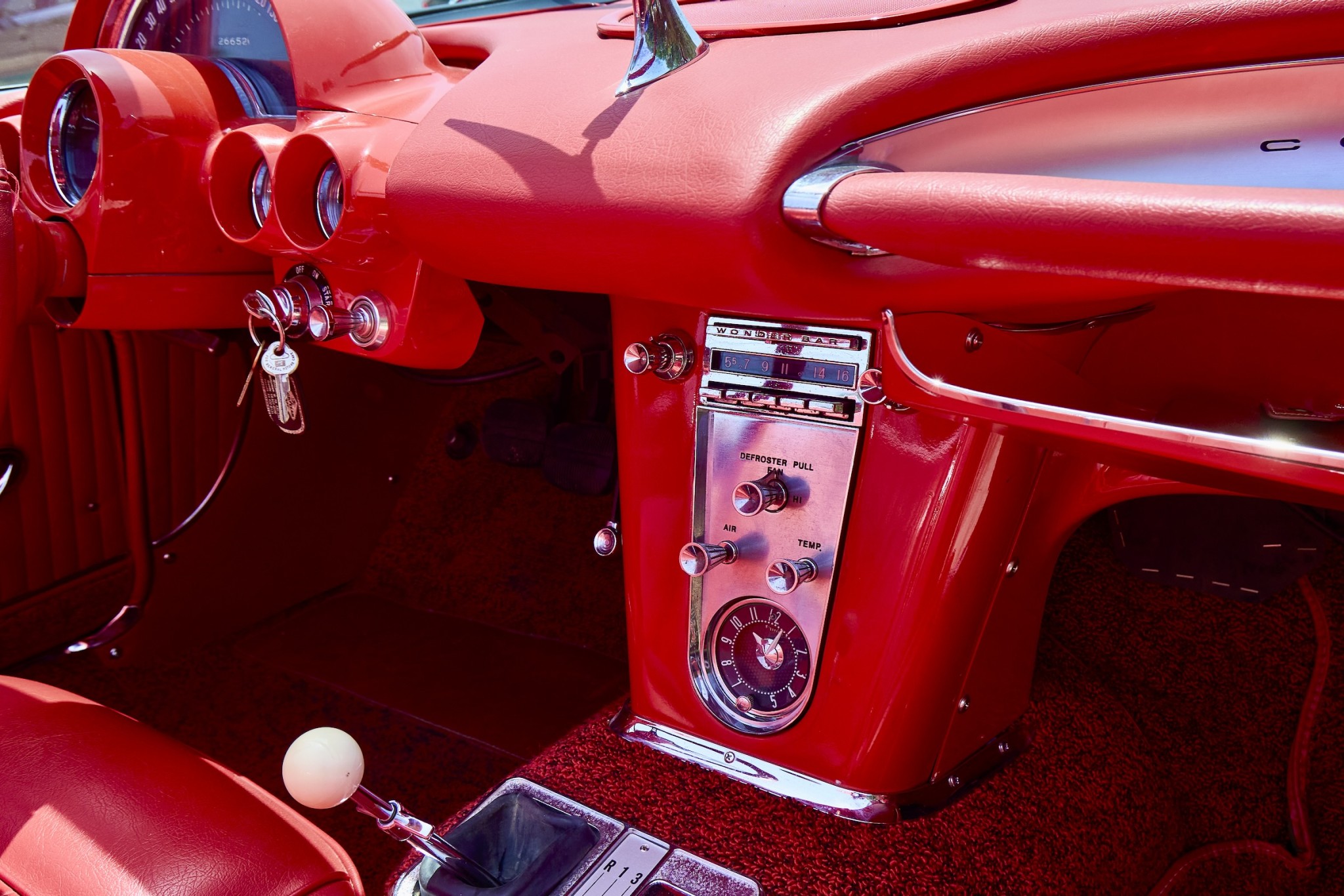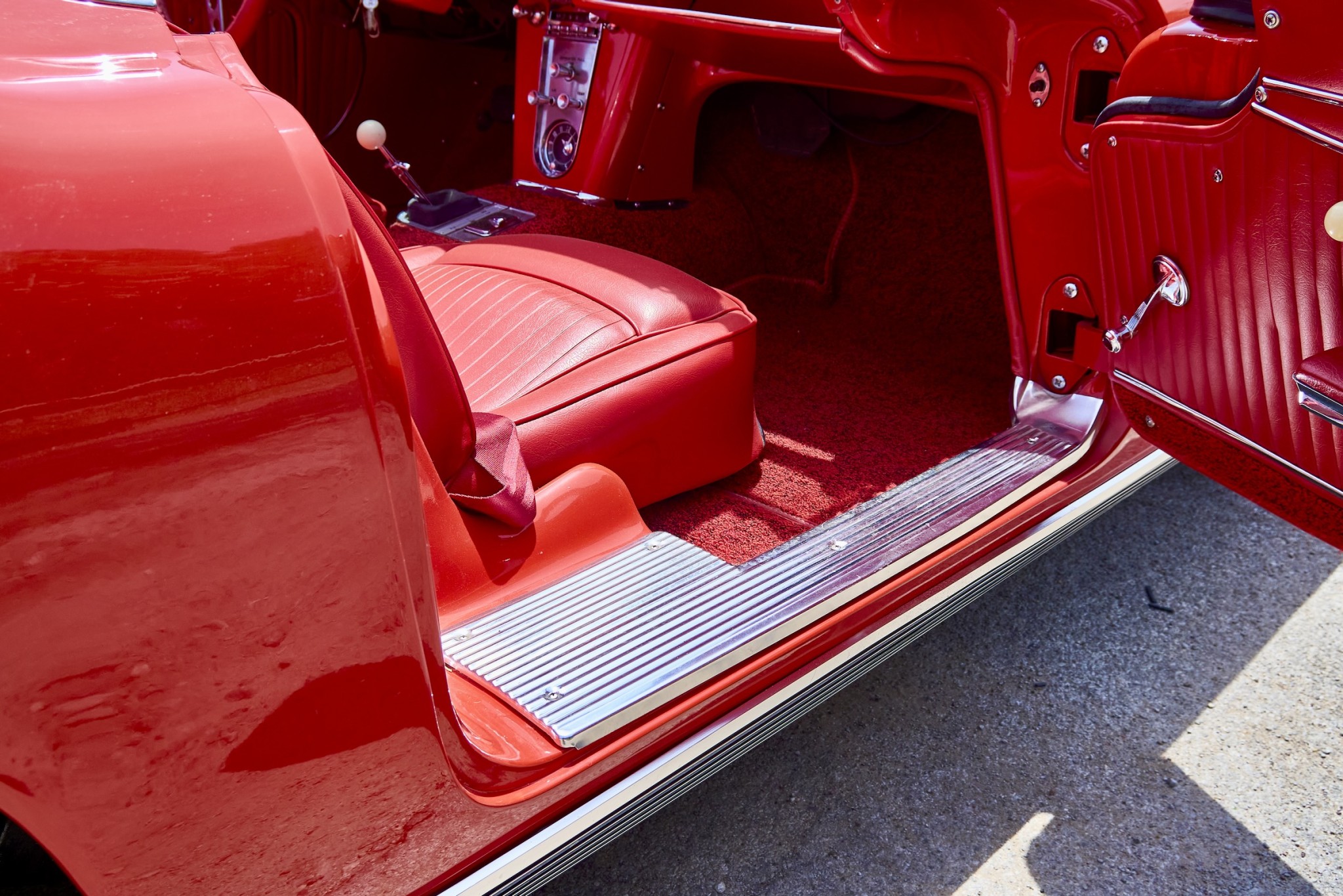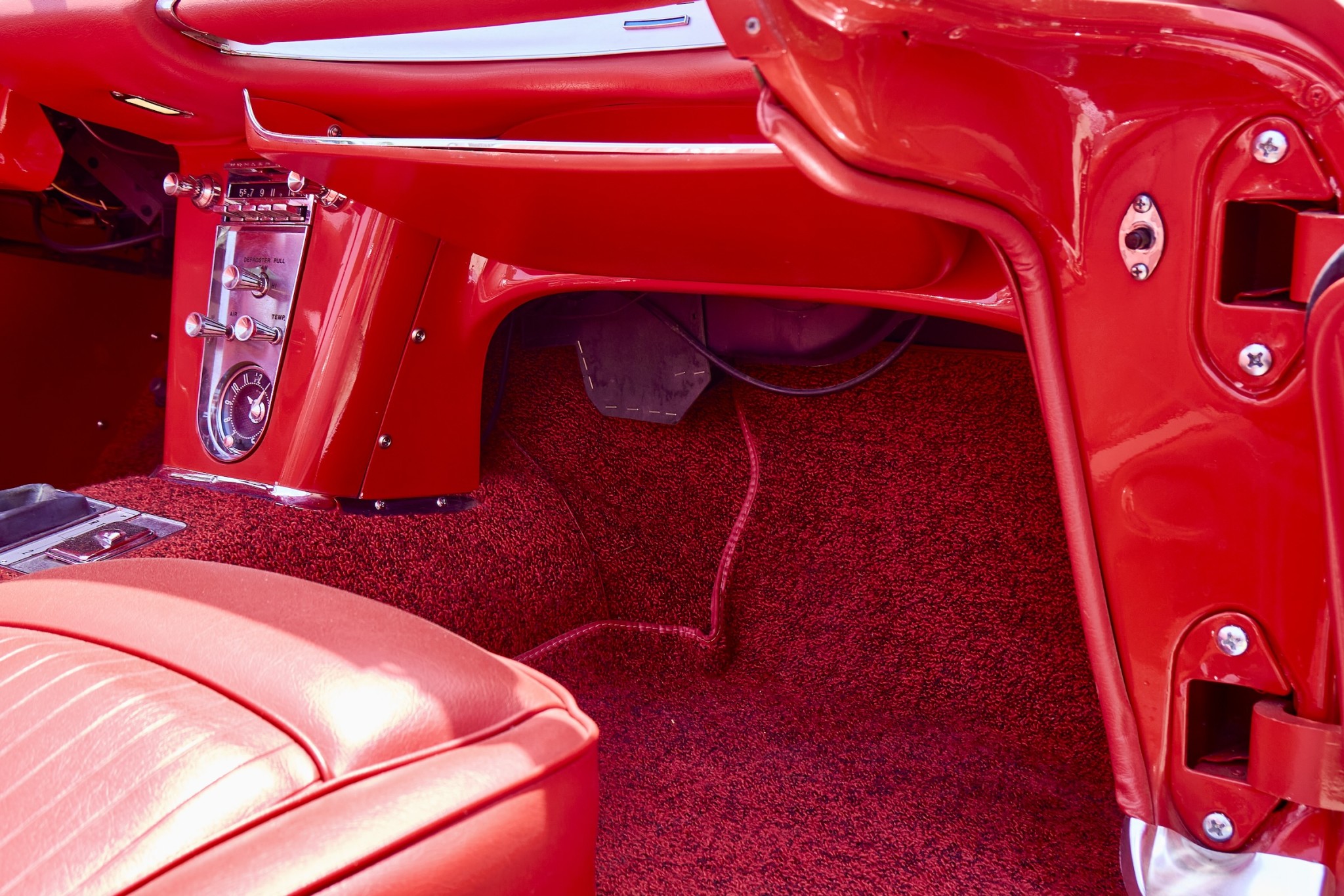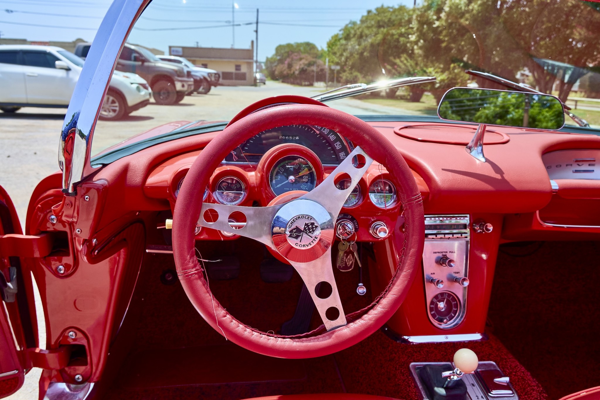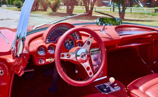 To make this Corvette more comfortable, the seller found a steering wheel and had it modified to provide more room for their legs. Some of the stitching is coming loose from the steering wheel wrap, but an unmodified steering wheel is included with the car for those who don’t need the extra space or simply want it to look original. The rest of the interior presents beautifully, without any flaws, and was clearly restored to a very high level.