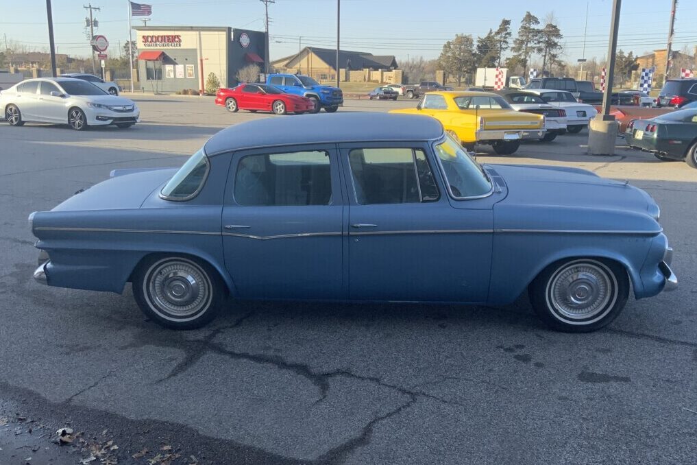 By the late 1950s, Studebaker’s financial position was perilous, with no funds available to develop a new full-size model. Management took a bold leap of faith, commissioning a compact model utilizing an existing platform and mechanical components. The first cars appeared in 1959, and the timing could not have been better. The American economy faced a slump at that time, and buyers resisted spending money on larger new cars. The compact Lark offered the same seating capacity as larger models but was cheaper and more efficient. Ford, GM, and Chrysler had no viable competitors, meaning Studebaker was the lone operator in that market niche. The Second Generation Lark appeared in 1962 and was more of a facelift than an entirely new model. The company offered several versions, with our feature car 1-of-49,961 four-door sedans produced that year. It wears Riviera Blue paint that is consistent across the entire vehicle. There are no signs of significant patchiness, and it holds a respectable shine for a classic with sixty-one years under its belt. Treating the exterior to a repaint would make a significant difference, but the buyer could perform the work as time and circumstances allow. The panels are free from major bumps and bruises, and there is no evidence of rust. The Lark retains its original hubcaps and exterior trim, and, like the glass, its condition is excellent for a survivor-grade car.