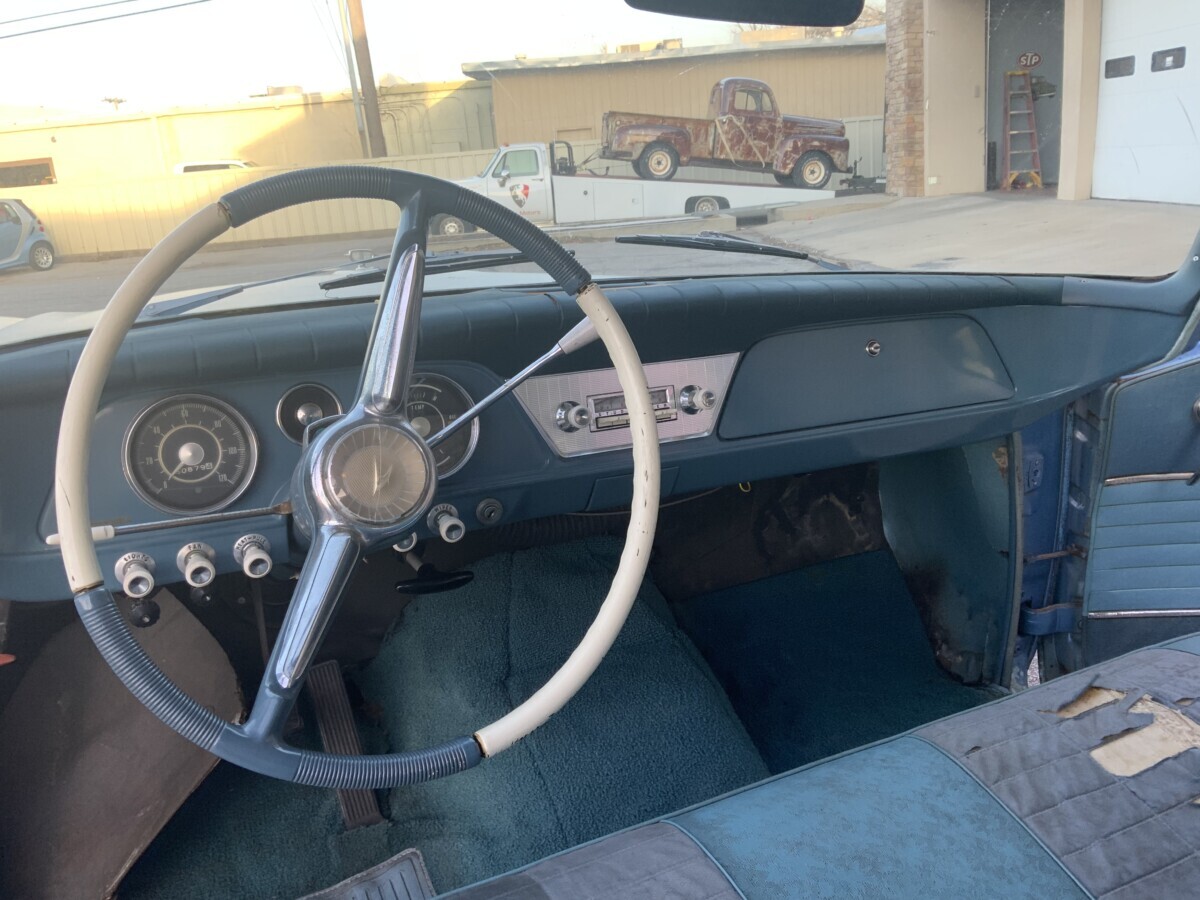 The seller should have looked closer before stating this clean little Lark is the original Riviera Blue, a solid color (non-metallic) when clearly you can see it was repainted Silver Blue Metallic like a ’63 Stude. the center of the Firewall shows the original Baby Blue Color.