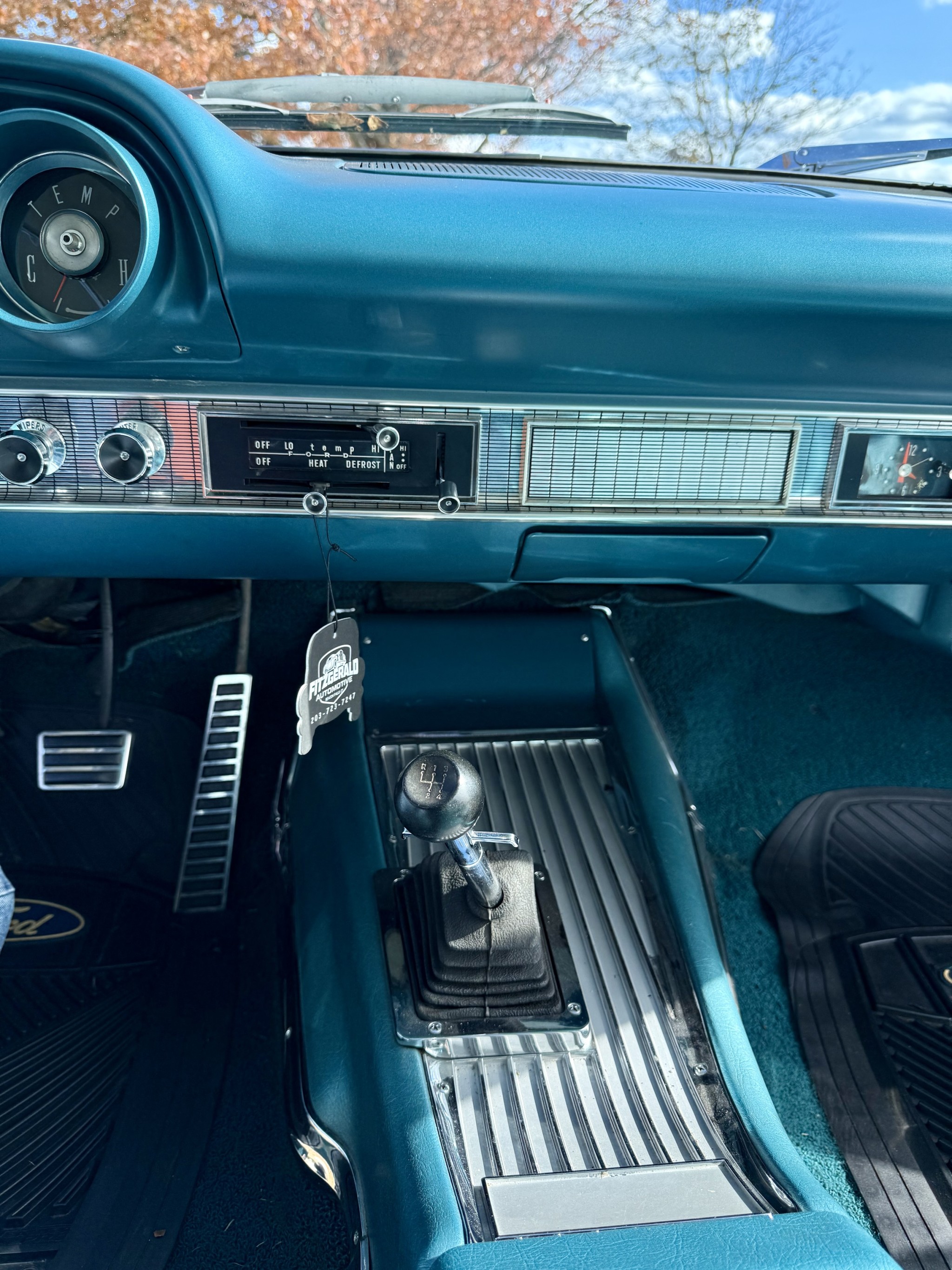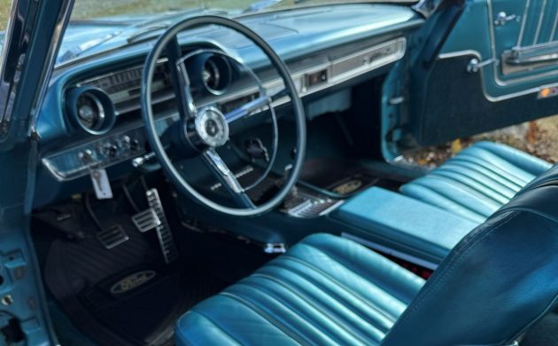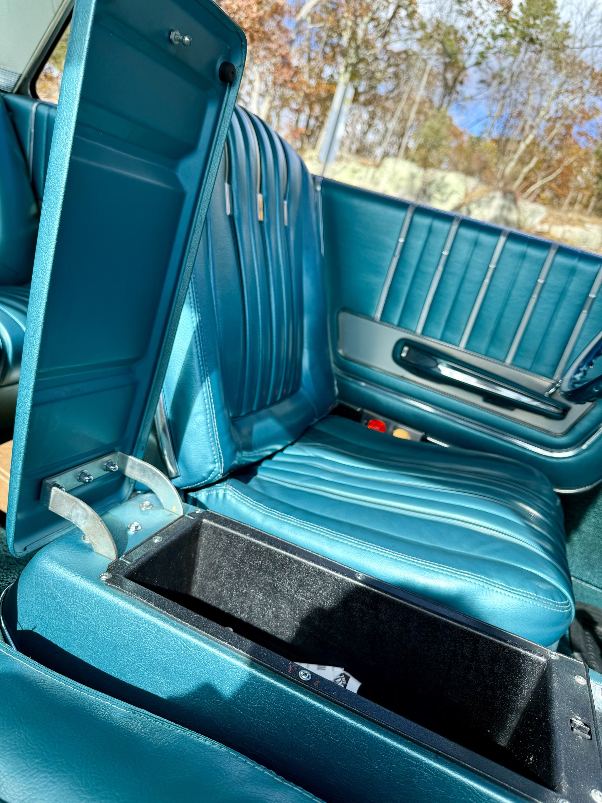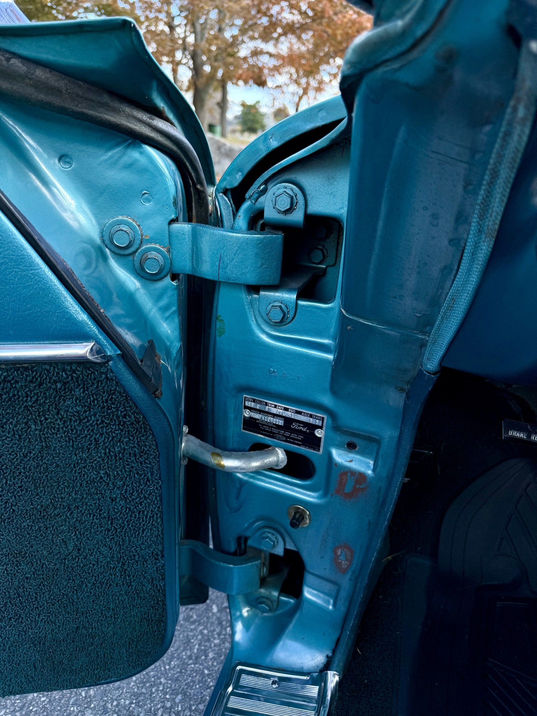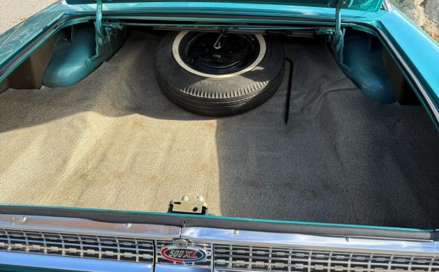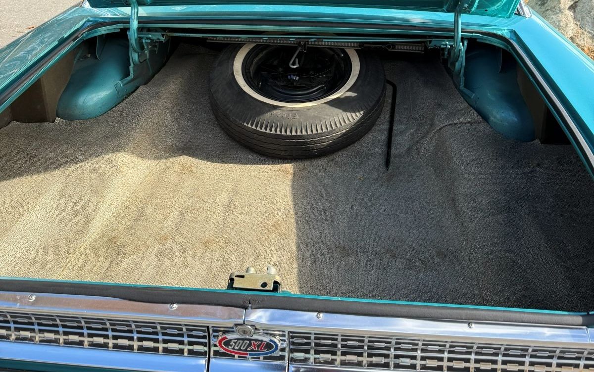 Perhaps more unusual than the two-barrel/four-speed combination is the fact that the original owner didn’t order a radio, so you’ll find a radio-blanking plate that would have been more at home in a Ford 300 than a top-of-the-line Galaxie. The interior trim is code 87 (Light Turquoise), and it’s a dazzling combination with the car’s Ming Green Metallic paint.
