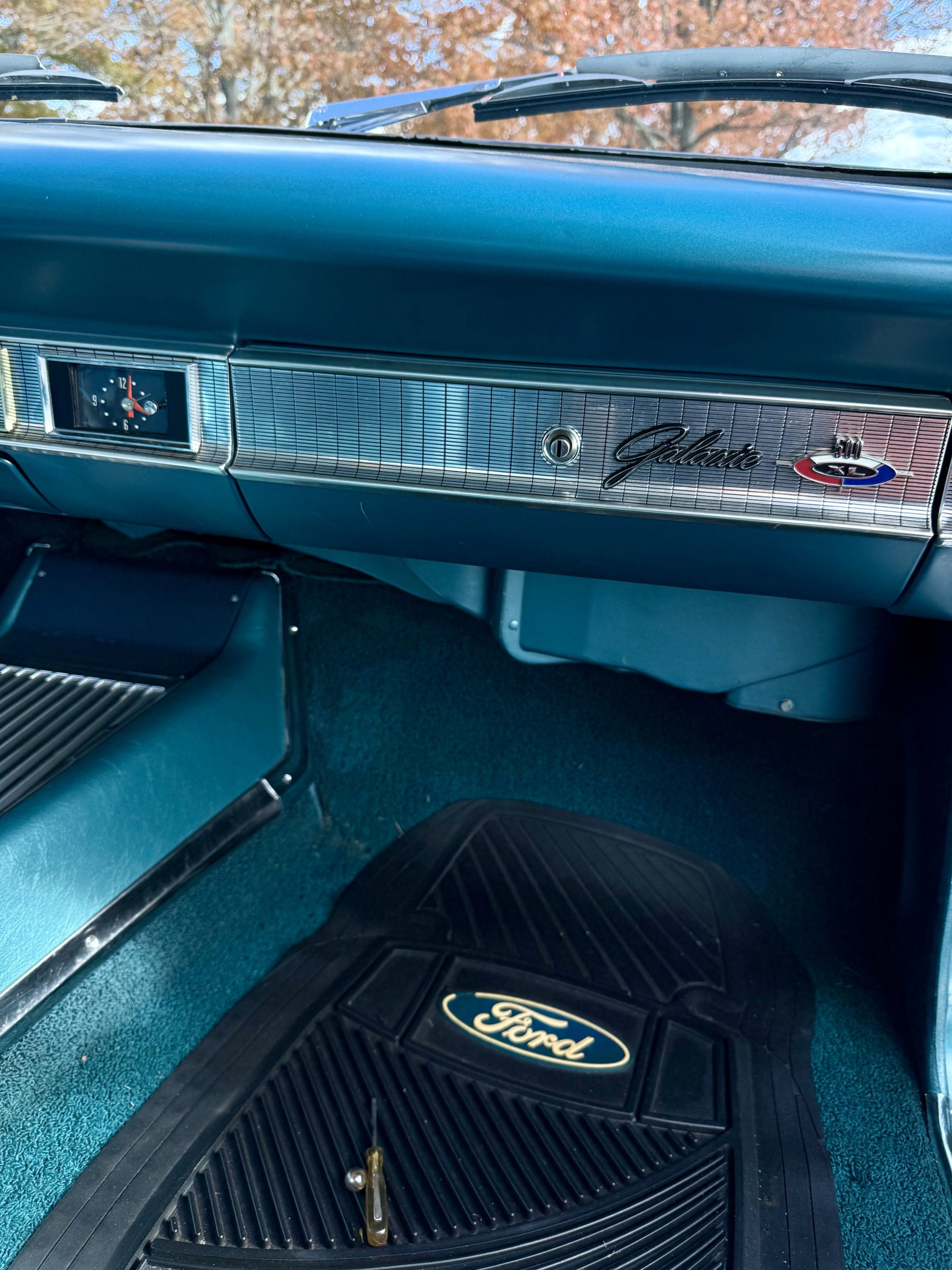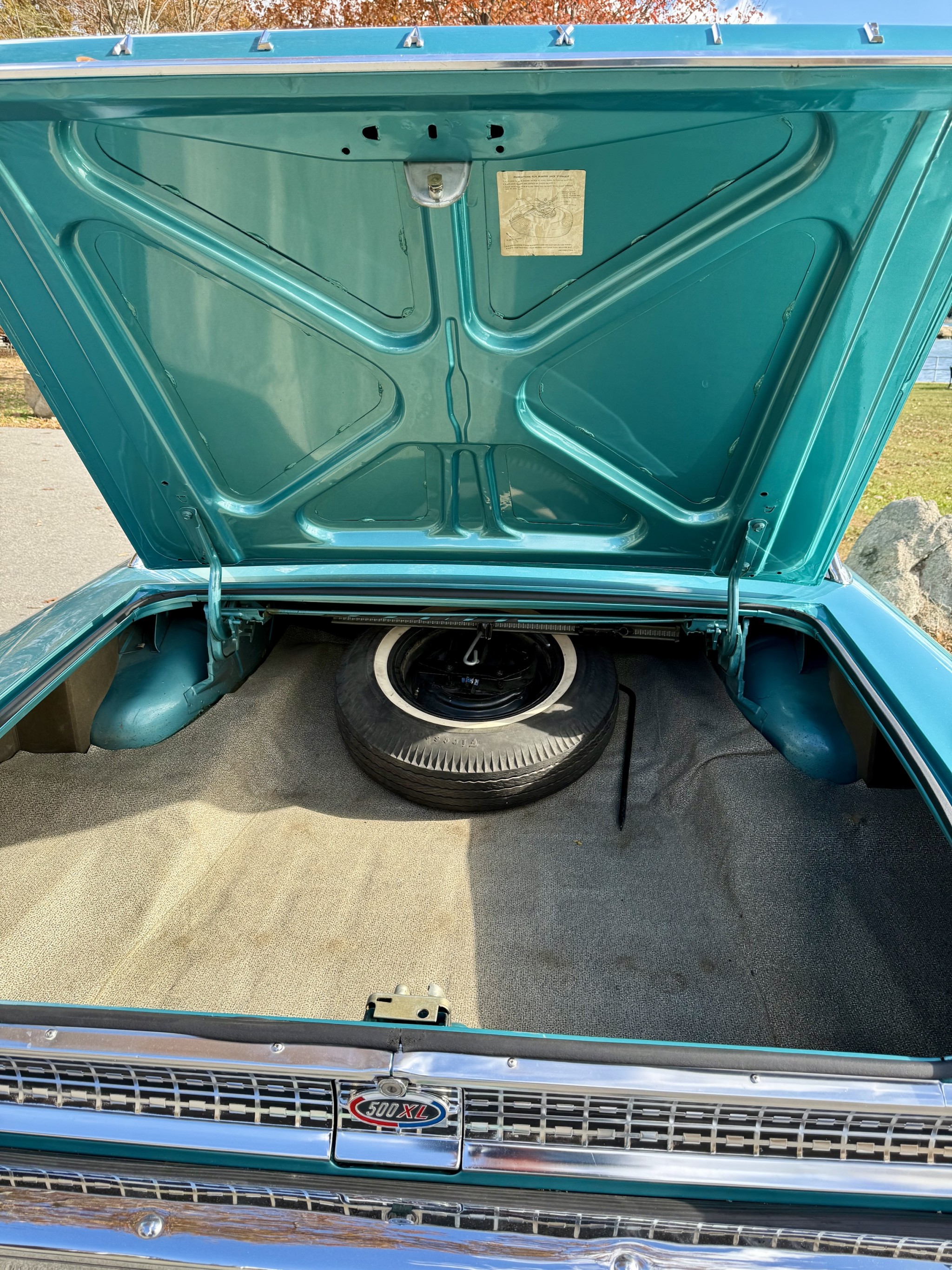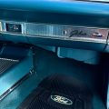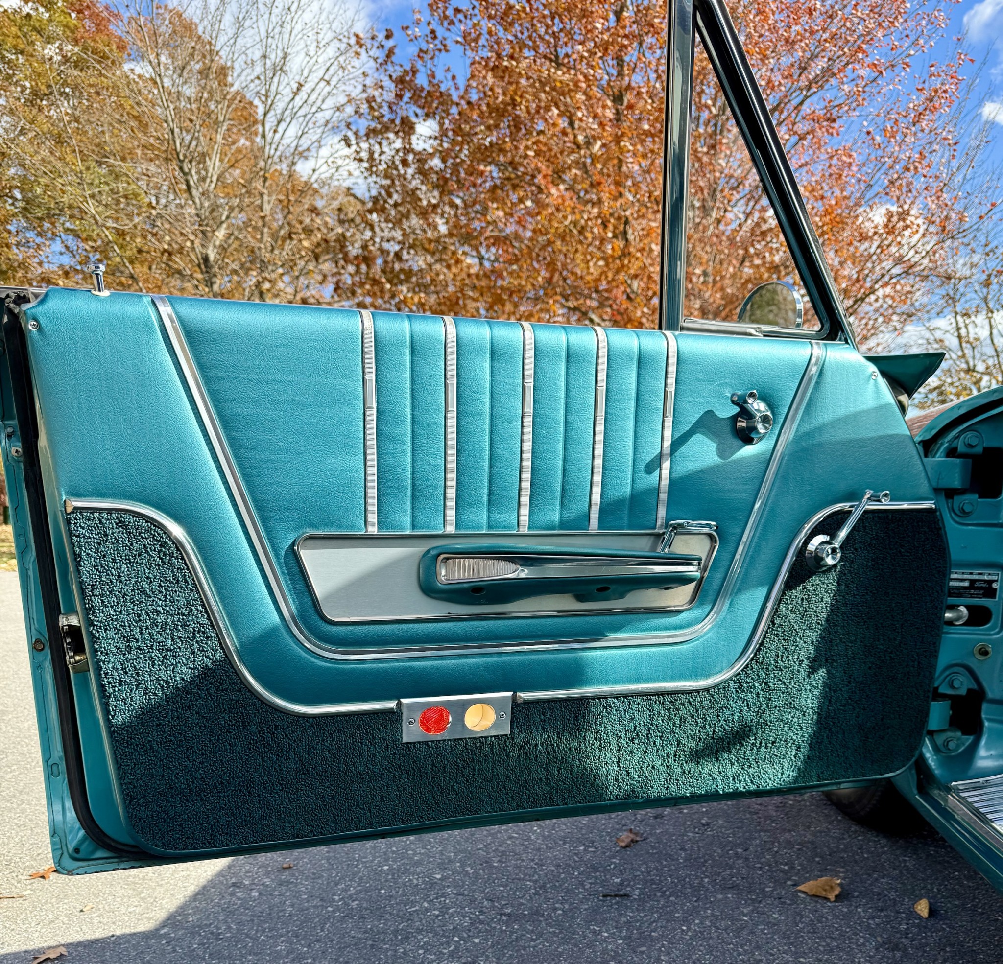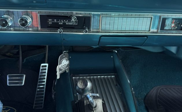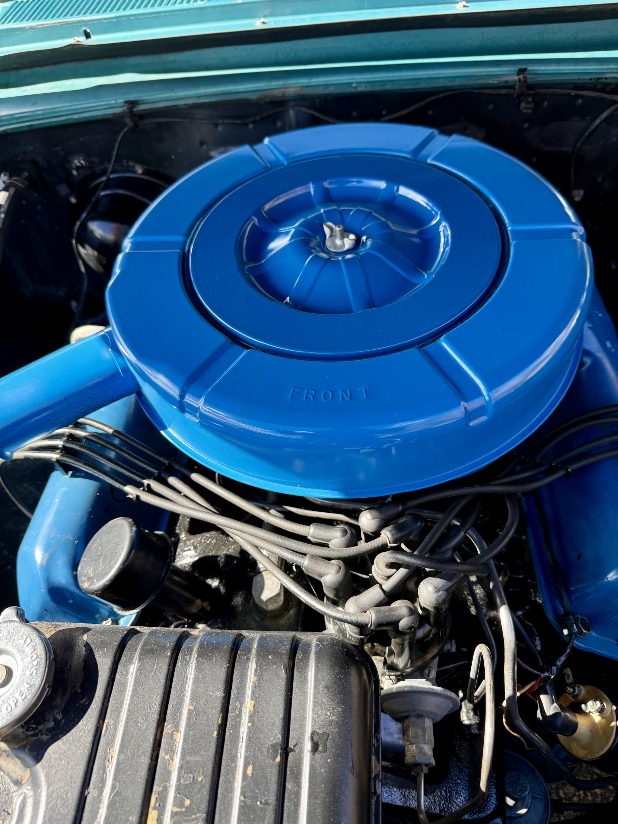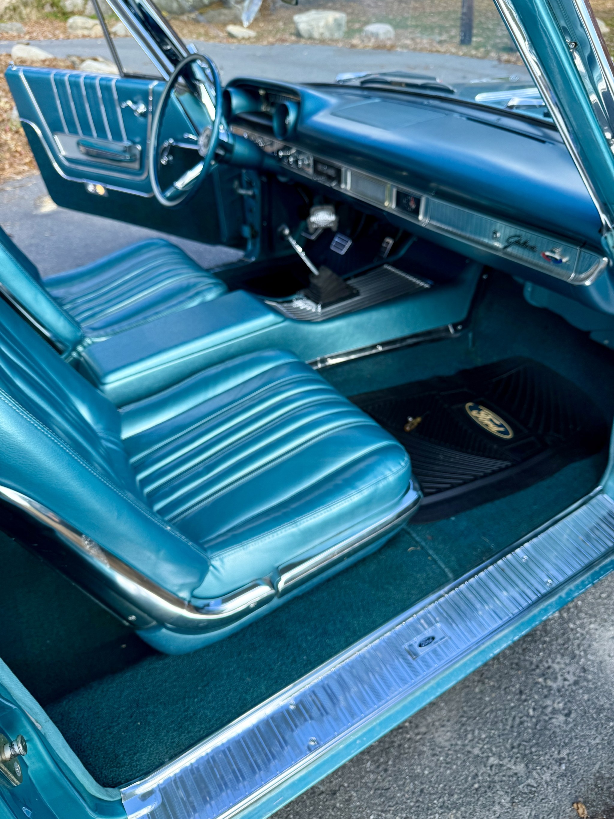 Perhaps more unusual than the two-barrel/four-speed combination is the fact that the original owner didn’t order a radio, so you’ll find a radio-blanking plate that would have been more at home in a Ford 300 than a top-of-the-line Galaxie. The interior trim is code 87 (Light Turquoise), and it’s a dazzling combination with the car’s Ming Green Metallic paint.