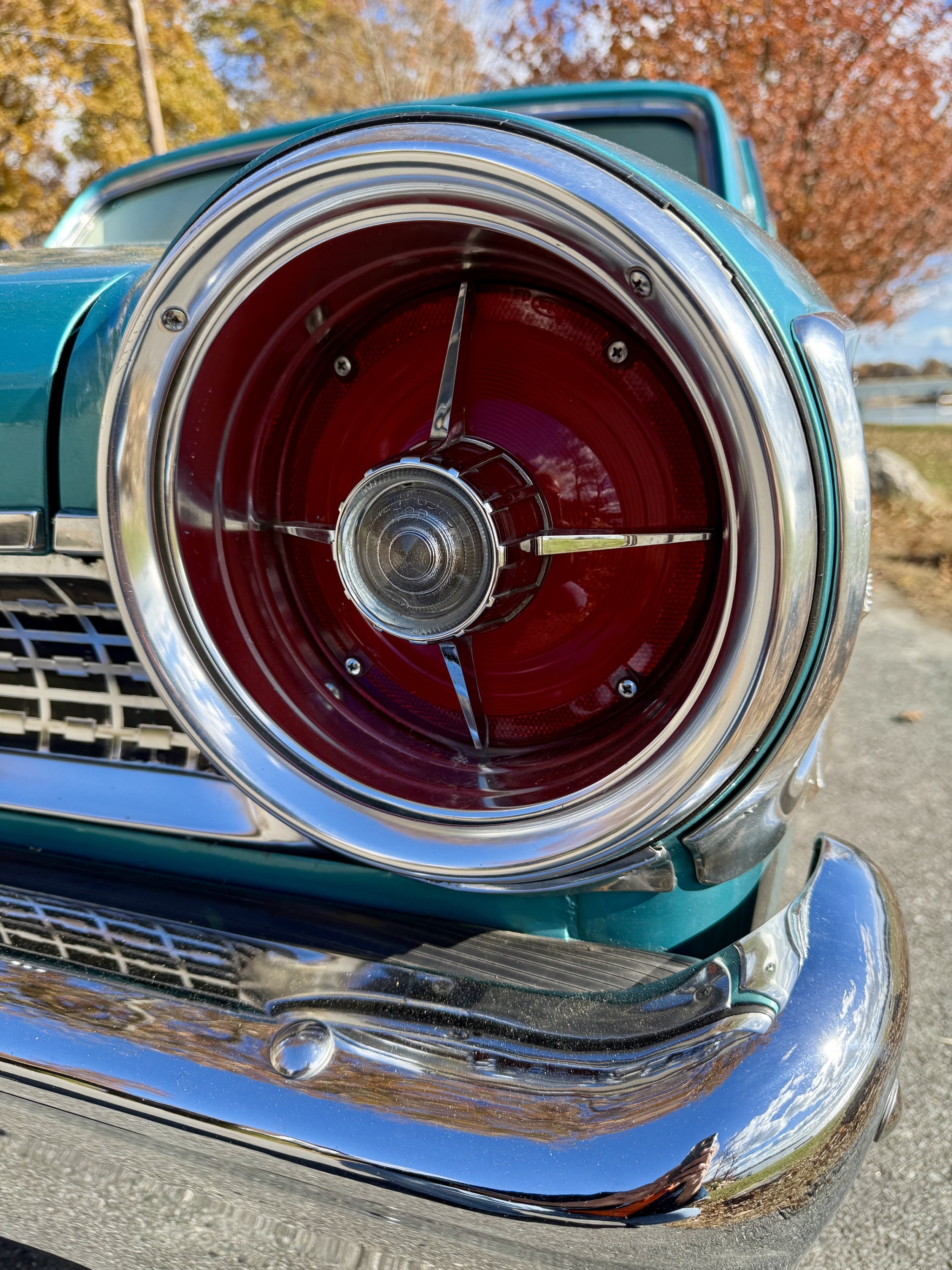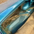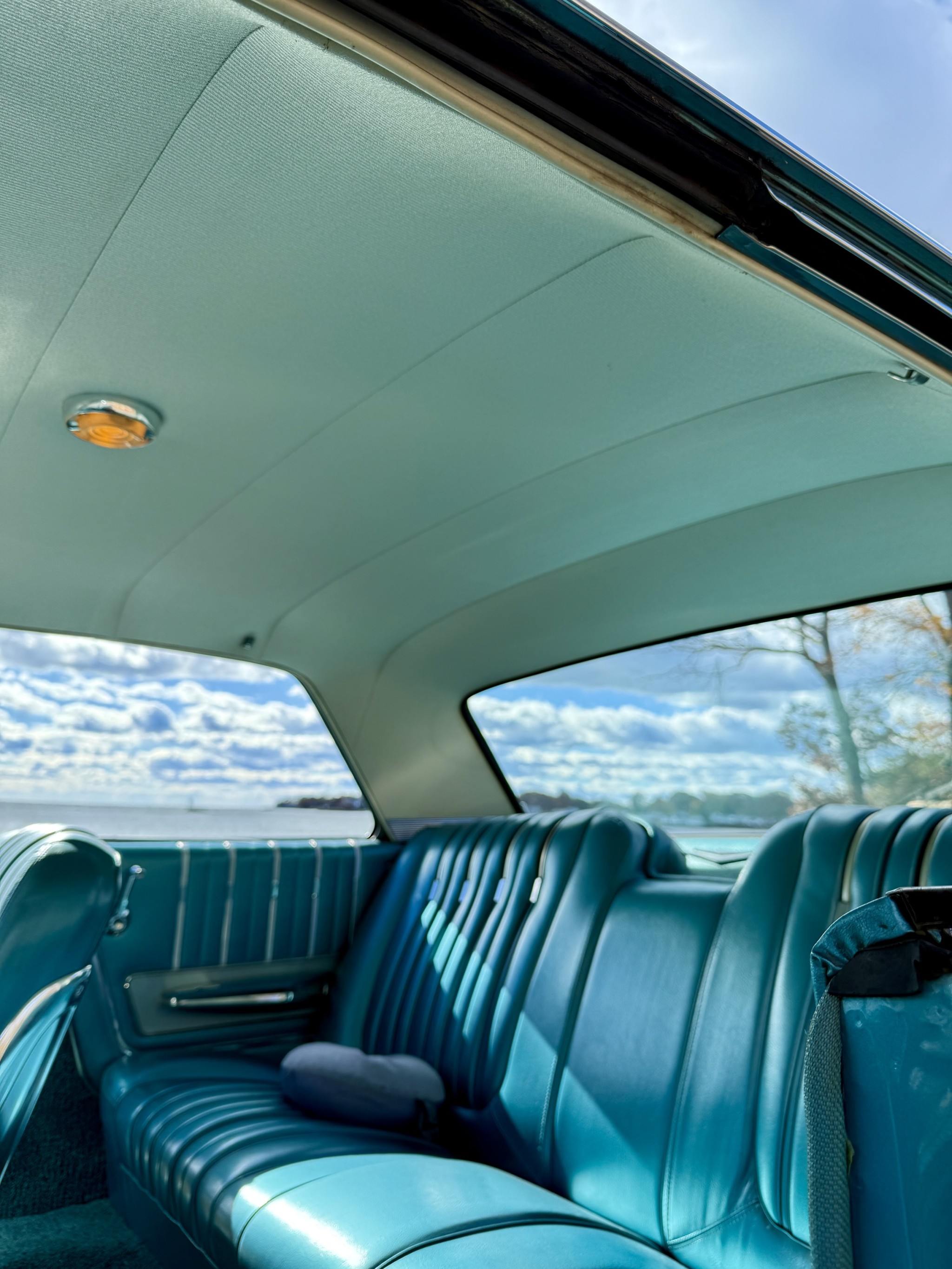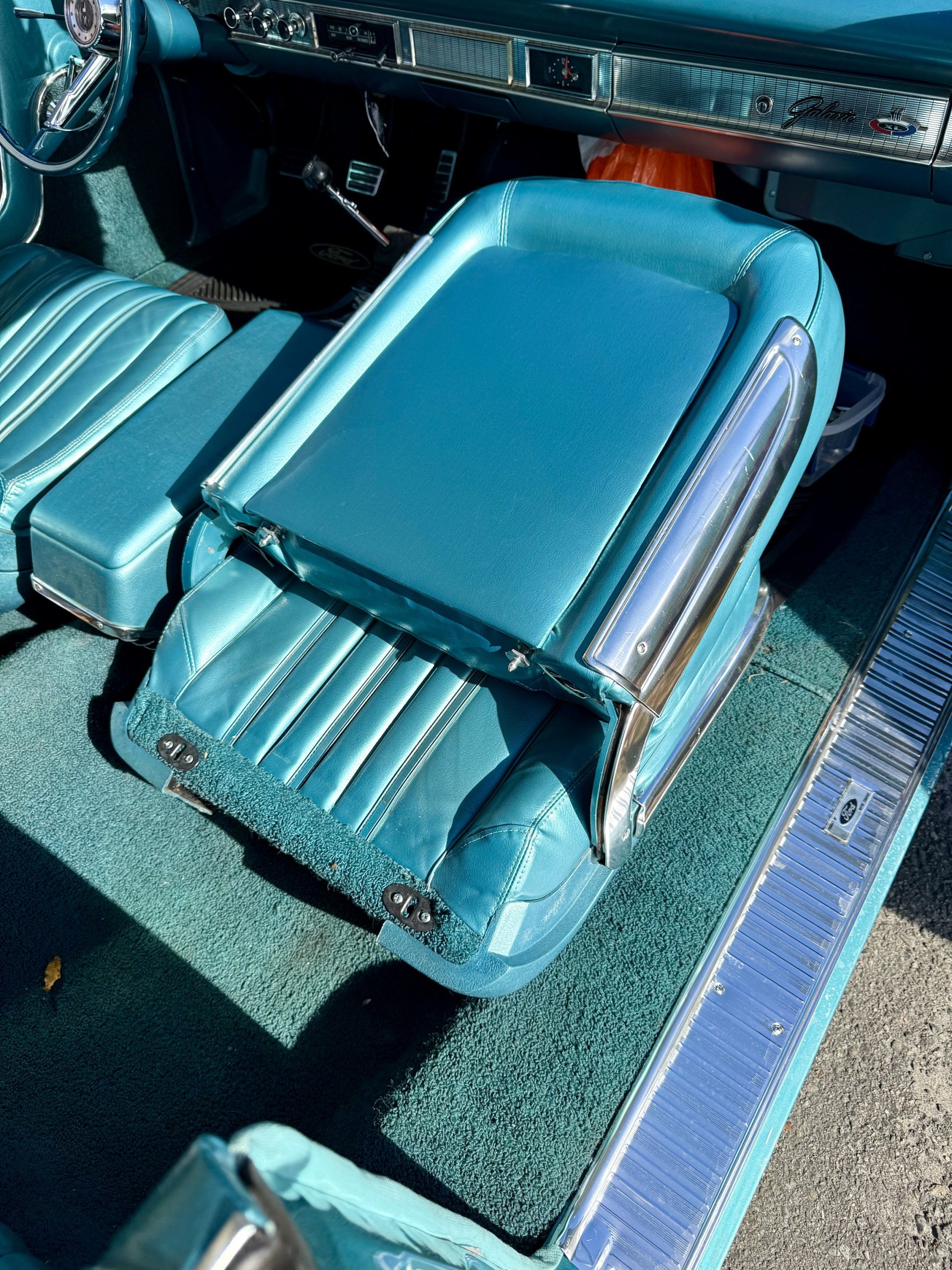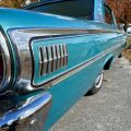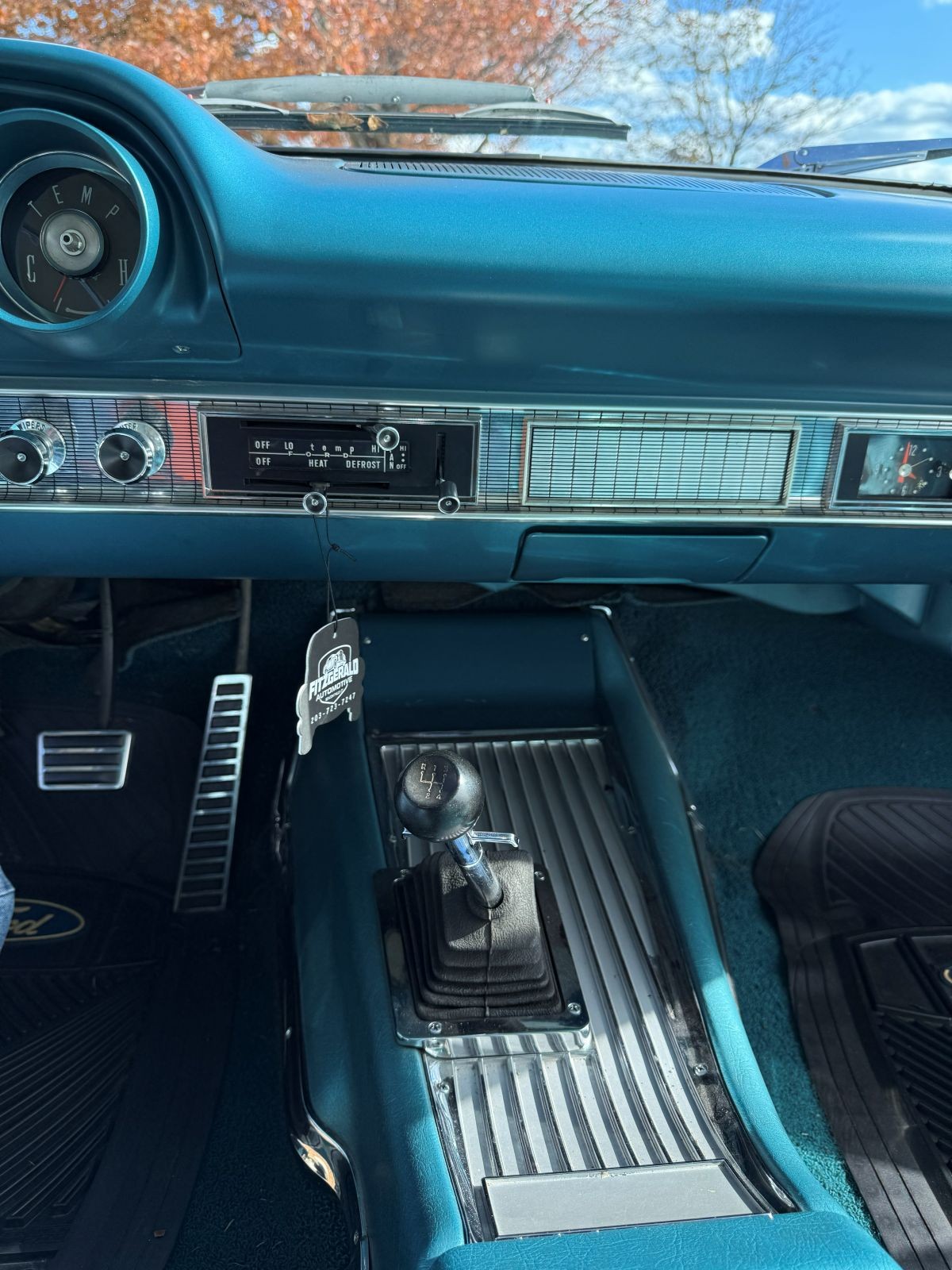 Perhaps more unusual than the two-barrel/four-speed combination is the fact that the original owner didn’t order a radio, so you’ll find a radio-blanking plate that would have been more at home in a Ford 300 than a top-of-the-line Galaxie. The interior trim is code 87 (Light Turquoise), and it’s a dazzling combination with the car’s Ming Green Metallic paint.