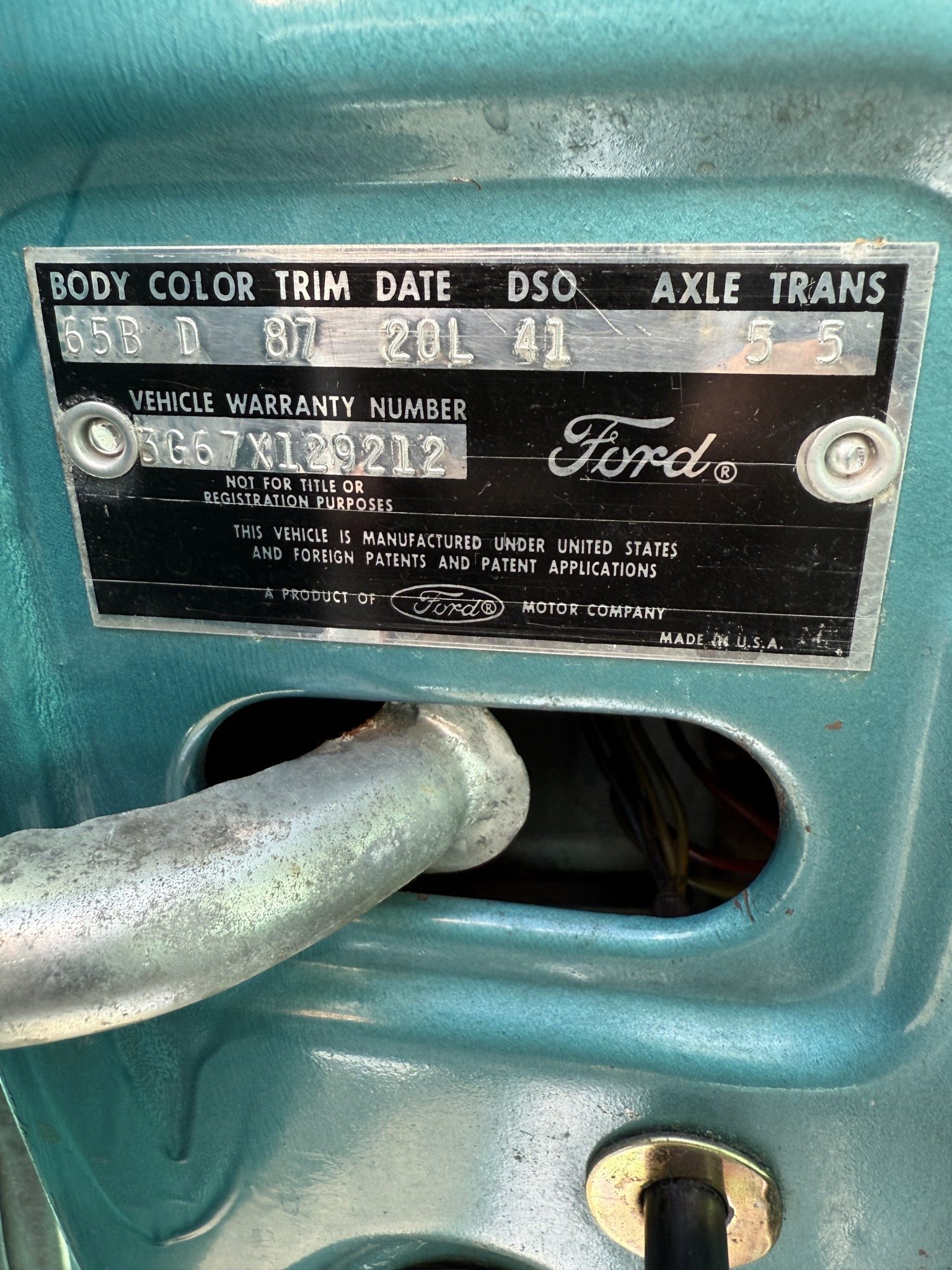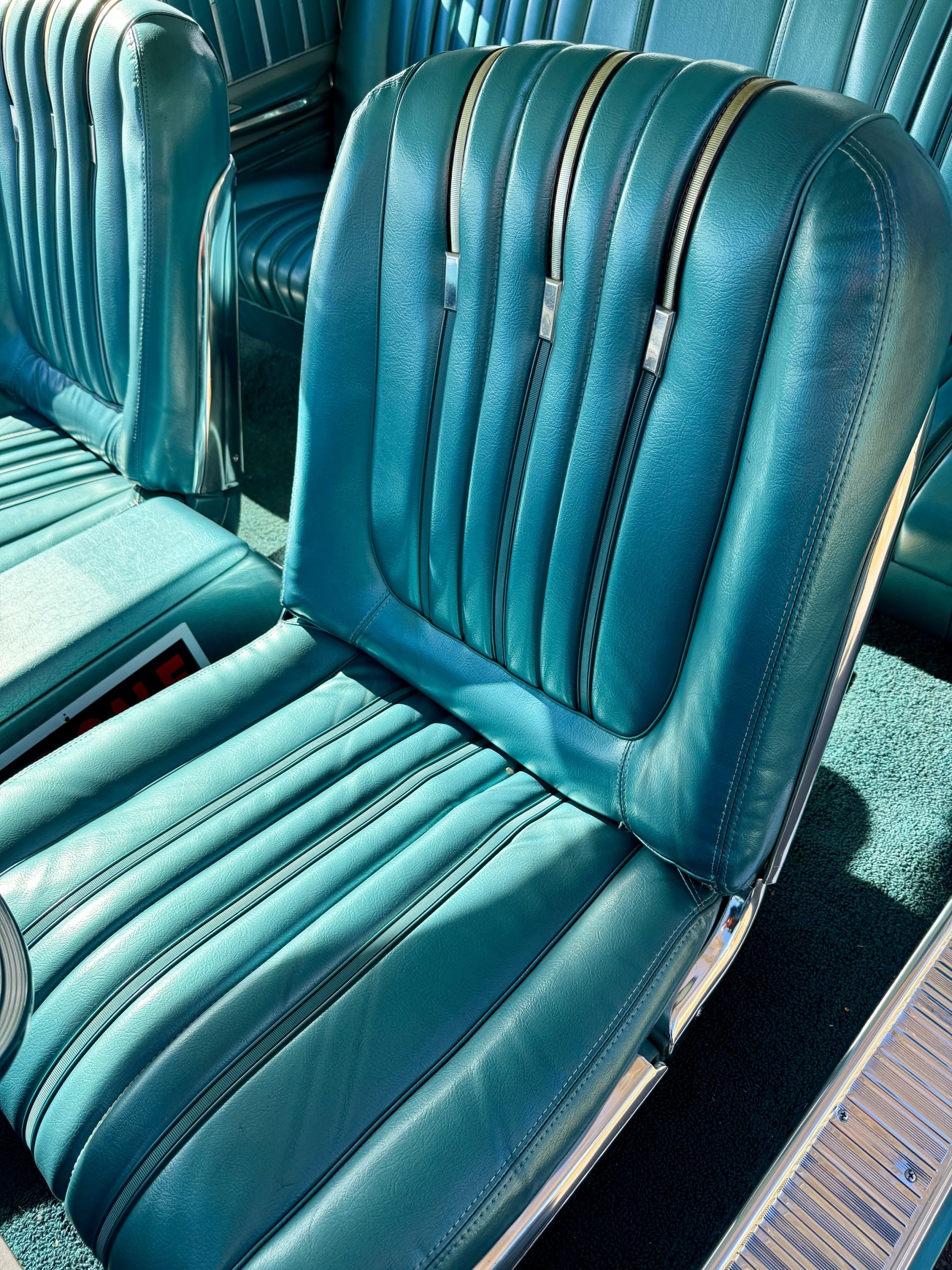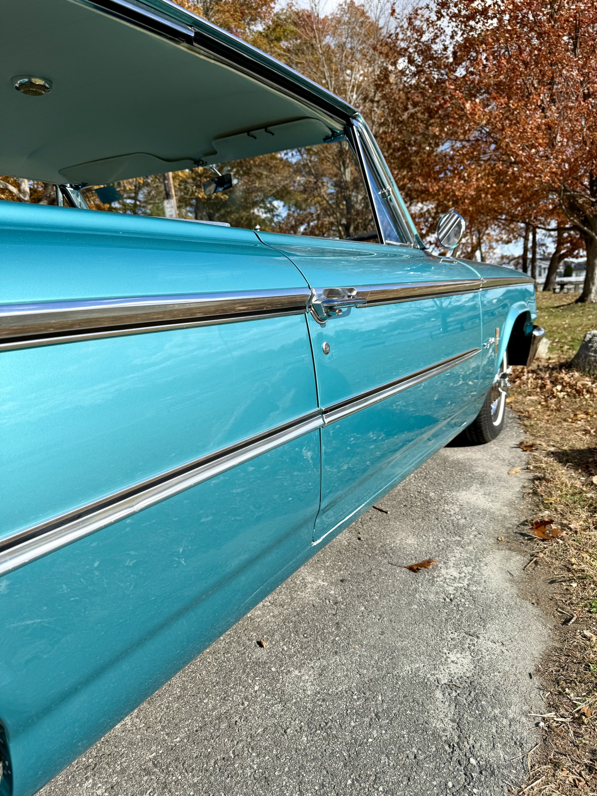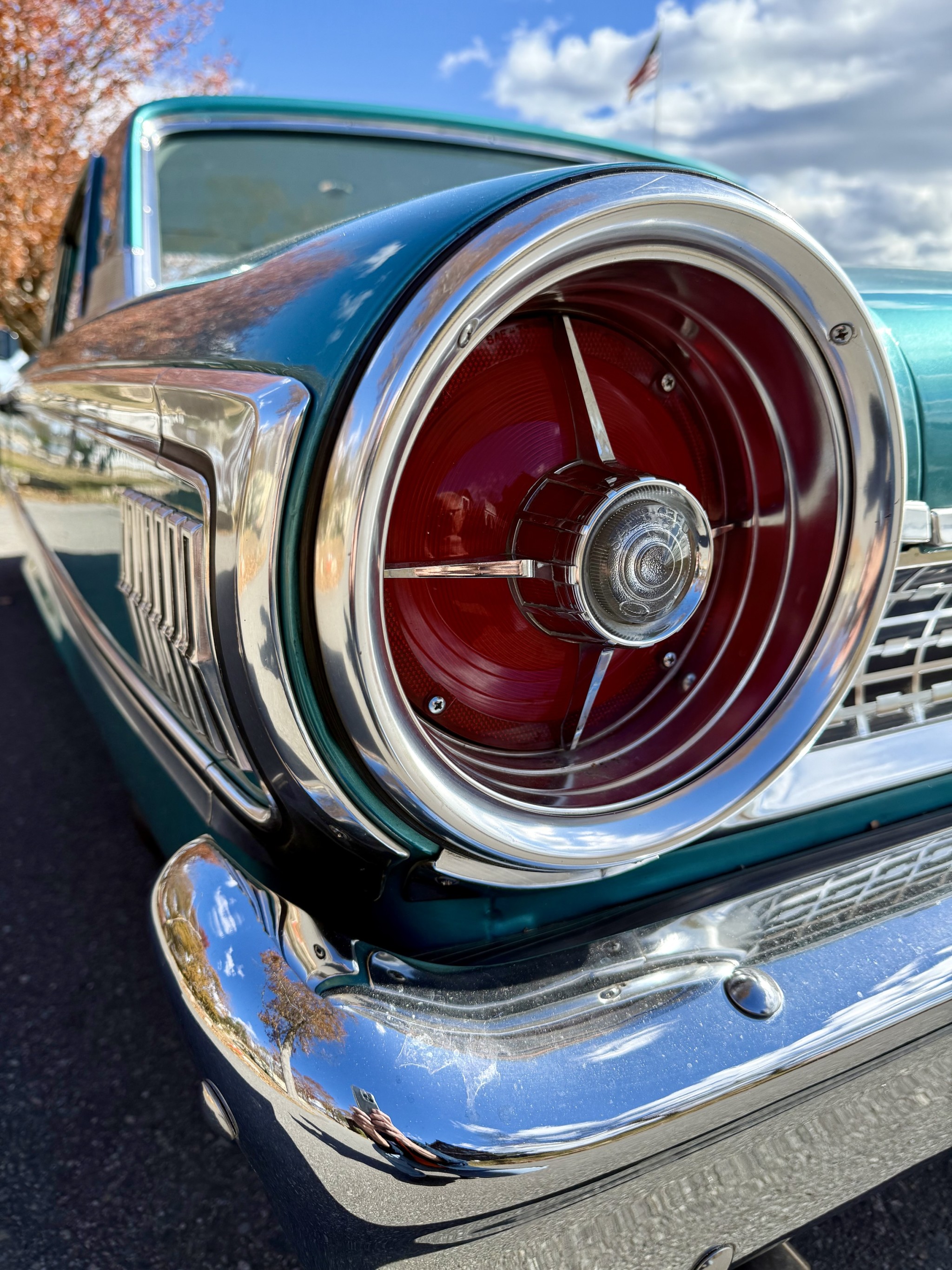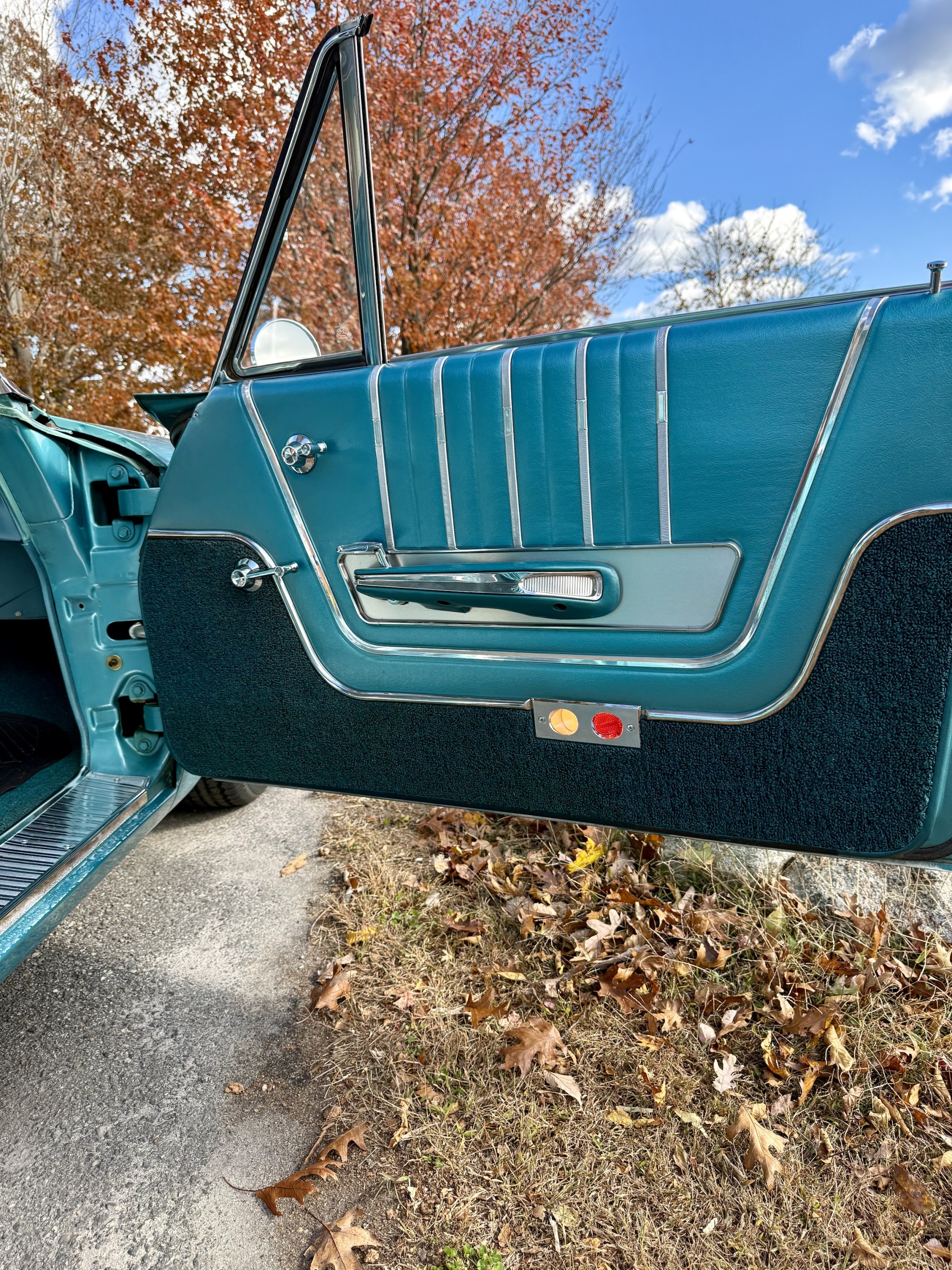 Perhaps more unusual than the two-barrel/four-speed combination is the fact that the original owner didn’t order a radio, so you’ll find a radio-blanking plate that would have been more at home in a Ford 300 than a top-of-the-line Galaxie. The interior trim is code 87 (Light Turquoise), and it’s a dazzling combination with the car’s Ming Green Metallic paint.