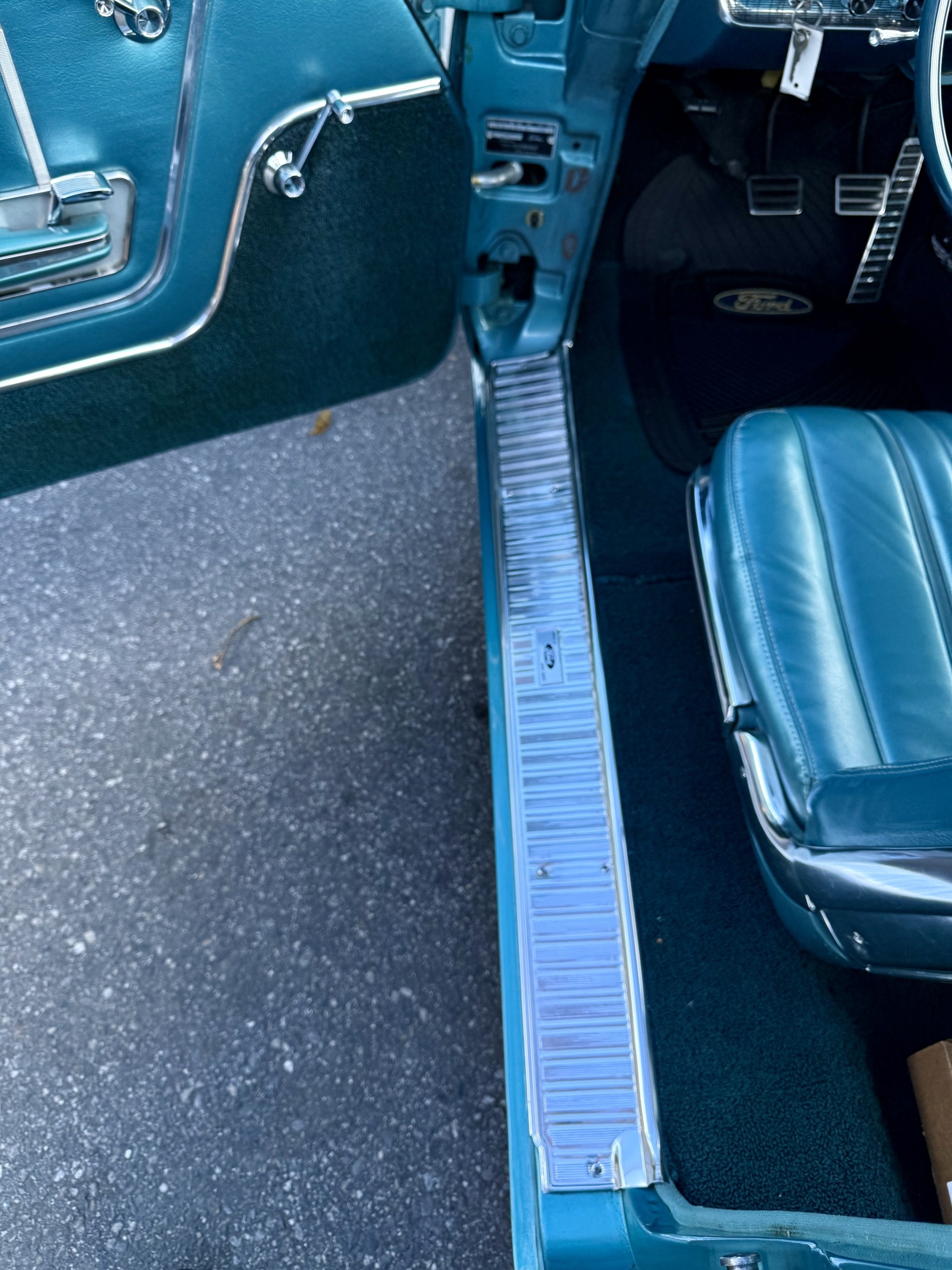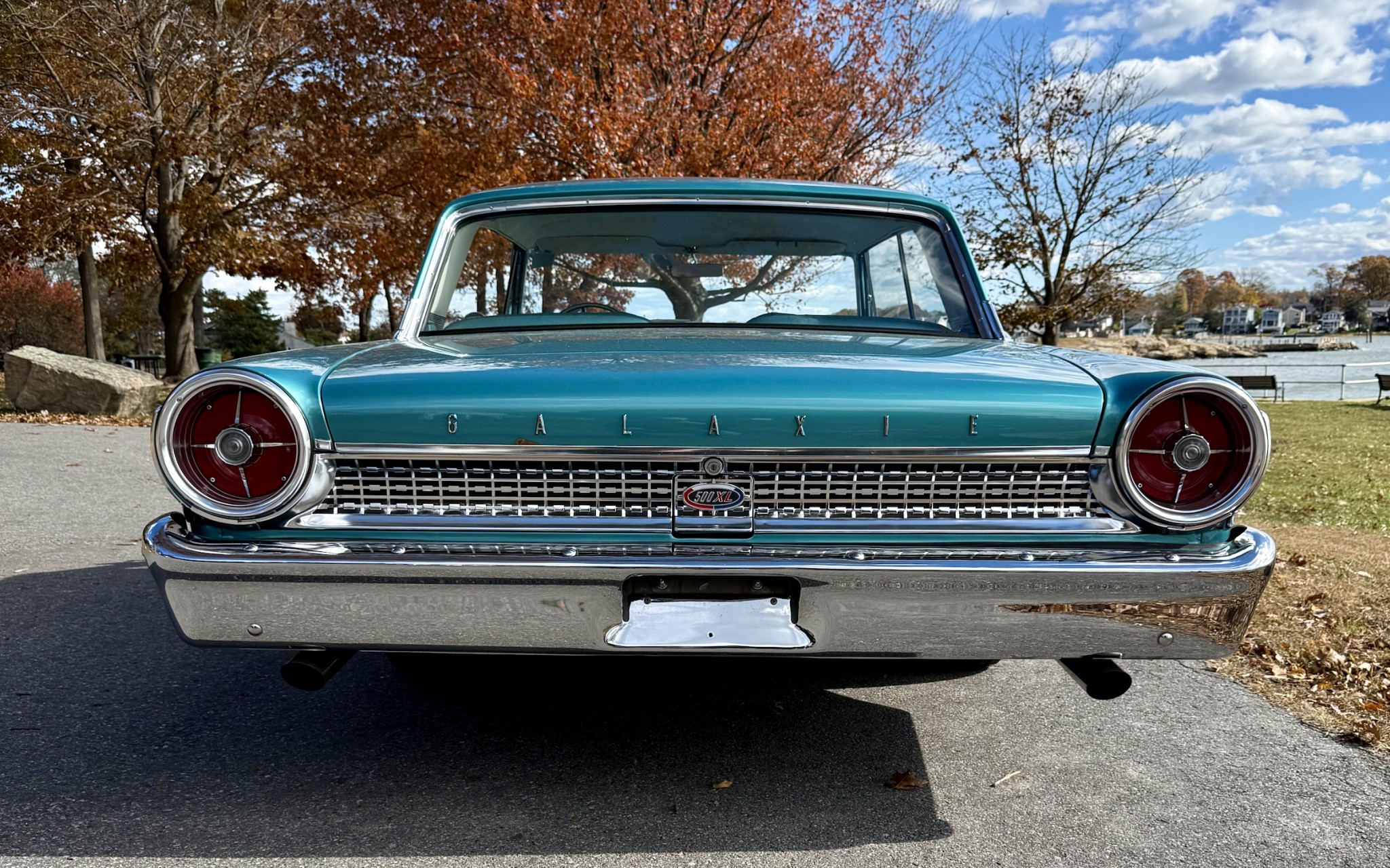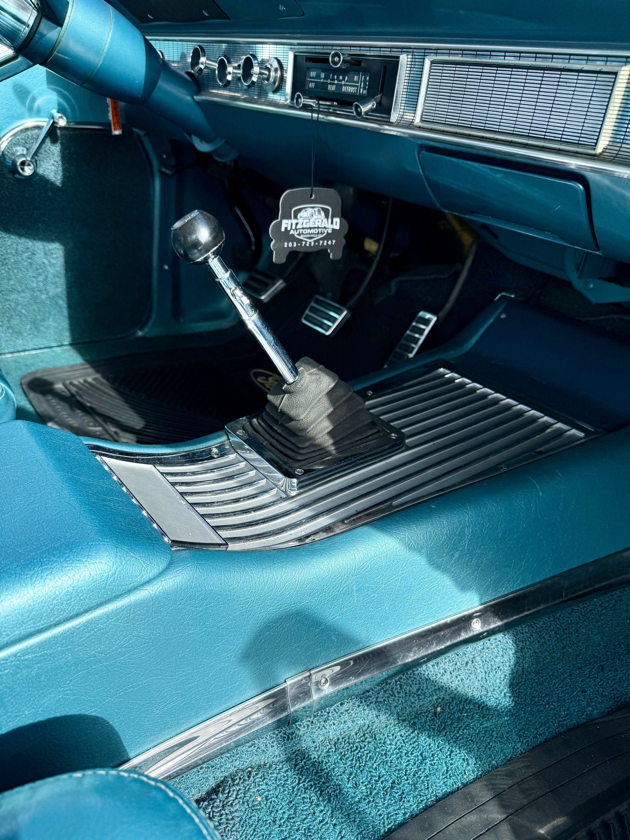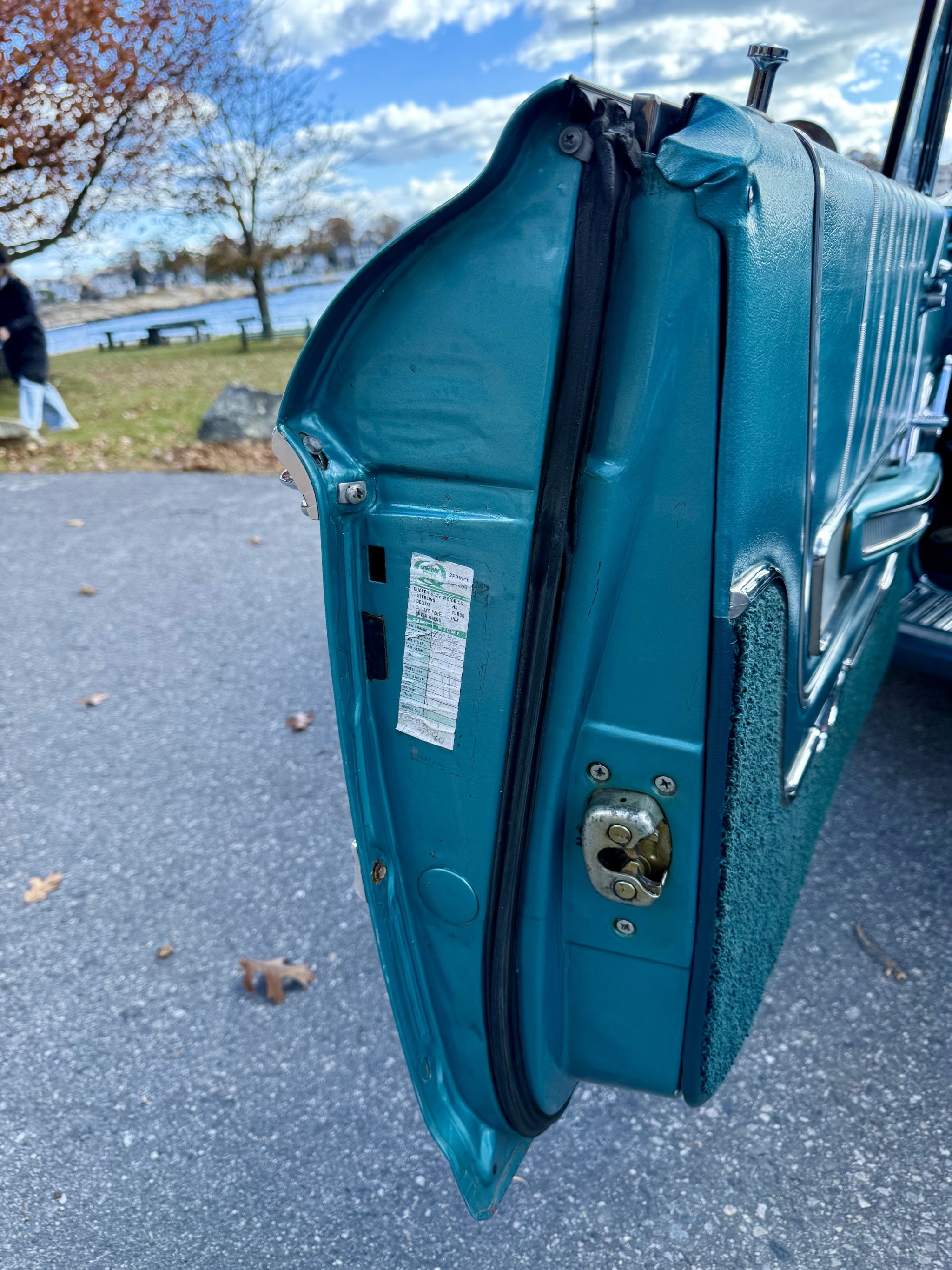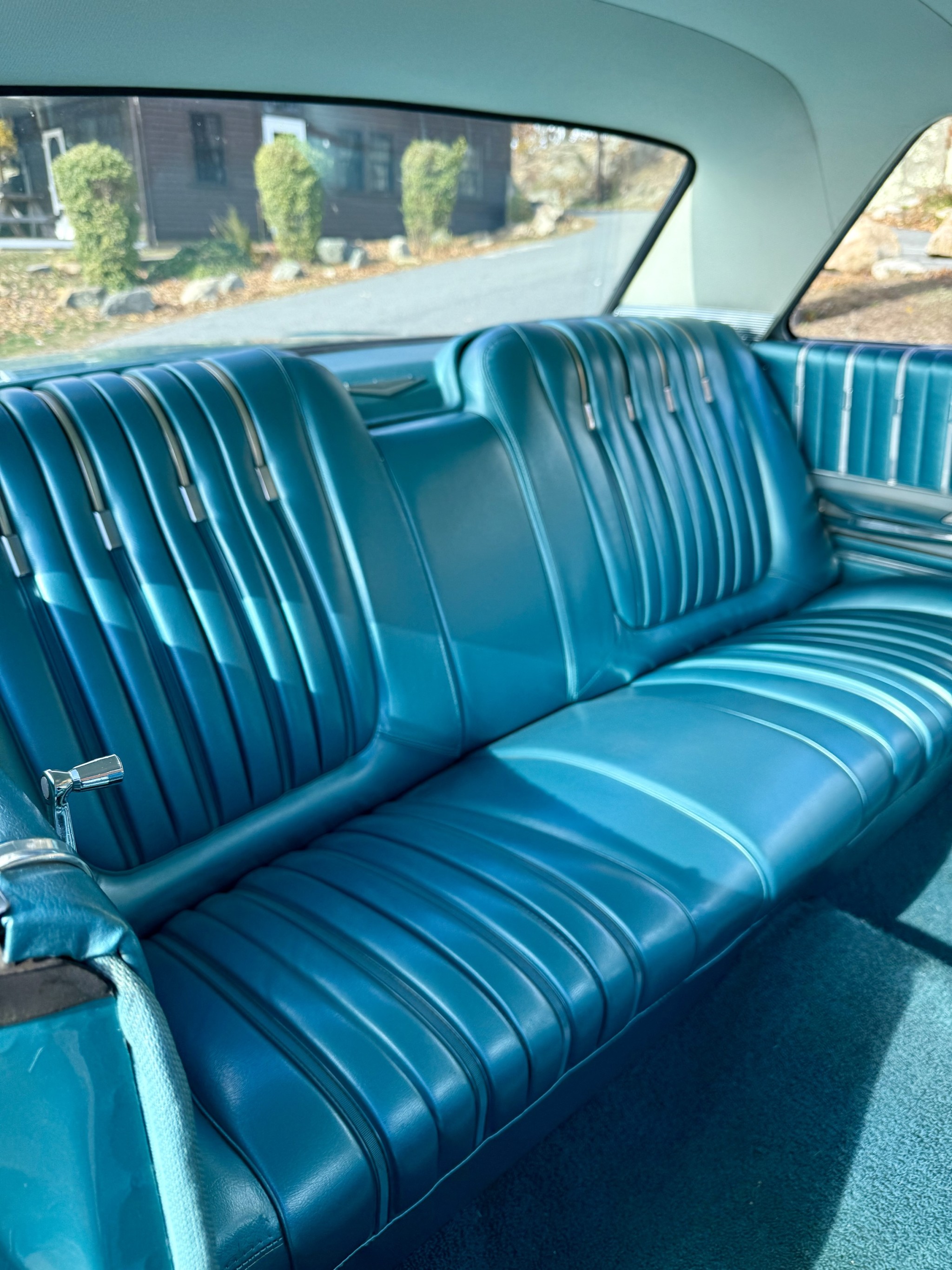 Perhaps more unusual than the two-barrel/four-speed combination is the fact that the original owner didn’t order a radio, so you’ll find a radio-blanking plate that would have been more at home in a Ford 300 than a top-of-the-line Galaxie. The interior trim is code 87 (Light Turquoise), and it’s a dazzling combination with the car’s Ming Green Metallic paint.