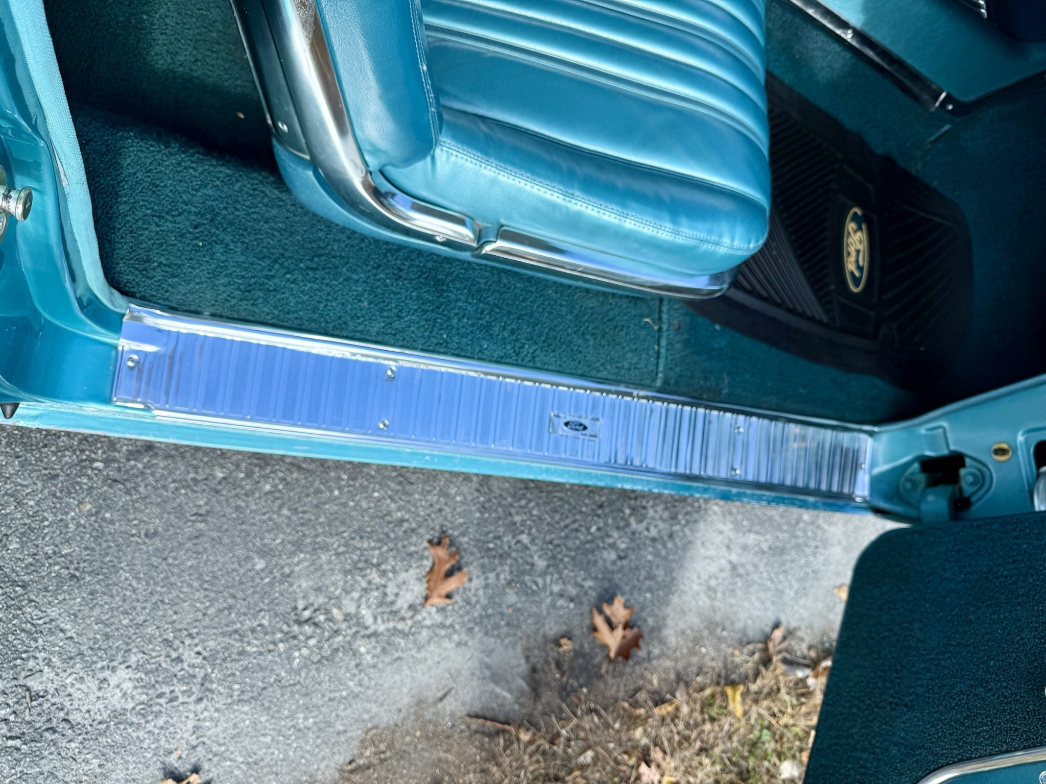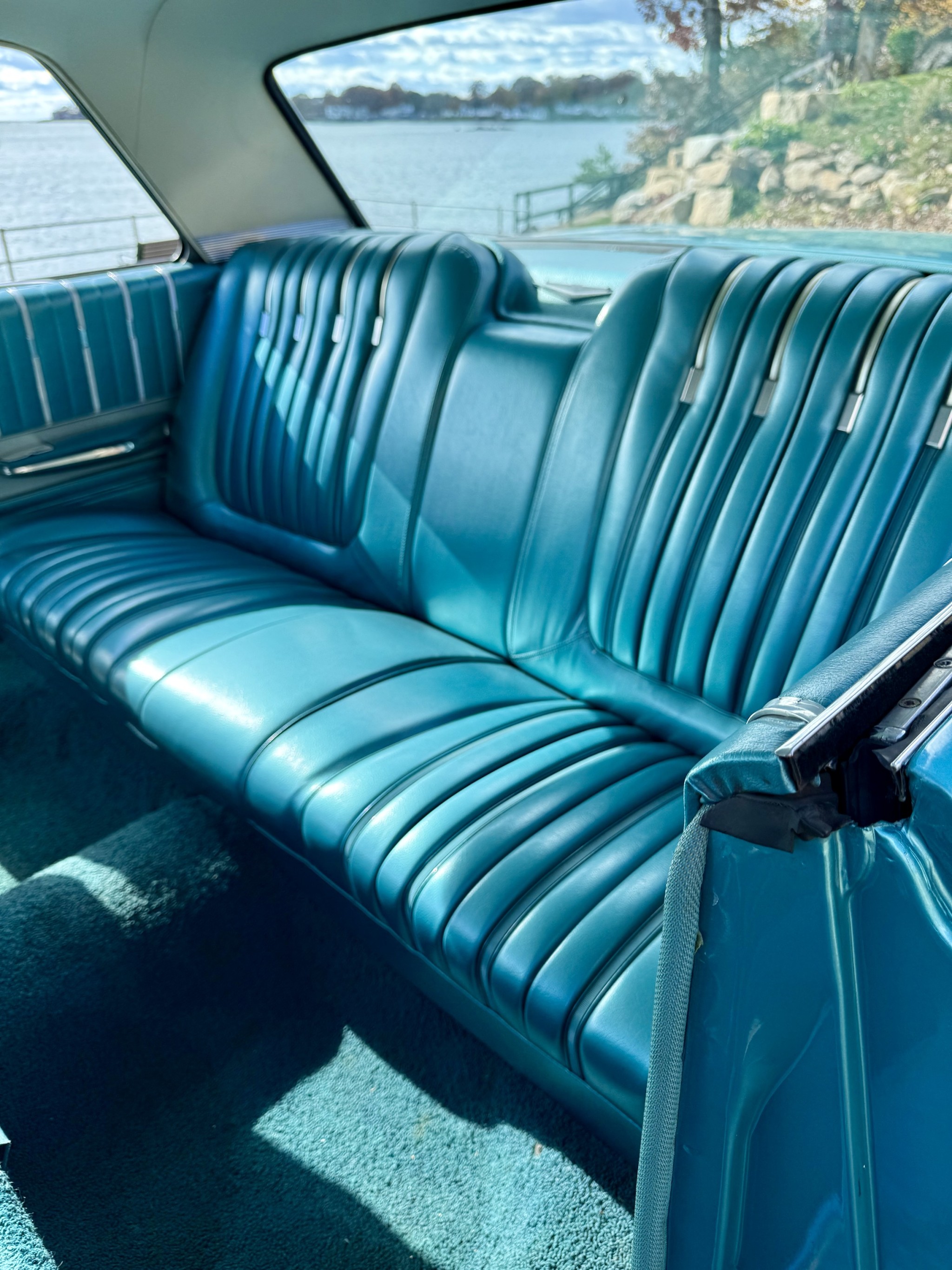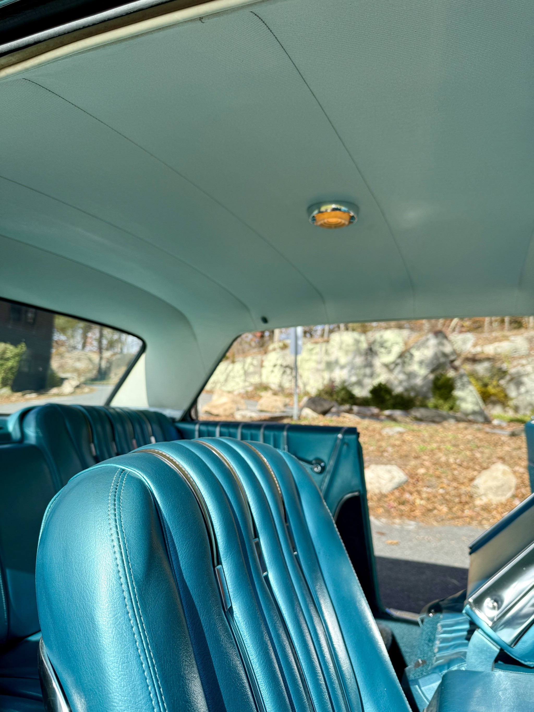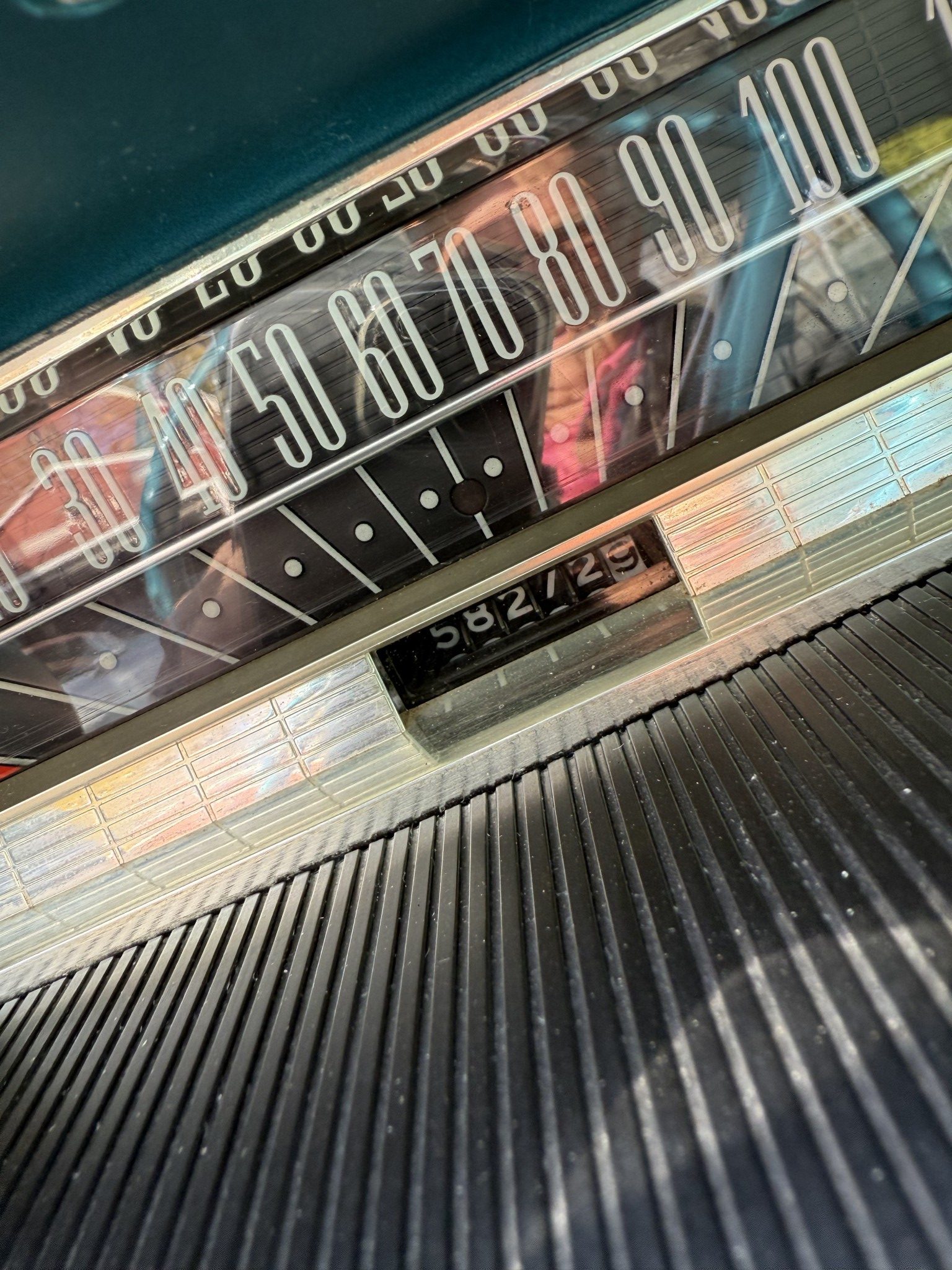 Perhaps more unusual than the two-barrel/four-speed combination is the fact that the original owner didn’t order a radio, so you’ll find a radio-blanking plate that would have been more at home in a Ford 300 than a top-of-the-line Galaxie. The interior trim is code 87 (Light Turquoise), and it’s a dazzling combination with the car’s Ming Green Metallic paint.